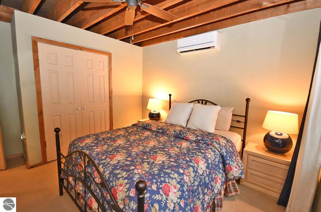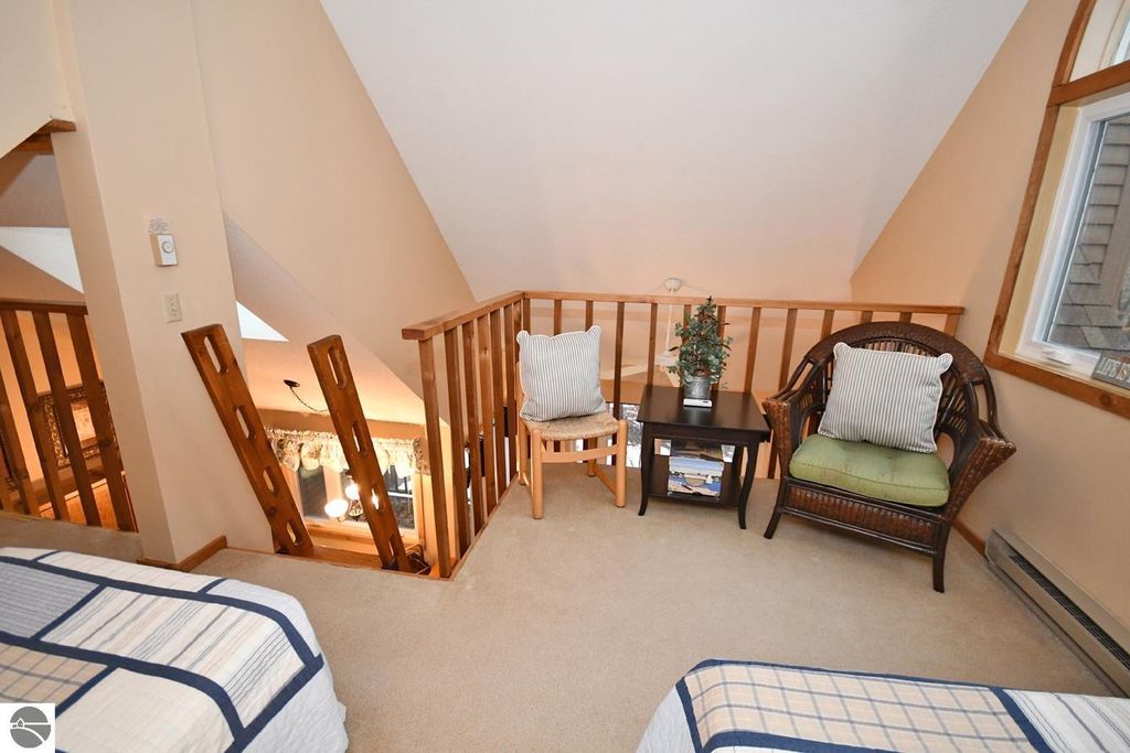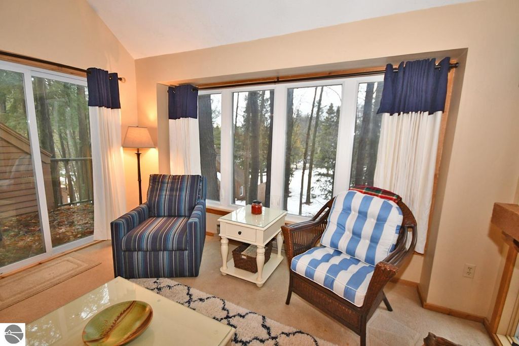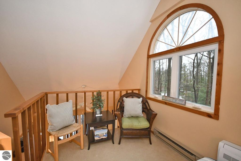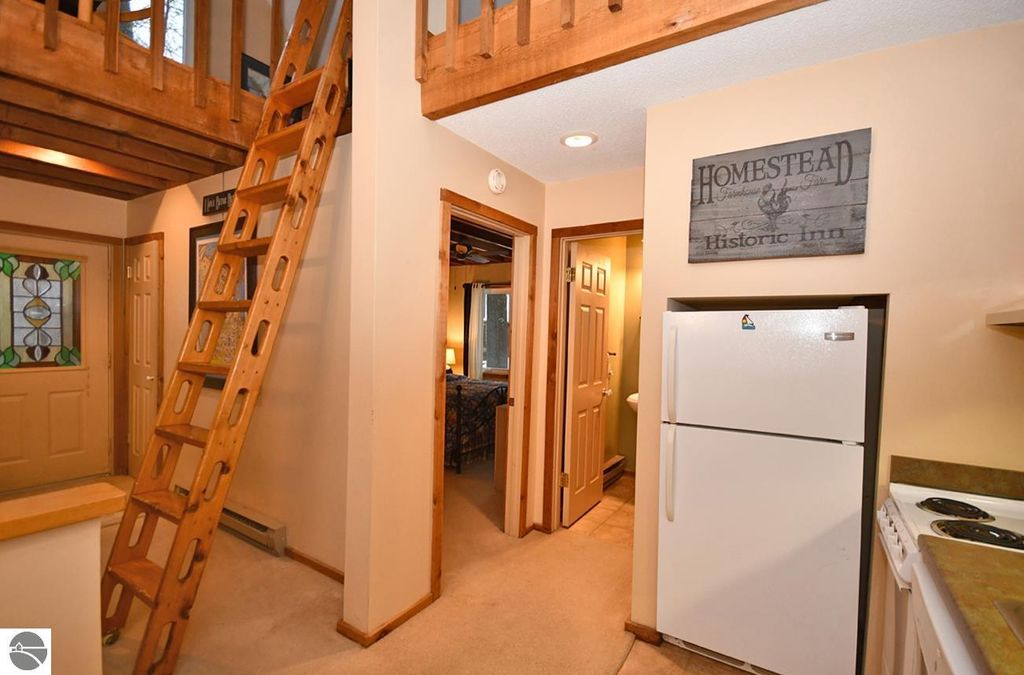 Whole ownership. This charming, cozy, upper level condominium in the hillside of The Homestead is only a 10 minute walk to Lake Michigan and the Crystal River (and also mere steps from the "Village" of the resort, Whisker's outdoor bar, Cavanaugh's convenience store, the ski hills and cross country trails!). This condo has a spacious living room with a vaulted ceiling, a wood burning fireplace, an adjacent outdoor deck, and is open to the kitchen and dining space. The main bedroom is located on the same level, as is the bathroom. Up the installed wood ladder is a lofted bedroom that easily accommodates two twin beds and a sitting area, perfect for kids and teens! This condo is also equipped with heat pumps for heating/cooling (as well as baseboard heat if needed), a full kitchen, and parking directly in front of the building. There's a walking path just steps away which meanders down to the beach in an under 10 minute walk! And, just outside its front door, there's also an owners' storage shed and stocked firewood & fatwood, as well. Sold furnished with few exceptions. *Fantastic rental potential, as this property is within easy distance of the resort's wedding facilities and other amenities*