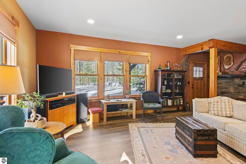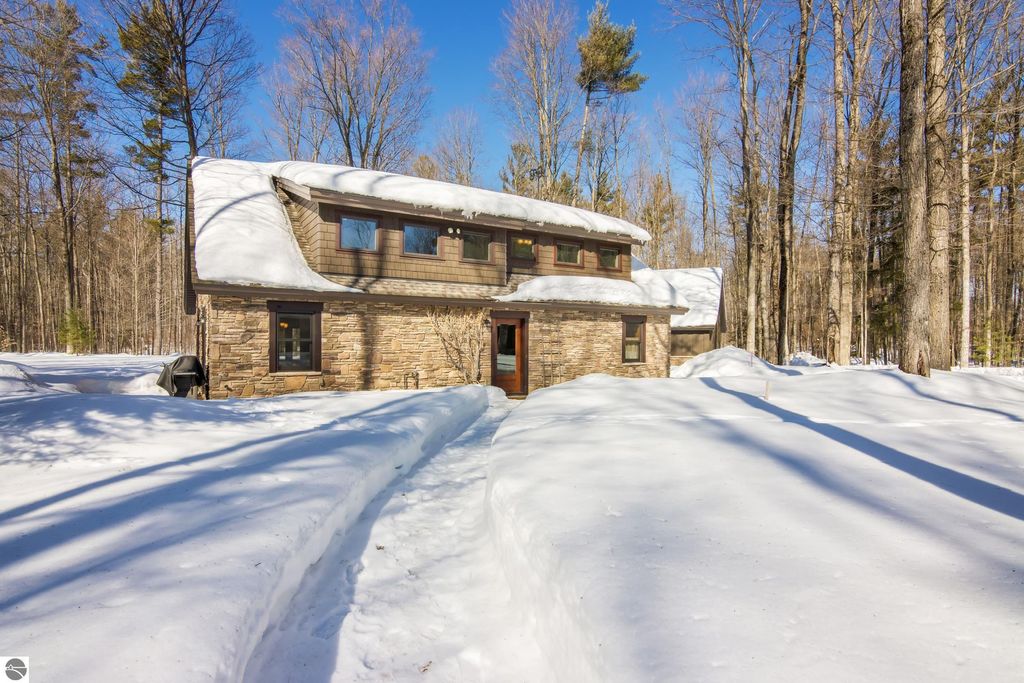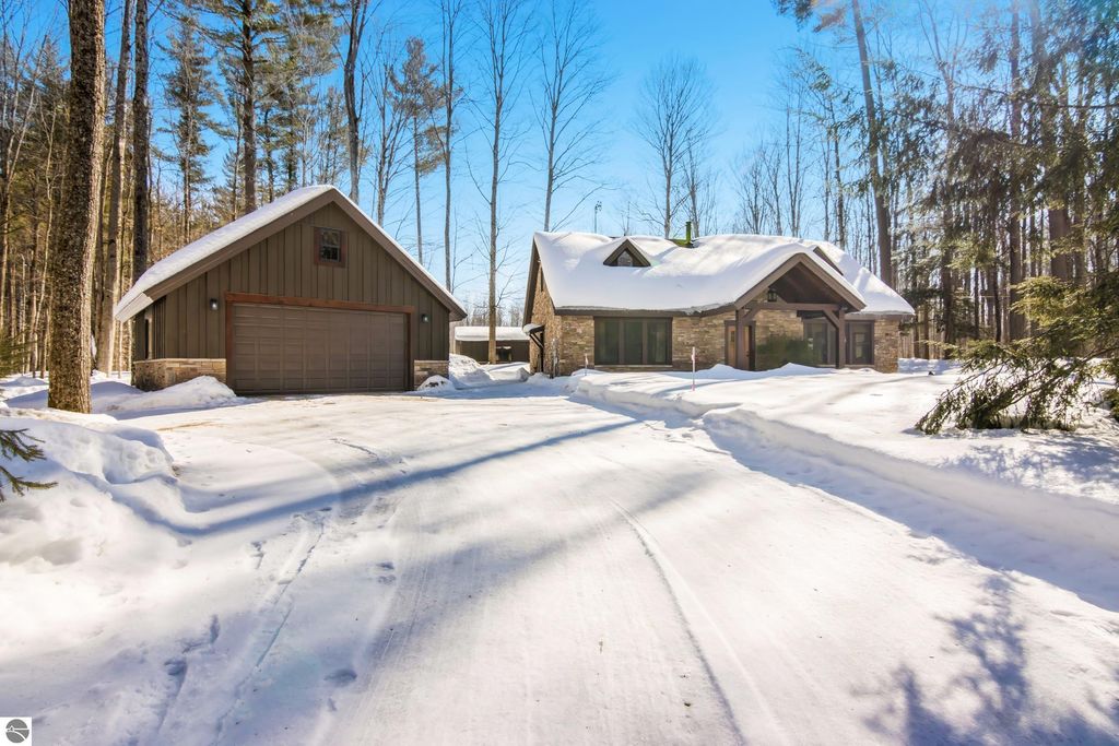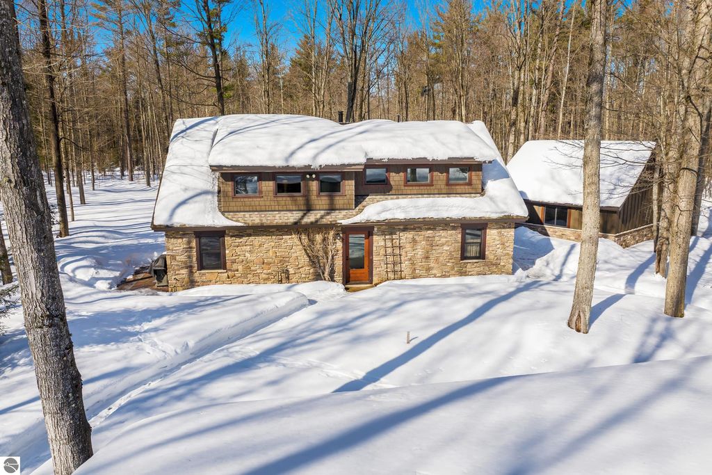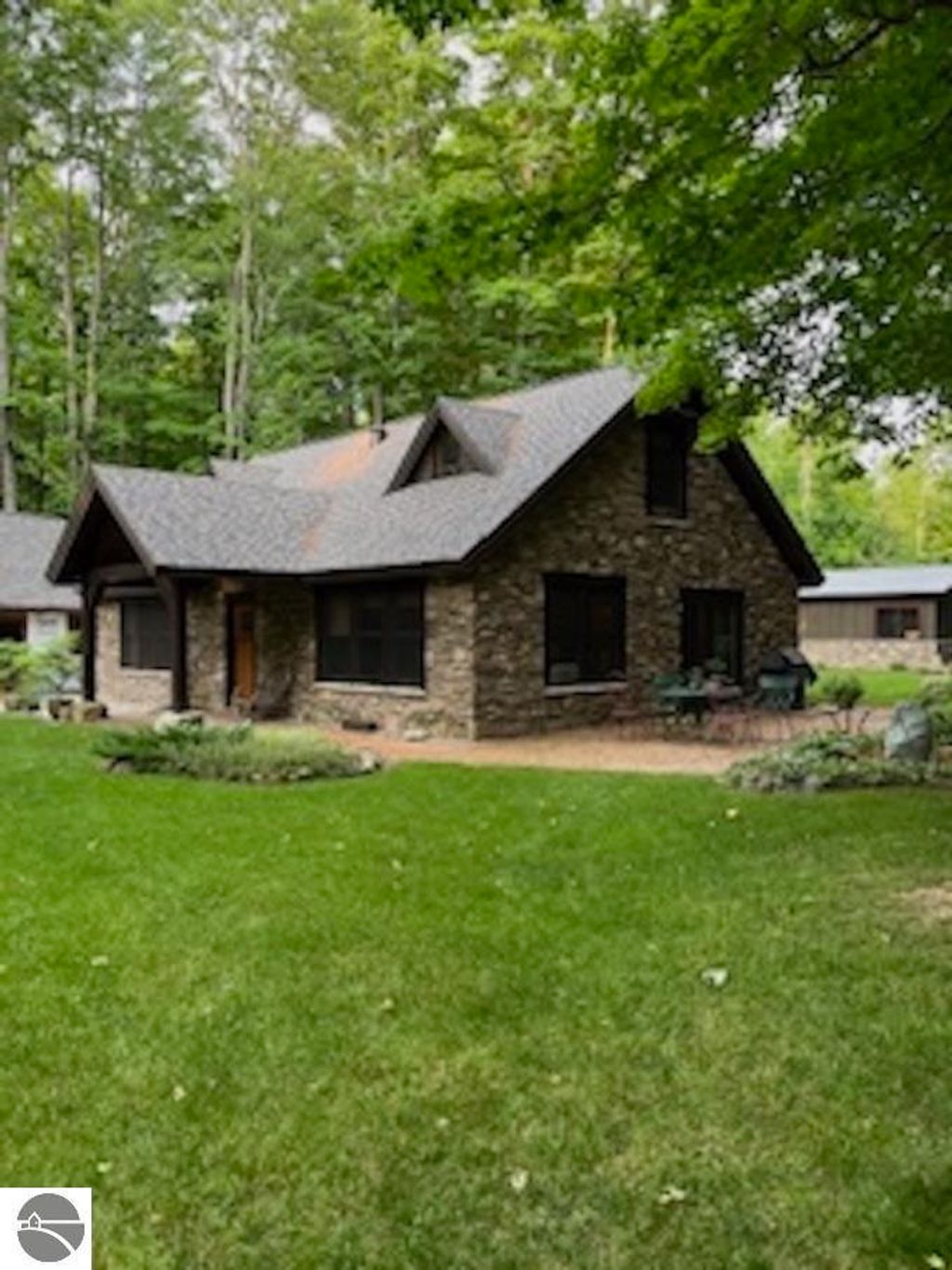 Tucked away in a peaceful wooded setting, this thoughtfully crafted 2 bedroom, 2 bathroom home offers the kind of privacy and quality that is increasingly hard to find. Situated on over five acres and bordered by State Land across the road, the property is surrounded by mature hardwoods and evergreens, creating a quiet and natural backdrop year round. The exterior blends cultured stone with cedar shake dormers, giving the home timeless character and a strong first impression as you arrive. Inside, the open main living space features 8½ foot ceilings and custom cherry cabinetry that immediately reflects the care and craftsmanship poured into the build. Detailed wood trim work carries throughout the home, and radiant in floor heat provides steady, comfortable warmth during the colder months. Marvin alum clad windows with pine interiors bring in natural light while maintaining efficiency and durability. Fiber optic internet has been installed, making remote work seamless. The outbuildings add tremendous versatility. A 24 x 24 detached garage with loft storage provides ample space for vehicles and gear, while the 16 x 24 heated workshop with an attached 16 x 21 garage bay is ideal for projects, hobbies, or additional storage. A separate outbuilding offers flexibility for equipment, recreational vehicles, or future use. The expansive irrigated garden area offers room to grow, expand, or adapt to your needs. A new roof was installed in 2020, adding long term peace of mind. Located just 15 minutes from Torch Lake and approximately 30 minutes to Flintfields Horse Park and Traverse City, this property offers the ideal balance of seclusion and accessibility. This is a setting and home that truly need to be experienced in person to appreciate the craftsmanship, privacy, and potential it provides.