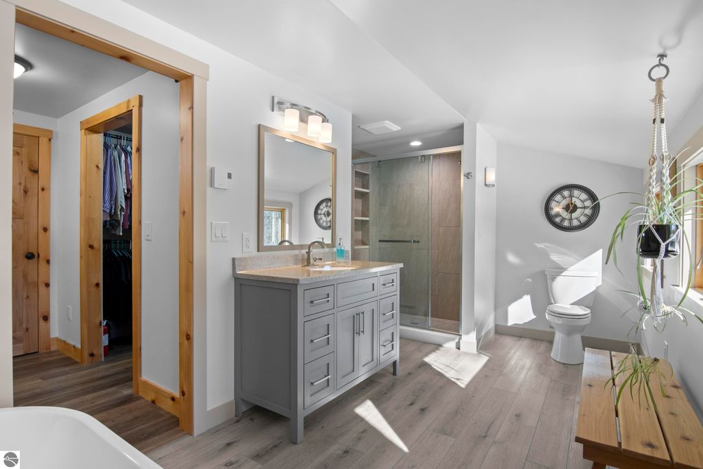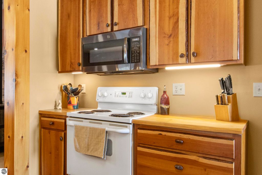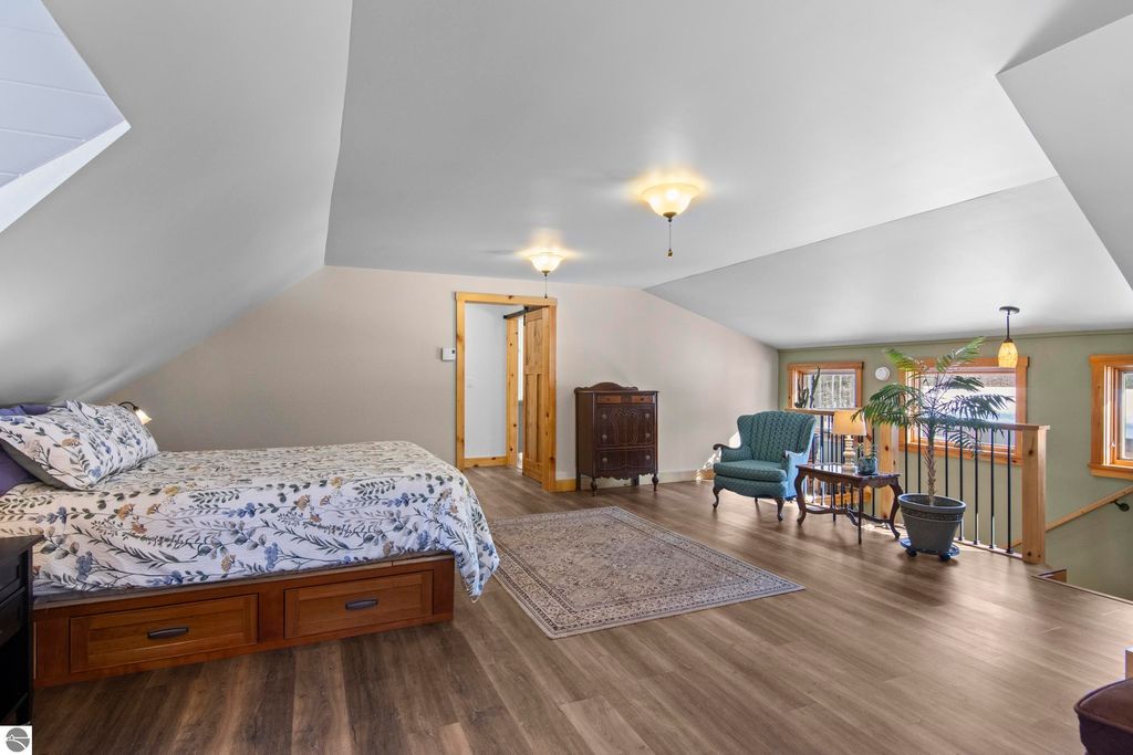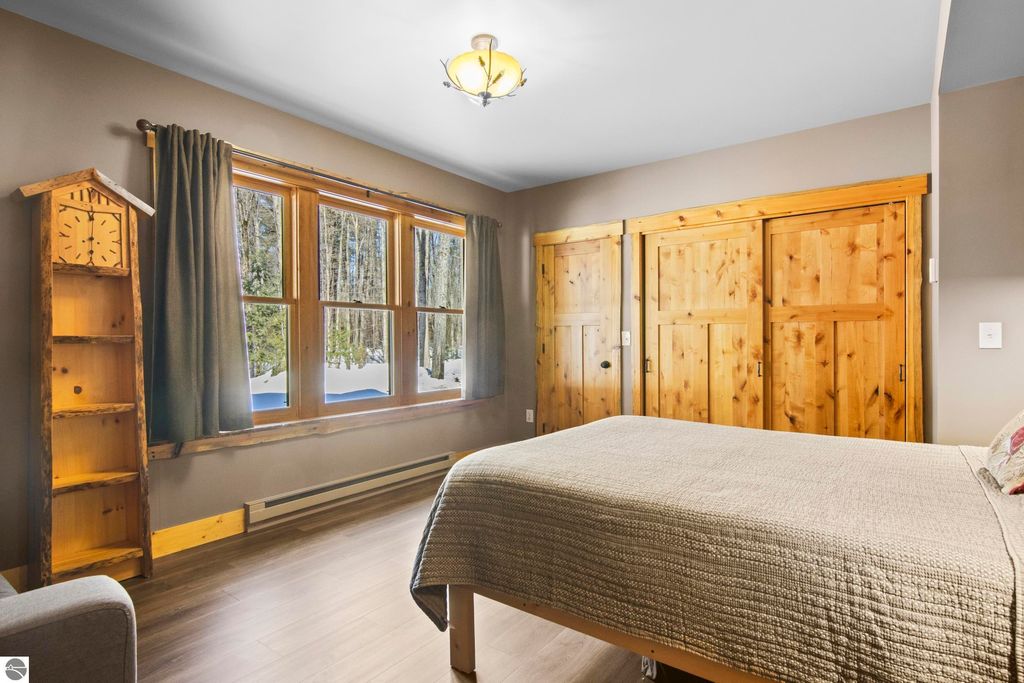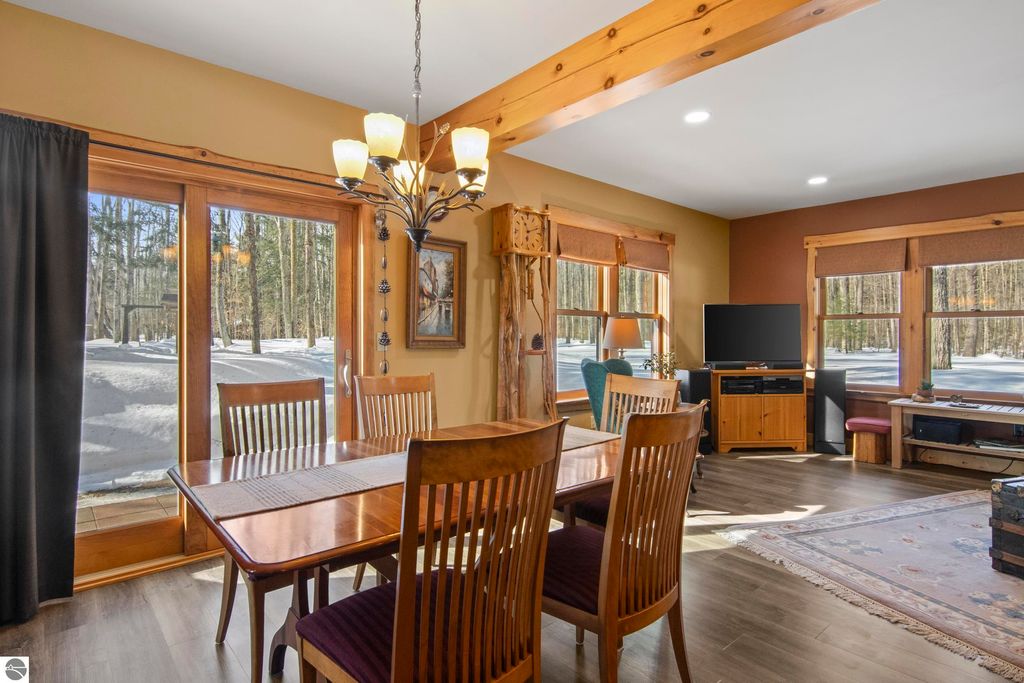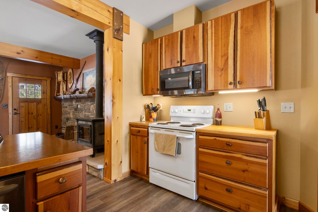 Tucked away in a peaceful wooded setting, this thoughtfully crafted 2 bedroom, 2 bathroom home offers the kind of privacy and quality that is increasingly hard to find. Situated on over five acres and bordered by State Land across the road, the property is surrounded by mature hardwoods and evergreens, creating a quiet and natural backdrop year round. The exterior blends cultured stone with cedar shake dormers, giving the home timeless character and a strong first impression as you arrive. Inside, the open main living space features 8½ foot ceilings and custom cherry cabinetry that immediately reflects the care and craftsmanship poured into the build. Detailed wood trim work carries throughout the home, and radiant in floor heat provides steady, comfortable warmth during the colder months. Marvin alum clad windows with pine interiors bring in natural light while maintaining efficiency and durability. Fiber optic internet has been installed, making remote work seamless. The outbuildings add tremendous versatility. A 24 x 24 detached garage with loft storage provides ample space for vehicles and gear, while the 16 x 24 heated workshop with an attached 16 x 21 garage bay is ideal for projects, hobbies, or additional storage. A separate outbuilding offers flexibility for equipment, recreational vehicles, or future use. The expansive irrigated garden area offers room to grow, expand, or adapt to your needs. A new roof was installed in 2020, adding long term peace of mind. Located just 15 minutes from Torch Lake and approximately 30 minutes to Flintfields Horse Park and Traverse City, this property offers the ideal balance of seclusion and accessibility. This is a setting and home that truly need to be experienced in person to appreciate the craftsmanship, privacy, and potential it provides.