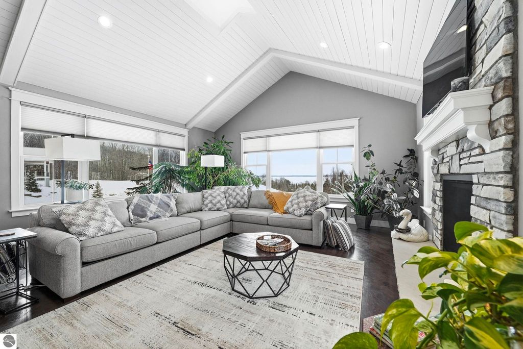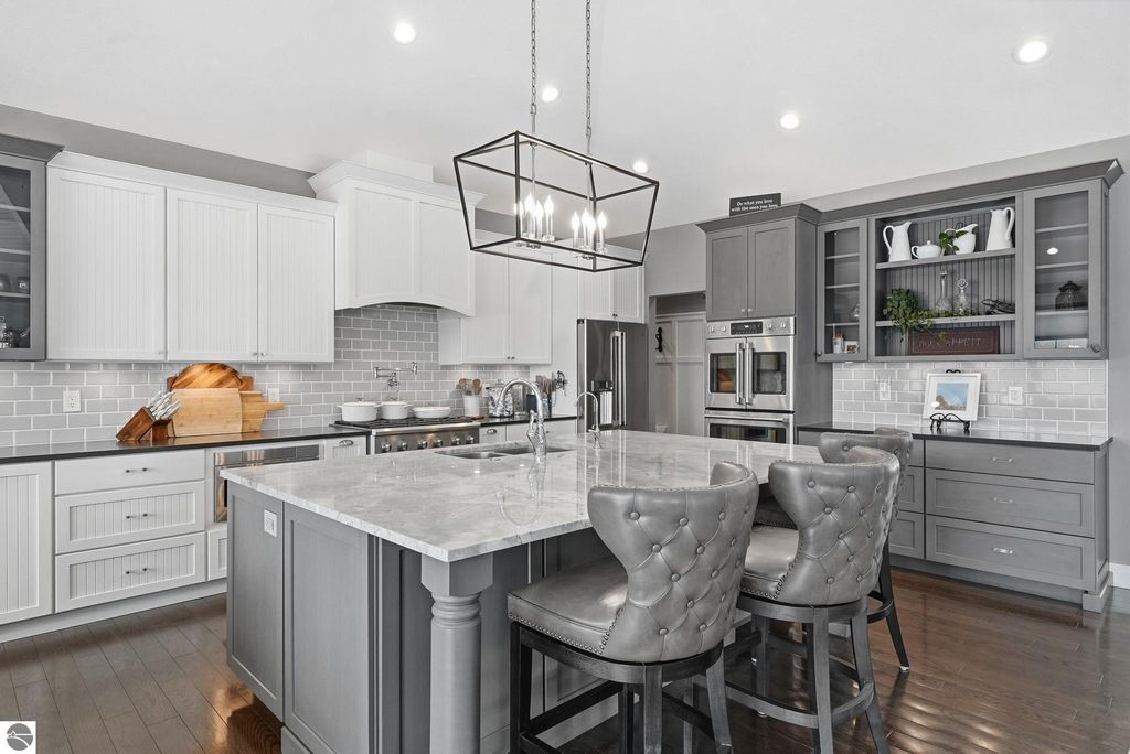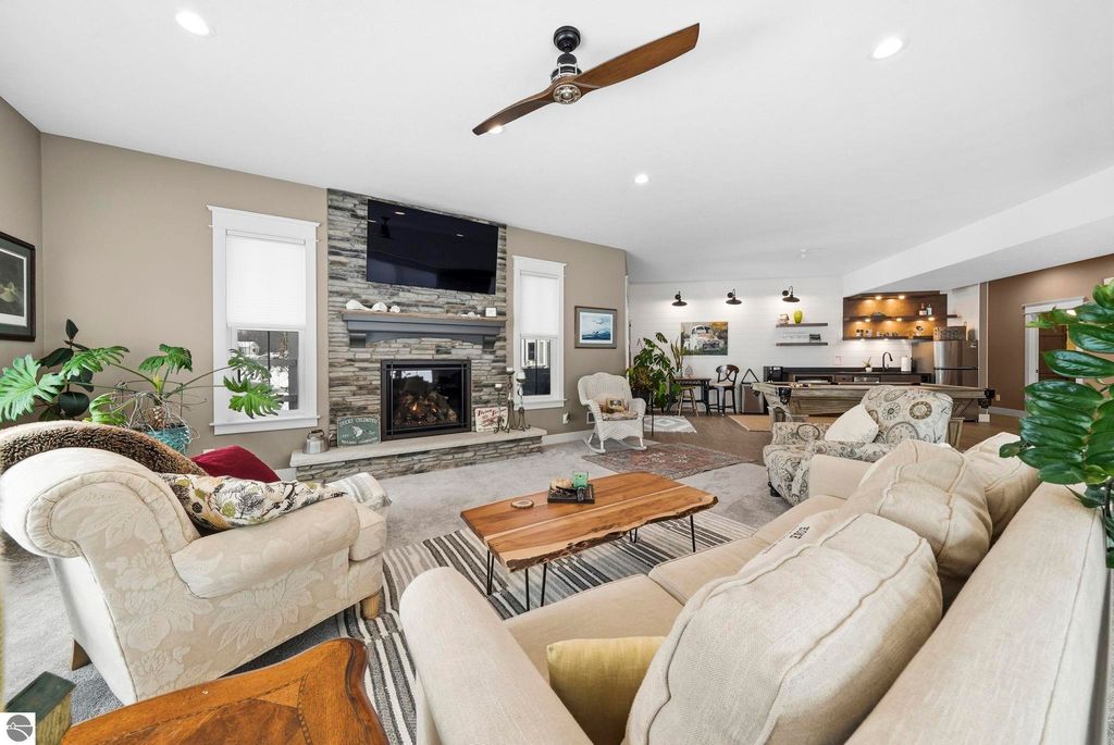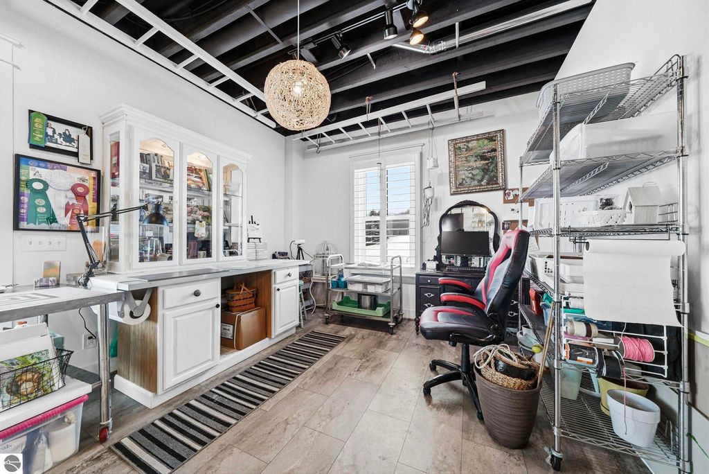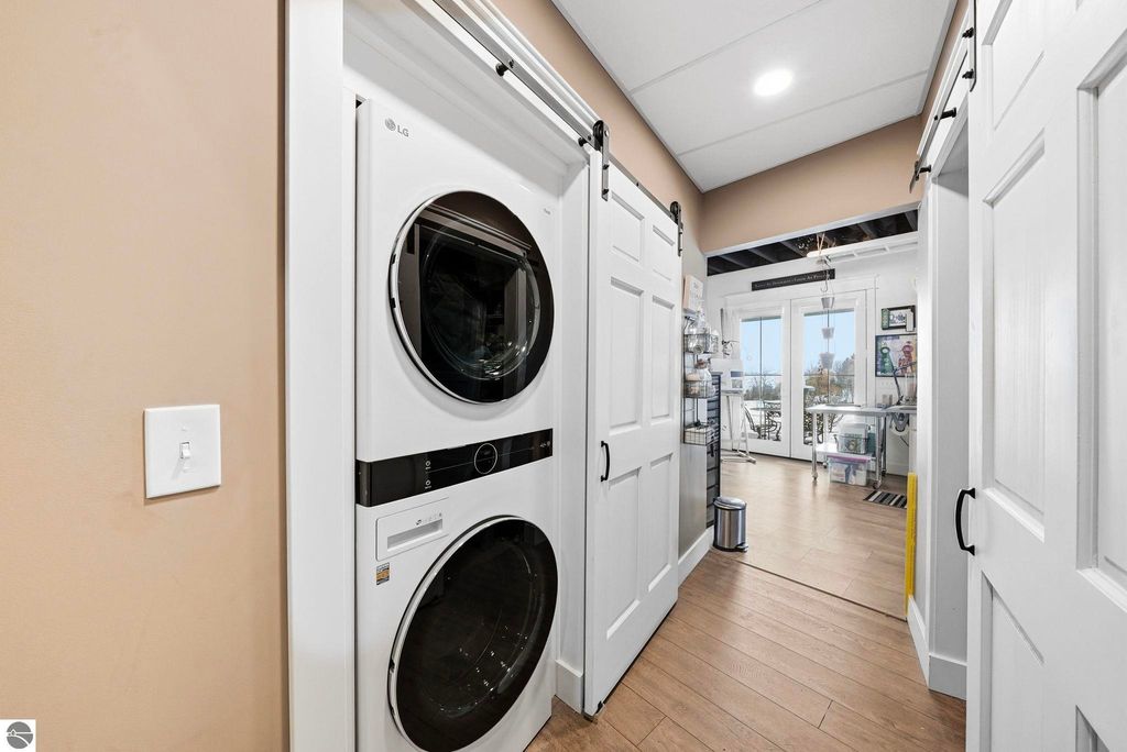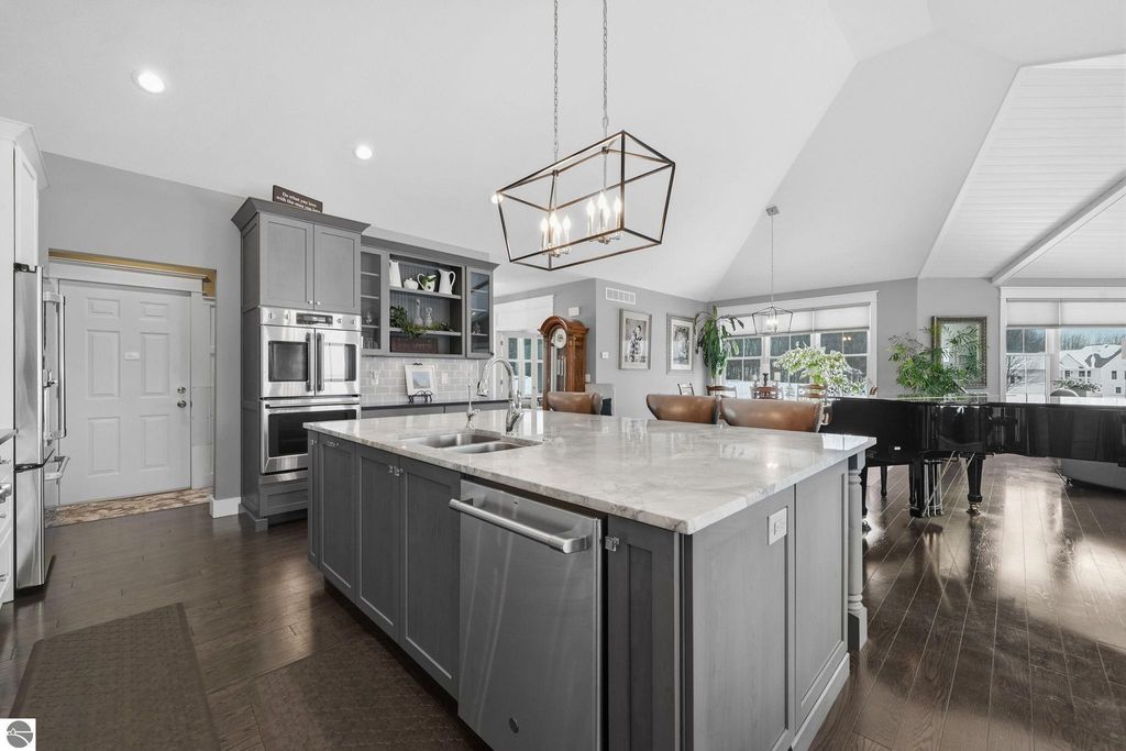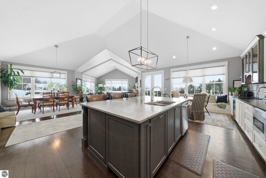 Enjoy peaceful living in beautiful Leelanau County with this thoughtfully designed home overlooking West Bay. Large windows throughout the home bring in tons of natural light and capture the stunning water views, while hardwood floors and granite countertops add quality and style. The main living area offers an open, comfortable layout perfect for everyday living or entertaining. A charming cupola adds character and enhances the bright, airy feel of the home. The finished lower level includes a second living area and full kitchen, making it ideal for guests, extended family, or multi-generational living. You'll also appreciate the dog wash station, two laundry rooms (one on each level), art room (accessory room) and plenty of storage throughout. Upstairs, a versatile bonus room provides the perfect space for a home office, gym, studio, or media room. Don't miss the beach access on the other side of M22! If you're looking for a Leelanau County home with West Bay views, flexible living space, and Northern Michigan charm, this property offers a rare opportunity in an incredible setting.