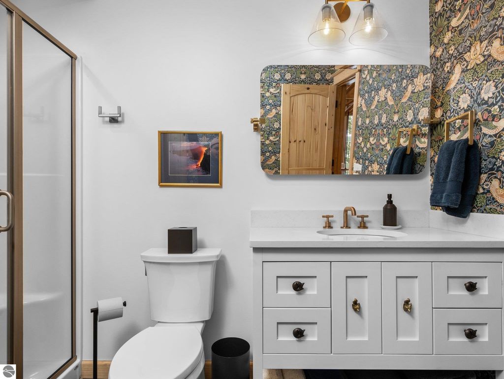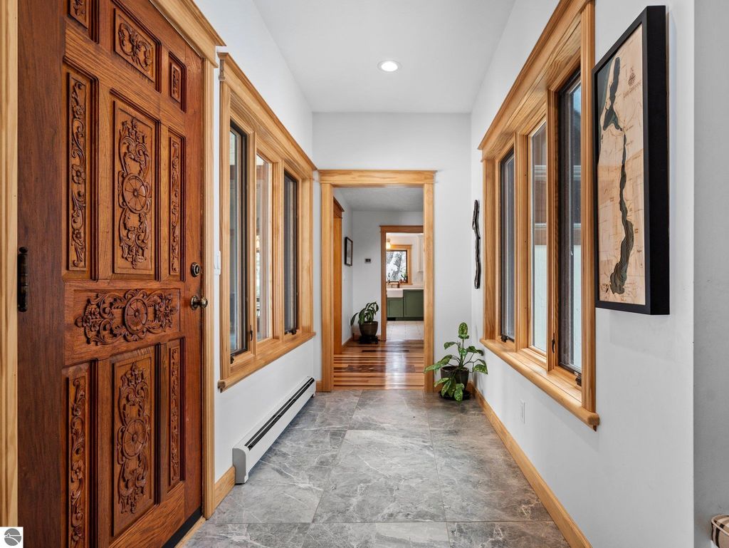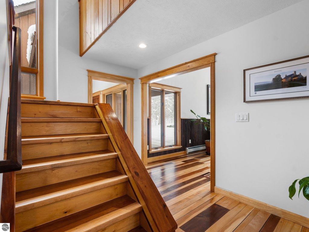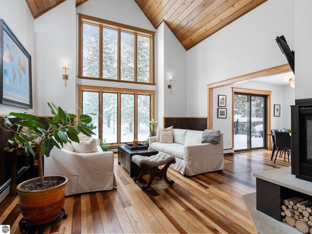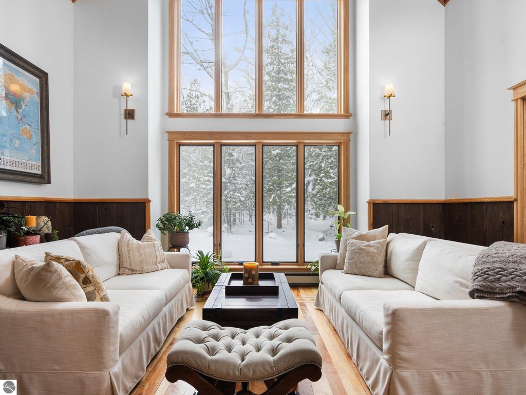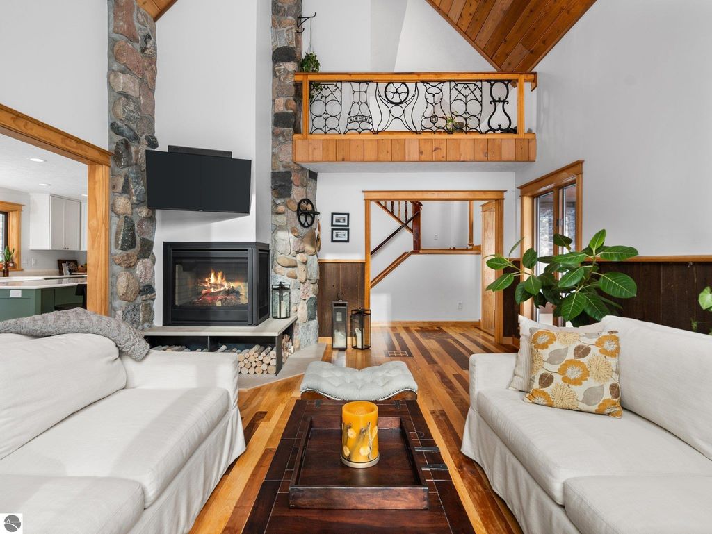 Experience the best of Leelanau living with this extraordinary 107-acre property featuring 500 feet of private frontage on the crystal-clear waters of Lake Leelanau. Rolling hills, ridge-line lake views, open meadows, hardwoods, evergreens, and farmland make this a truly one-of-a-kind offering just 15 minutes from downtown Traverse City. The landscape naturally lends itself to year-round outdoor adventure. In the winter months, the property transforms into a private retreat for sledding on your own hill, cross-country skiing and snowshoeing along established trails, and exploring by snowmobile. Ice fishing on the frozen lake becomes a favorite way to gather and take in the quiet beauty of the season. When the snow melts, the same rolling terrain and open spaces offer endless opportunities to hike, explore, and enjoy lakeside living at its finest. The 4-bed, 2.5-bath main residence beautifully blends classic up north charm with modern updates, featuring vaulted wood ceilings, inlaid wood floors, and a stone fireplace. Both the home and property were thoughtfully renovated in 2022, offering a fresh, move-in-ready experience. A Generac generator provides added peace of mind for comfortable year-round living. Evenings here are especially magical, with stunning sunsets that paint the sky over the lake, easily enjoyed from multiple vantage points across the property. For additional living space, a separate 1-bed, 1-bath chalet offers updated interiors and a four-car garage underneath, ideal for guests, a private retreat, or potential rental use. Additional structures include a 30x50 pole building for storage and two waterfront cabins, perfect as bunkhouses or convenient lakeside gear storage. With 3,700 feet of frontage along East Birch Point Road, a private dock, and a firepit for lakeside gatherings, this rare Leelanau County property offers an exceptional blend of beauty, privacy, versatility, and outdoor living in every season.