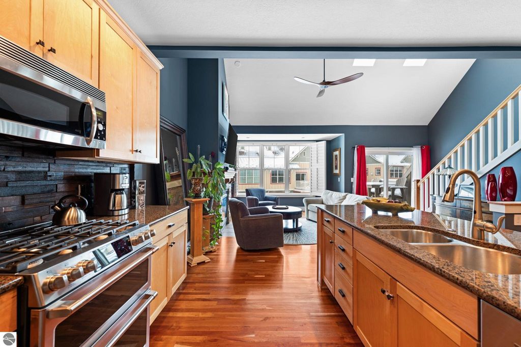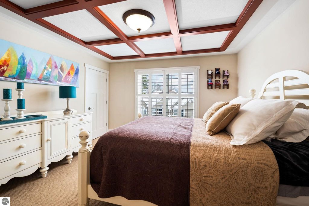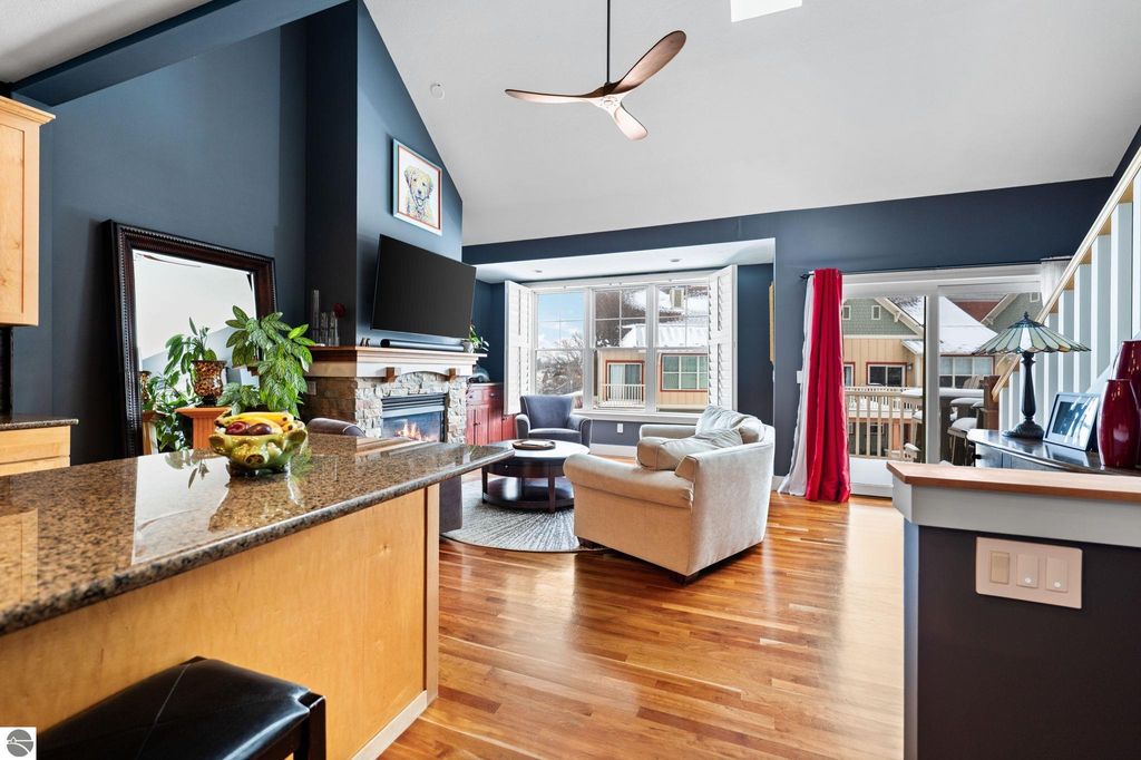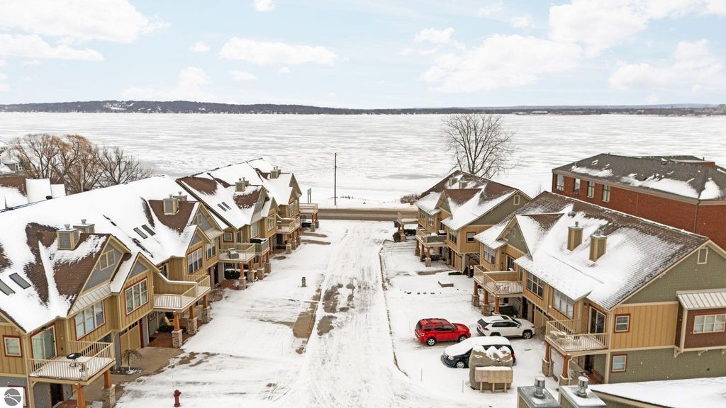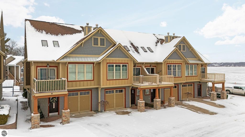 Welcome to this beautifully appointed 3 bedroom, 3 full bath condo offering views of West Bay and an unbeatable location. Situated directly across from West Bay and just steps from the TART Trail behind the development, you can enjoy biking or walking to downtown Traverse City, Suttons Bay, and surrounding areas. Step inside to a freshly painted interior. The main level features a comfortable bedroom and full bath, perfect for guests or flexible living. The attached garage showcases epoxy floors and is currently set up as a stylish man cave, yet easily converts back to traditional garage space. Upstairs, the open concept living area is filled with natural light and features hardwood floors, a stunning floor to ceiling gas fireplace, and views of West Bay. The beautifully designed kitchen offers granite countertops, quality cabinetry, and an inviting layout ideal for entertaining. A sliding door leads to the balcony where you can relax and take in the bay views. This level also includes an additional spacious bedroom and full bath. The upper loft level provides versatile space for a home office or additional lounge area. The primary suite offers a walk in closet, spacious private bath, and a designated laundry room for added convenience. Shaker shutters in the primary bedroom and living room add a refined finishing touch. Enjoy low maintenance living in an exceptional location with water views, trail access, and proximity to everything Northern Michigan has to offer.