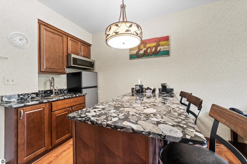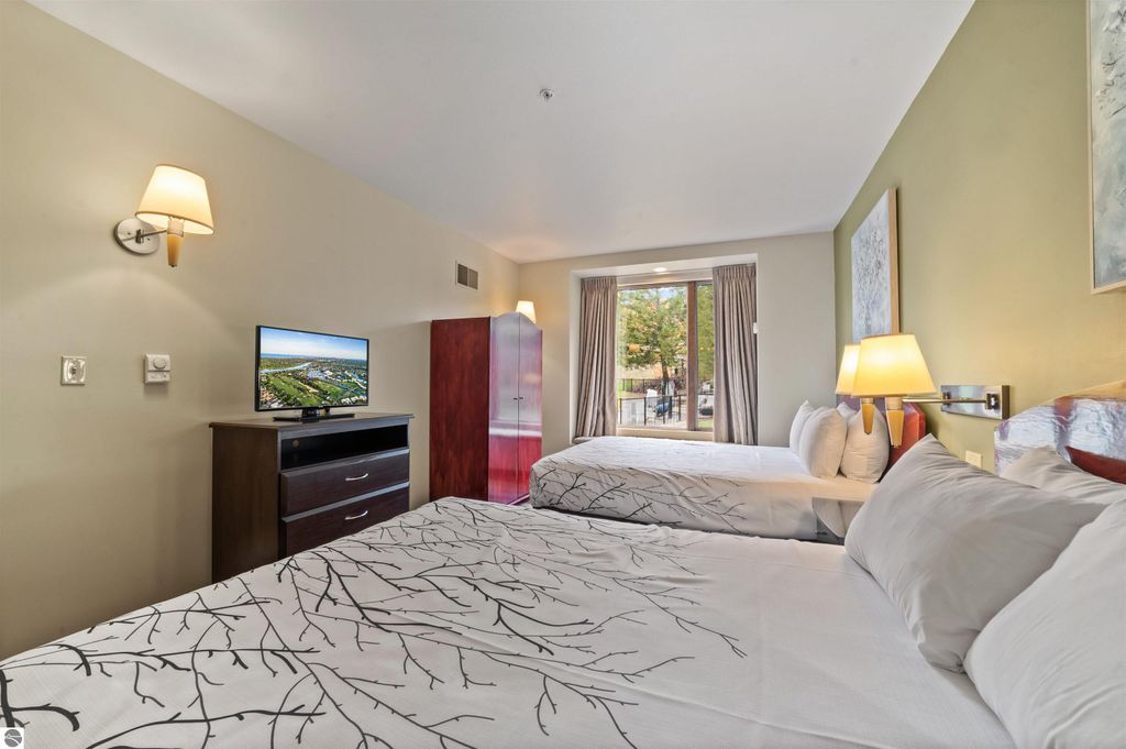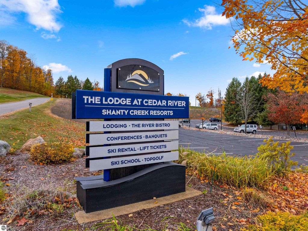 Beautifully remodeled one-bedroom, one-bath ground-floor condominium is ready for the next owner. This unit features private exterior access to the outdoor pool and two hot tubs, providing easy enjoyment of resort style amenities. Located within Shanty Creek Resorts, the condo sits adjacent to the Cedar River Golf Course designed by Tom Weiskopf. The pro shop and ski lift ticket check-in are located on the same level, offering convenient access to seasonal activities. One floor above, the River Bistro provides dining, pool tables, and a golf simulator. The unit is being sold fully furnished, allowing for immediate use. Association dues cover heat, electricity, cable, internet/Wi-Fi, water, and sewer for simplified ownership. While not in personal use, the property may be placed in the resort rental program. The unit has a strong rental history, offering potential income opportunity. The location also provides close proximity to the Chain of Lakes and access to a shuttle to downtown Bellaire, home to Short's Brewing Company, local restaurants, shops, and a movie theater. Whether used as a personal getaway or investment property, this turnkey condo offers convenient access to golf, skiing, dining, and Northern Michigan recreation.
