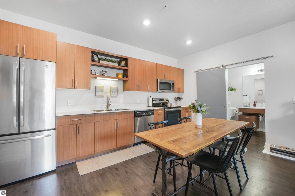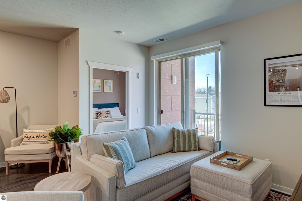 Turn key, furnished, revenue generating condo! Perfect for an investor or someone looking for a ready to go primary or secondary home! This condo is on the second floor of Trailside 45, a complex in downtown Traverse City where short term rentals are allowed. The building sits directly on The TART trail and offers locked bike rooms on every floor for owner or guest use. The HOA is also pet friendly, allowing for the option to increase revenues with a pet friendly rental. The building has an elevator and widened halls. It also has a common room on the 4th floor. Perfect for large groups needed to work or gather. The condo has in unit washer and dryer, a bathroom off of every bedroom, large walk in closets and a private balcony. The building is a short five minute pedal from Front Street, multiple beaches, marinas and Bay front parks, the Civic Center, The Filling Station Microbrewery, Elev8 Climbing Gym, three bike shops, Silver Spruce Brewing Company, and so many more of downtown TC's award-winning offerings!