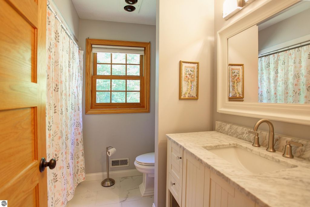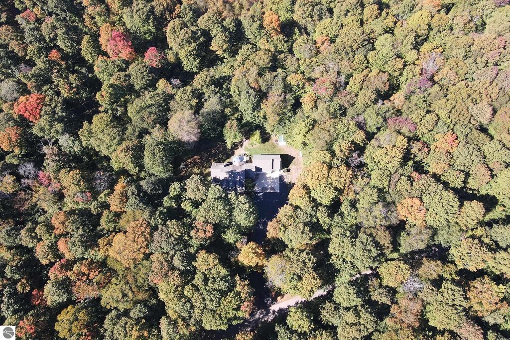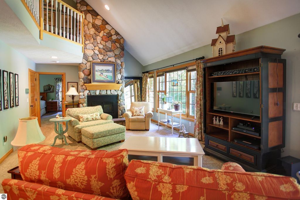 Nestled in a quiet clearing surrounded by towering mature hardwoods on nearly 5 acres, this stately 4-5 bedroom home offers an abundance of space, charm, and amenities. A spacious covered front porch greets you and welcomes you to relax for a while. The foyer entrance hosts a den and half bath on one side and a formal dining room on the other, and then opens to a living room under cathedral ceilings anchored by a stone gas fireplace. A haven of relaxation, the primary suite boasts a private bath and generous walk-in closet. You'll find two more bedrooms, a shared-entry full bath, and a small reading nook in the upper level. Truly the heart of the home, the chef's kitchen is a wonderful space to create, with a large ceramic topped island, pantry, and plenty of cabinet/counter space. The walkout level is finished with a large family room, bedroom and 3/4 bath. Enjoy private open-air dining on the large back deck overlooking the beautifully wooded acreage. There's plenty of space for parking and/or a workshop in the 3-car attached garage. Additional highlights include a new roof in 2025, central air, and hardwood floors. All this is 10 minutes to the west side of downtown Traverse City!
