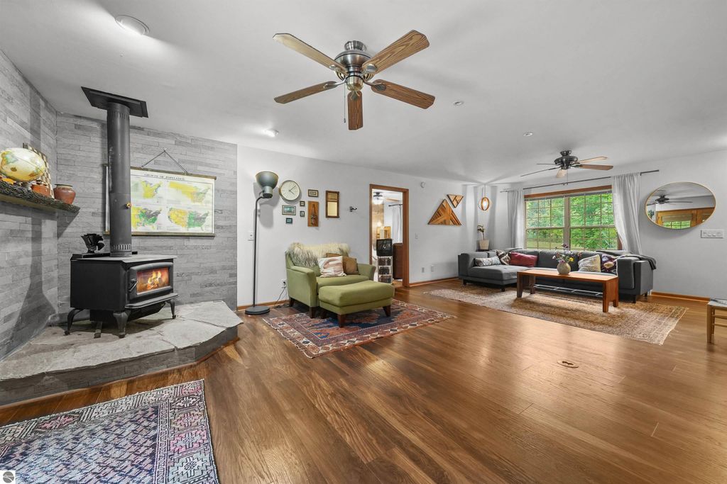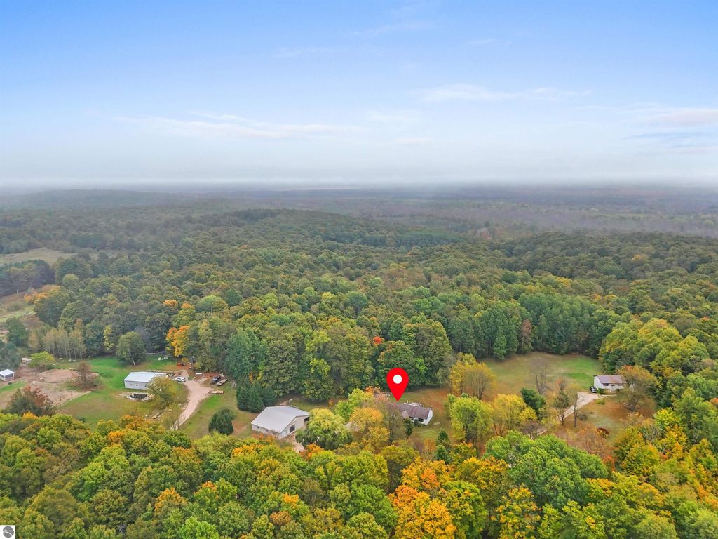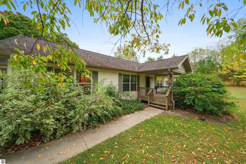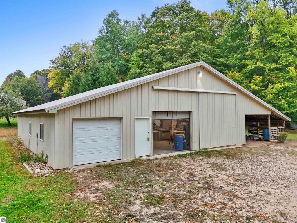 Beautifully updated 3BR/2BA ranch-style home on 10 private acres, located just a short drive from Crystal Mountain, Traverse City, Manistee, Frankfort, and Sleeping Bear Dunes. This 2,056 sq ft home features an open-concept layout, modern finishes, woodstove on flagstone hearth, and a spacious primary suite with custom tile shower. Attached oversized 2-car garage provides ample storage. A 48'x68' pole building with workshop offers endless possibilities for hobbies, business use, or storage. Enjoy 9 wooded acres with trails for walking, skiing, or snowshoeing. A hunting blind overlooks a food plot, and fenced garden areas are ideal for growing your own produce. Outdoor enthusiast's dream!