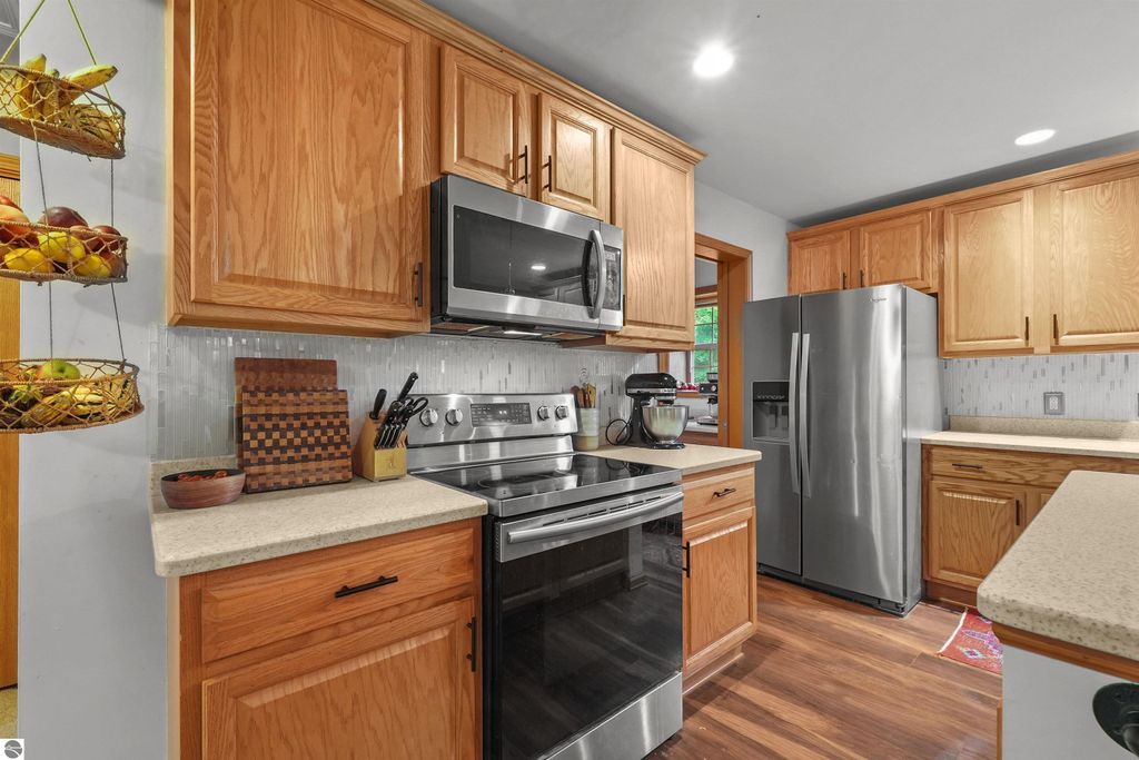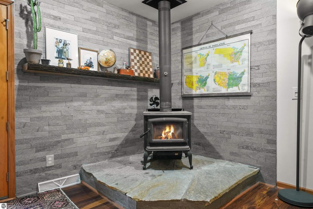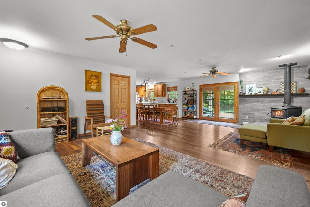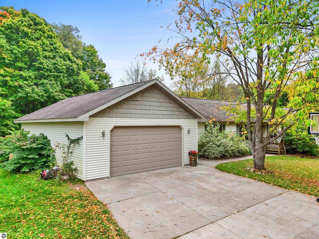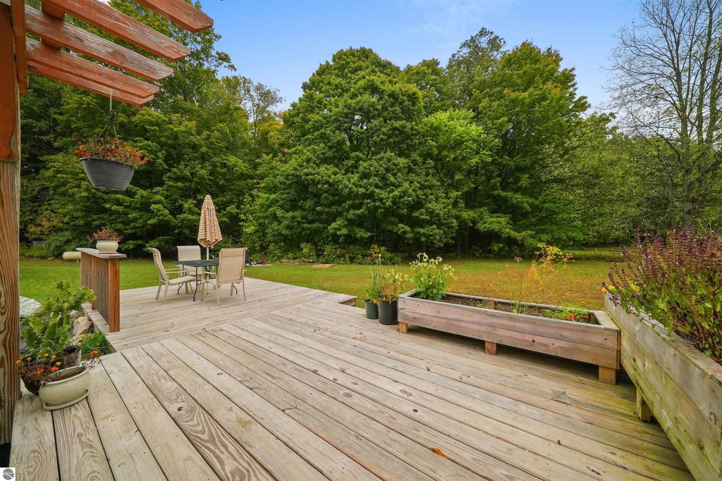 Beautifully updated 3BR/2BA ranch-style home on 10 private acres, located just a short drive from Crystal Mountain, Traverse City, Manistee, Frankfort, and Sleeping Bear Dunes. This 2,056 sq ft home features an open-concept layout, modern finishes, woodstove on flagstone hearth, and a spacious primary suite with custom tile shower. Attached oversized 2-car garage provides ample storage. A 48'x68' pole building with workshop offers endless possibilities for hobbies, business use, or storage. Enjoy 9 wooded acres with trails for walking, skiing, or snowshoeing. A hunting blind overlooks a food plot, and fenced garden areas are ideal for growing your own produce. Outdoor enthusiast's dream!
