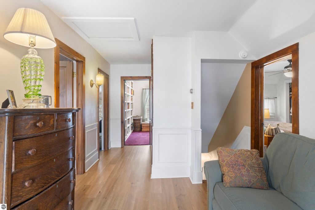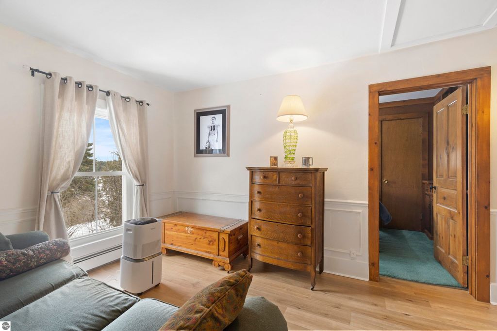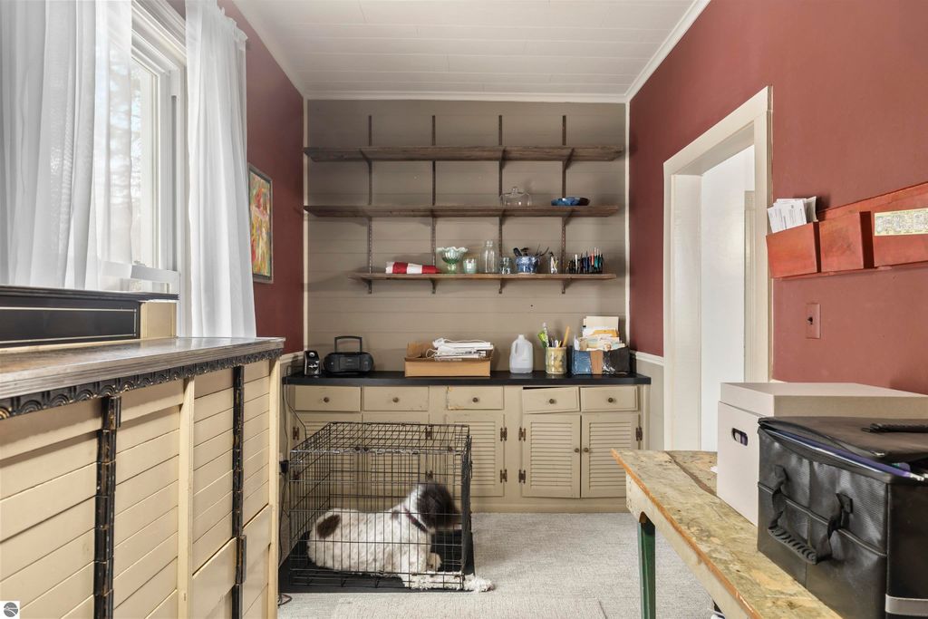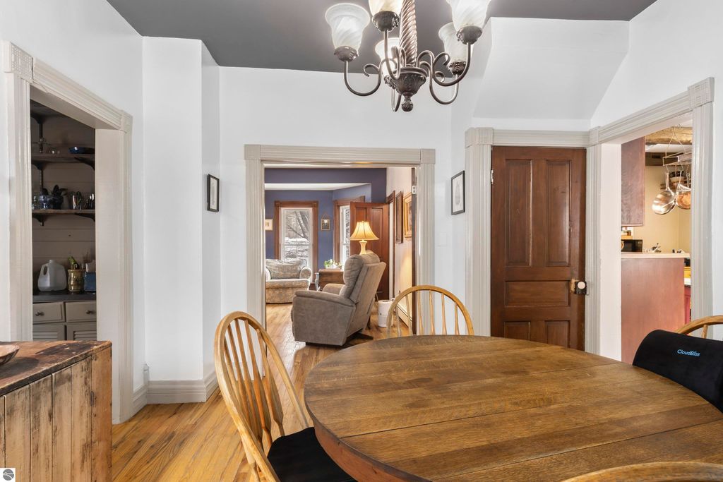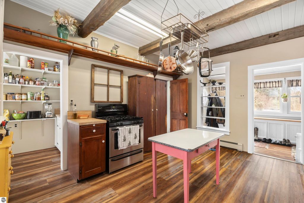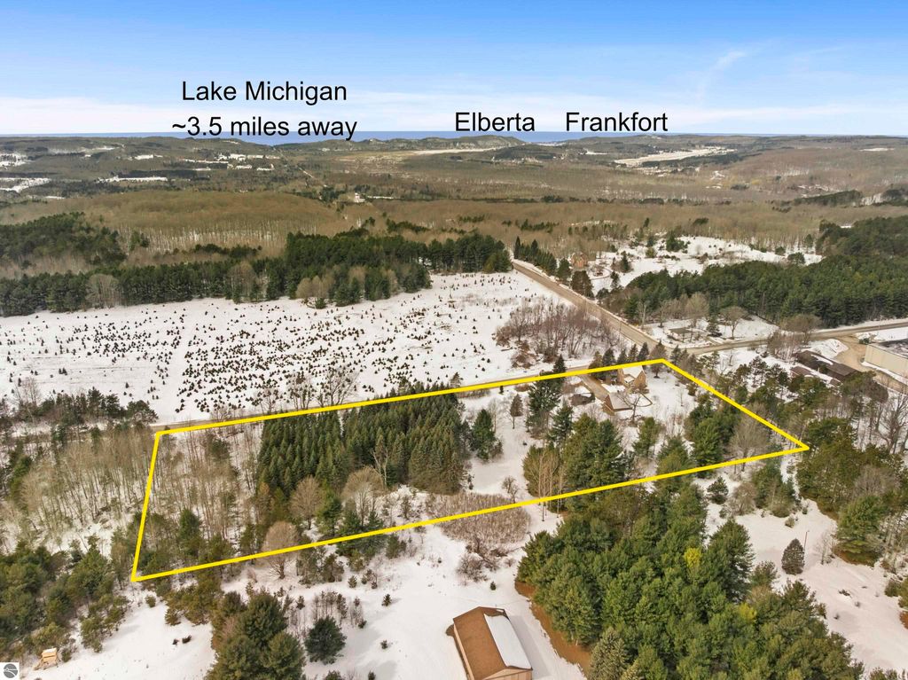 Charming, extensively updated 1886 farmhouse and detached two-car garage on 5.5 countryside acres. Just 3.5 miles to Lake Michigan sandy beaches. The seller says this is the site of the historic Fredrickson Tulip Farm. Dutch tidiness is evident in the many built-in cupboards and shelves found inside the home and in the placement of shrubs and flowers in the landscaped yard. The spacious farmhouse features 4 bedrooms and 2 full baths, a formal dining area, small office, large loft sitting area, walk-in pantry off the kitchen, an enclosed porch/mudroom and a 500 sq. ft basement for storage. The primary bedroom was updated in 2023 and has its own bath with a 5 ft. long shower enclosure and a washer dryer. This home wonderfully blends farmhouse character of yesteryear with modern amenities. There is nothing like authentic, original plaster lathe walls and ceilings, and the warmth of original wood floors and woodwork. A set of French doors and a clawfoot bathtub with showerhead add touches of charm. Interior upgrades include the replacement of all windows, newer vinyl plank flooring, stainless appliances, hot water baseboard heat an updated electrical panel and updated water heater. For low maintenance, the exterior of the home was updated to include vinyl shake siding and a steel metal roof the garage has metal siding and a newer metal roof. Interior stairs in the garage lead to a large, unfinished loft that could make a great studio or extra sleeping space. Natural gas supplies the house and a pipe to the garage was run for future use. The original wooden shed is large and needs a new roof. The yard is big, with container and flower gardens, dog kennels and a pen, a small deck, a chicken coop/garden area, firepit, and some woods with a walking path. Bonus: approx. 1 acre of invisible fencing. Village amenities are found in Benzonia, Elberta or Frankfort. The nearby Betsie River is known for great fishing, kayaking and birding.