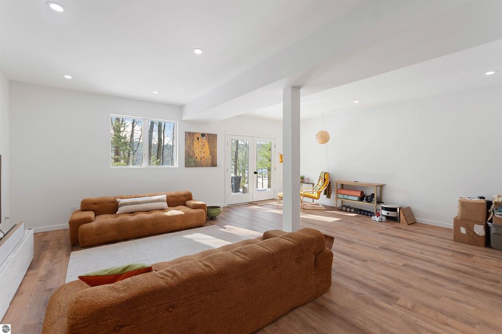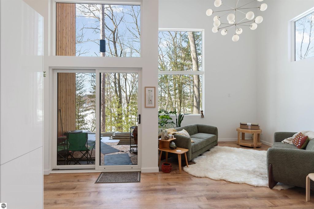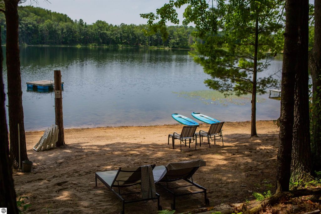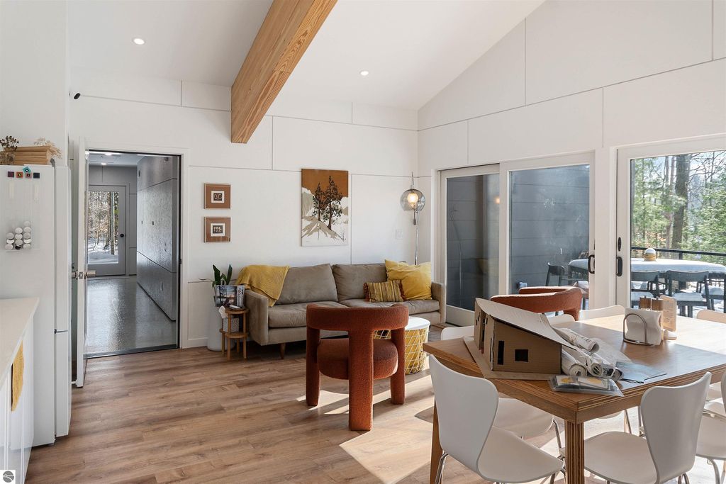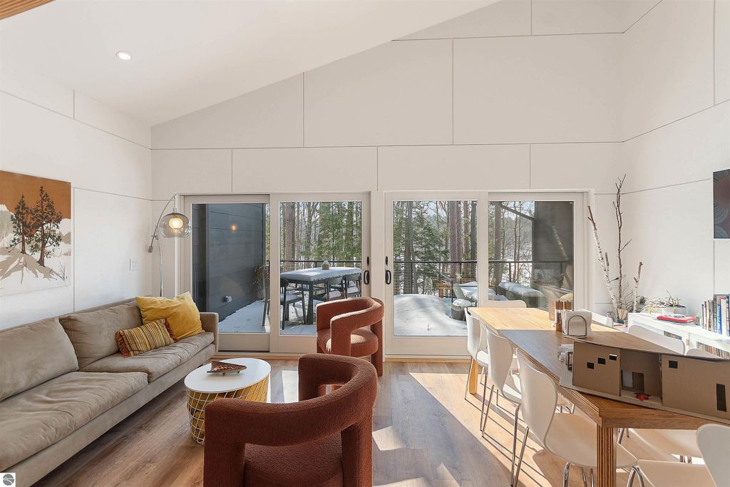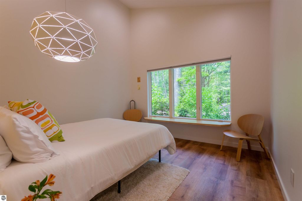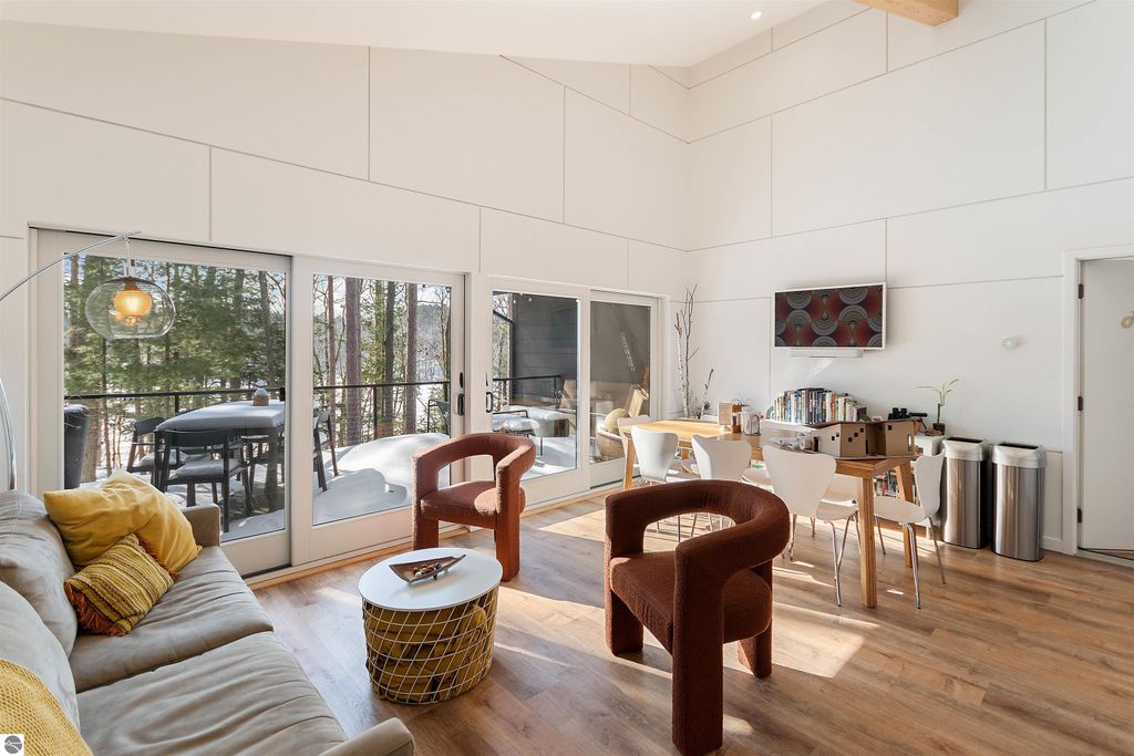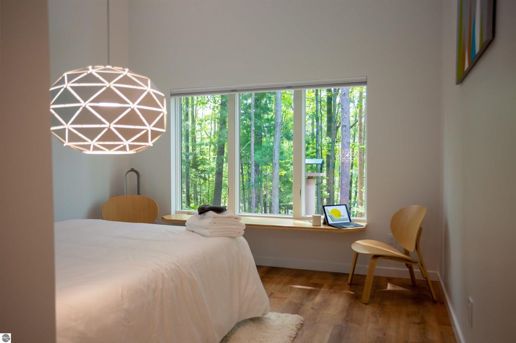 Exceptional opportunity to own a modern bed & breakfast on more than 5.5 private wooded acres with 402 feet of water frontage on Lake View, a peaceful no-wake lake. This thoughtfully designed retreat blends natural beauty with contemporary Scandinavian style. Located just one minute from Lake Ann and 15 minutes from Lake Michigan and Sleeping Bear Dunes National Lakeshore, the property offers convenient access to beaches, trails, wineries, breweries, and year-round recreation while maintaining exceptional privacy. The B&B features four identical studio-style guest suites with in-floor heat and high-end finishes, centered around a welcoming lounge where guests gather and relax. A separate guest parking area provides ample parking and easy access. The wooded grounds offer walking trails, abundant wildlife, and expansive private shoreline ideal for kayaking, paddleboarding, and lakeside enjoyment. A charming beach cabana near the water provides additional sleeping space for up to four. The attached owner's residence includes a main-level kitchen, living room, primary bedroom, bathroom, and heated 30x24 garage with workbench, dog wash sink, and an epoxy-sealed floor. The finished lower level offers two flex rooms, a bathroom, and a spacious living area with walkout French doors to a patio. It is also plumbed for a future kitchen, offering potential for a private guest suite or multi-generational living. The property is properly split for potential future development, and Almira Township allows accessory dwellings, providing long-term flexibility and upside. Whether continuing as a successful bed & breakfast, creating a private family compound, or exploring expansion opportunities, this unique lakefront property offers exceptional versatility in a prime Northern Michigan setting. Click the virtual tour link for an incredibly realistic view of the interior.
