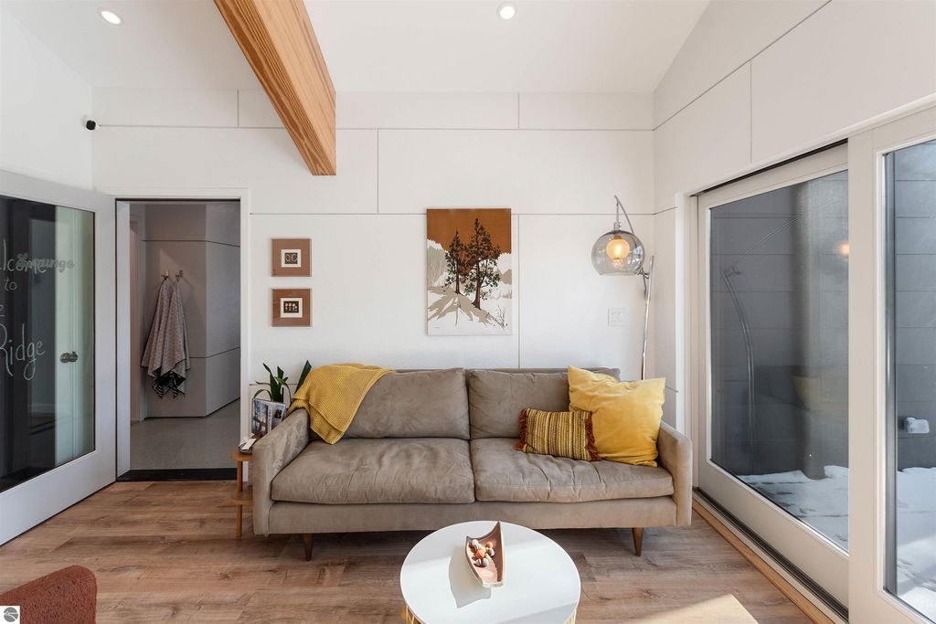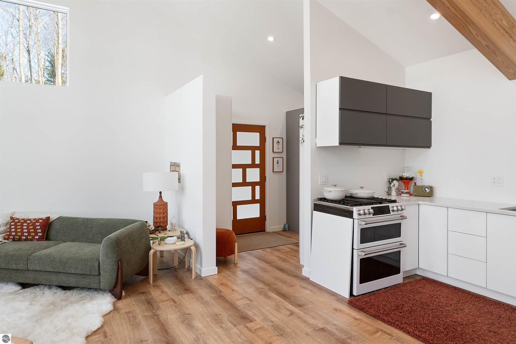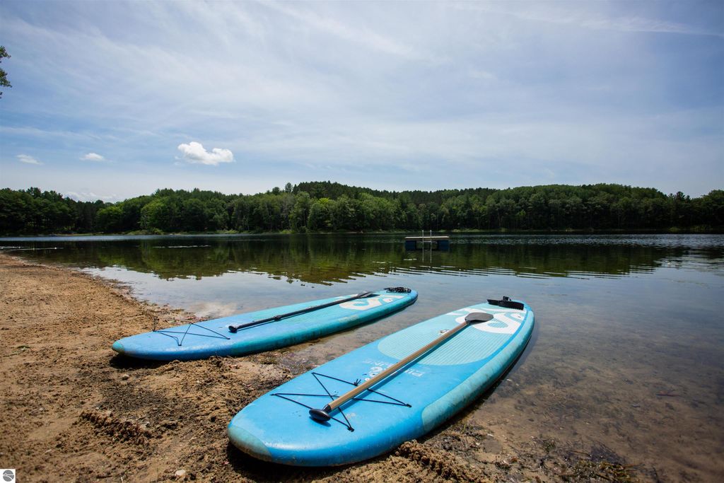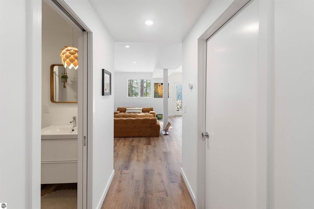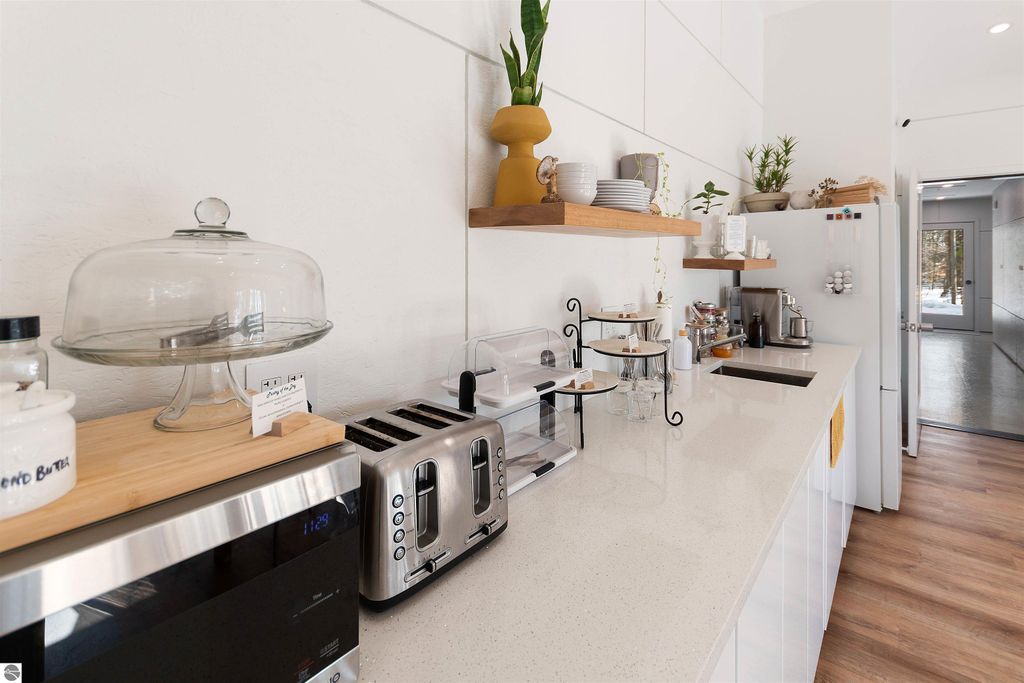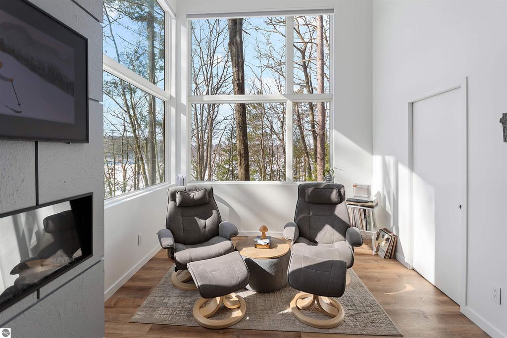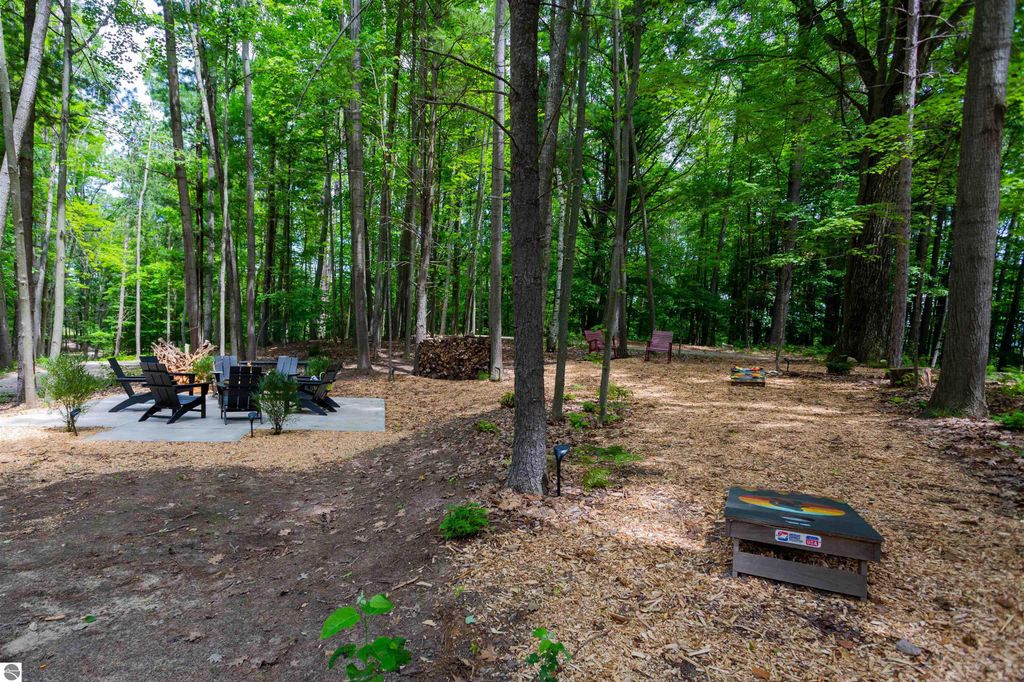 Exceptional opportunity to own a modern bed & breakfast on more than 5.5 private wooded acres with 402 feet of water frontage on Lake View, a peaceful no-wake lake. This thoughtfully designed retreat blends natural beauty with contemporary Scandinavian style. Located just one minute from Lake Ann and 15 minutes from Lake Michigan and Sleeping Bear Dunes National Lakeshore, the property offers convenient access to beaches, trails, wineries, breweries, and year-round recreation while maintaining exceptional privacy. The B&B features four identical studio-style guest suites with in-floor heat and high-end finishes, centered around a welcoming lounge where guests gather and relax. A separate guest parking area provides ample parking and easy access. The wooded grounds offer walking trails, abundant wildlife, and expansive private shoreline ideal for kayaking, paddleboarding, and lakeside enjoyment. A charming beach cabana near the water provides additional sleeping space for up to four. The attached owner's residence includes a main-level kitchen, living room, primary bedroom, bathroom, and heated 30x24 garage with workbench, dog wash sink, and an epoxy-sealed floor. The finished lower level offers two flex rooms, a bathroom, and a spacious living area with walkout French doors to a patio. It is also plumbed for a future kitchen, offering potential for a private guest suite or multi-generational living. The property is properly split for potential future development, and Almira Township allows accessory dwellings, providing long-term flexibility and upside. Whether continuing as a successful bed & breakfast, creating a private family compound, or exploring expansion opportunities, this unique lakefront property offers exceptional versatility in a prime Northern Michigan setting. Click the virtual tour link for an incredibly realistic view of the interior.