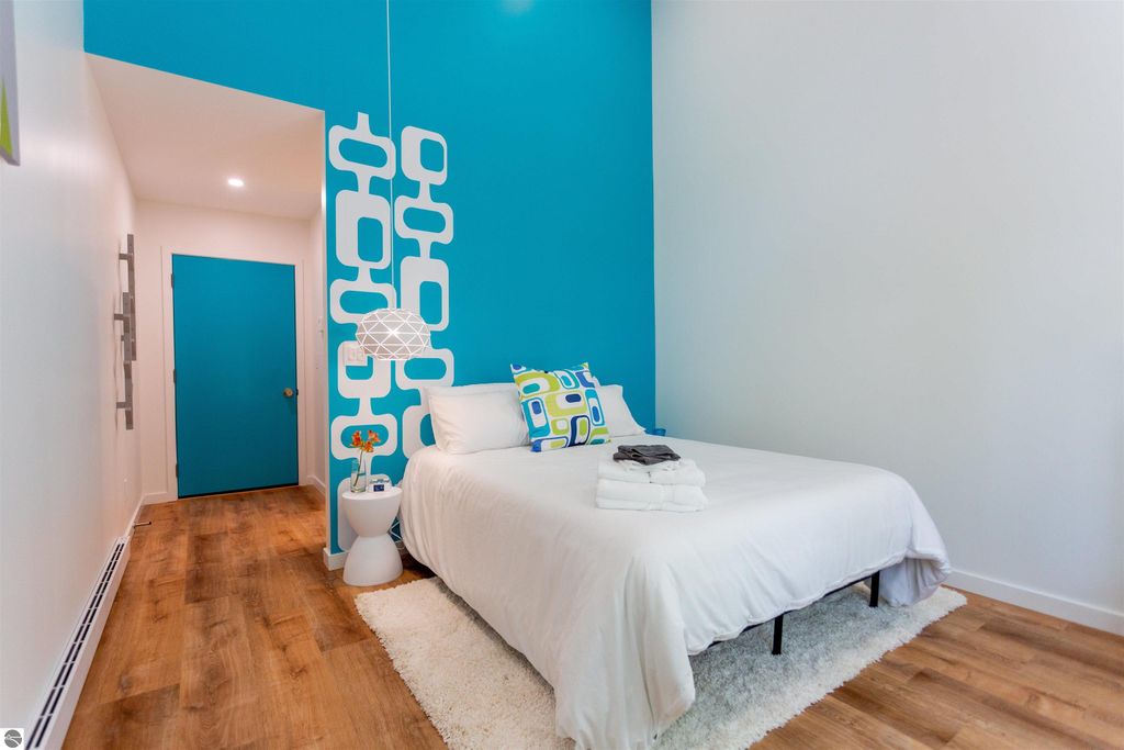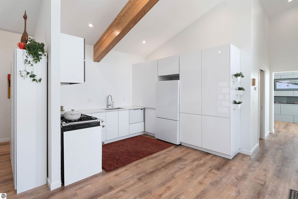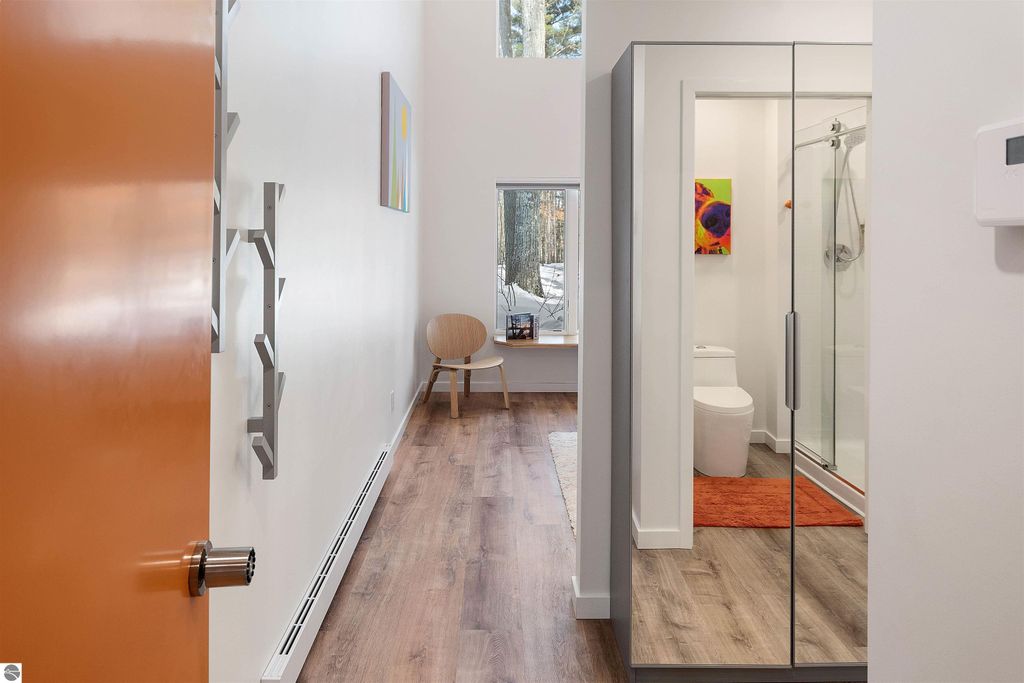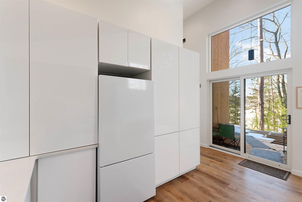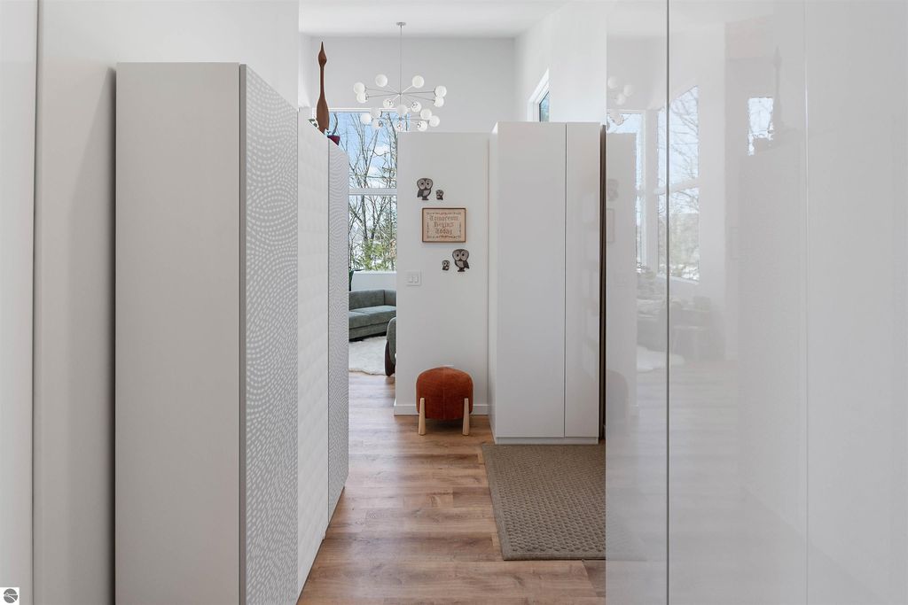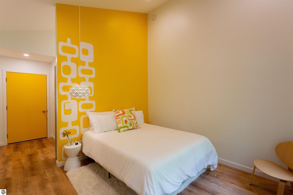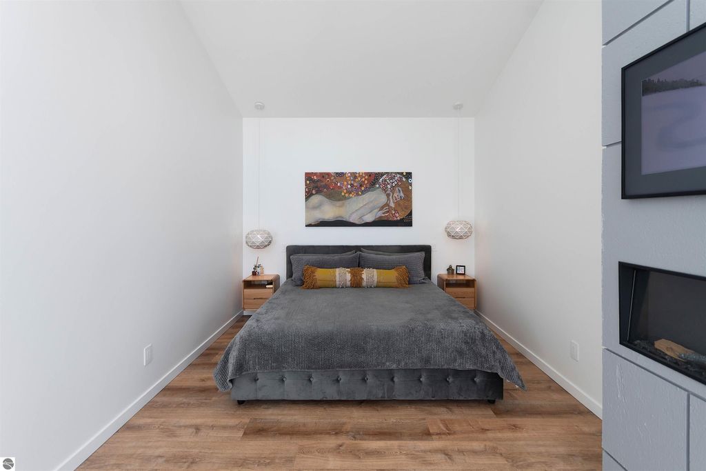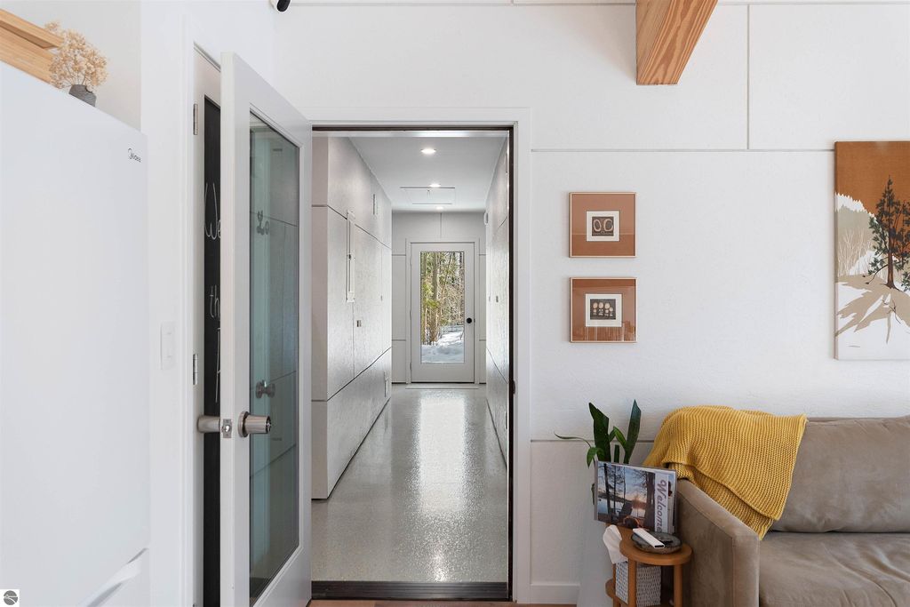 Exceptional opportunity to own a modern bed & breakfast on more than 5.5 private wooded acres with 402 feet of water frontage on Lake View, a peaceful no-wake lake. This thoughtfully designed retreat blends natural beauty with contemporary Scandinavian style. Located just one minute from Lake Ann and 15 minutes from Lake Michigan and Sleeping Bear Dunes National Lakeshore, the property offers convenient access to beaches, trails, wineries, breweries, and year-round recreation while maintaining exceptional privacy. The B&B features four identical studio-style guest suites with in-floor heat and high-end finishes, centered around a welcoming lounge where guests gather and relax. A separate guest parking area provides ample parking and easy access. The wooded grounds offer walking trails, abundant wildlife, and expansive private shoreline ideal for kayaking, paddleboarding, and lakeside enjoyment. A charming beach cabana near the water provides additional sleeping space for up to four. The attached owner's residence includes a main-level kitchen, living room, primary bedroom, bathroom, and heated 30x24 garage with workbench, dog wash sink, and an epoxy-sealed floor. The finished lower level offers two flex rooms, a bathroom, and a spacious living area with walkout French doors to a patio. It is also plumbed for a future kitchen, offering potential for a private guest suite or multi-generational living. The property is properly split for potential future development, and Almira Township allows accessory dwellings, providing long-term flexibility and upside. Whether continuing as a successful bed & breakfast, creating a private family compound, or exploring expansion opportunities, this unique lakefront property offers exceptional versatility in a prime Northern Michigan setting. Click the virtual tour link for an incredibly realistic view of the interior.