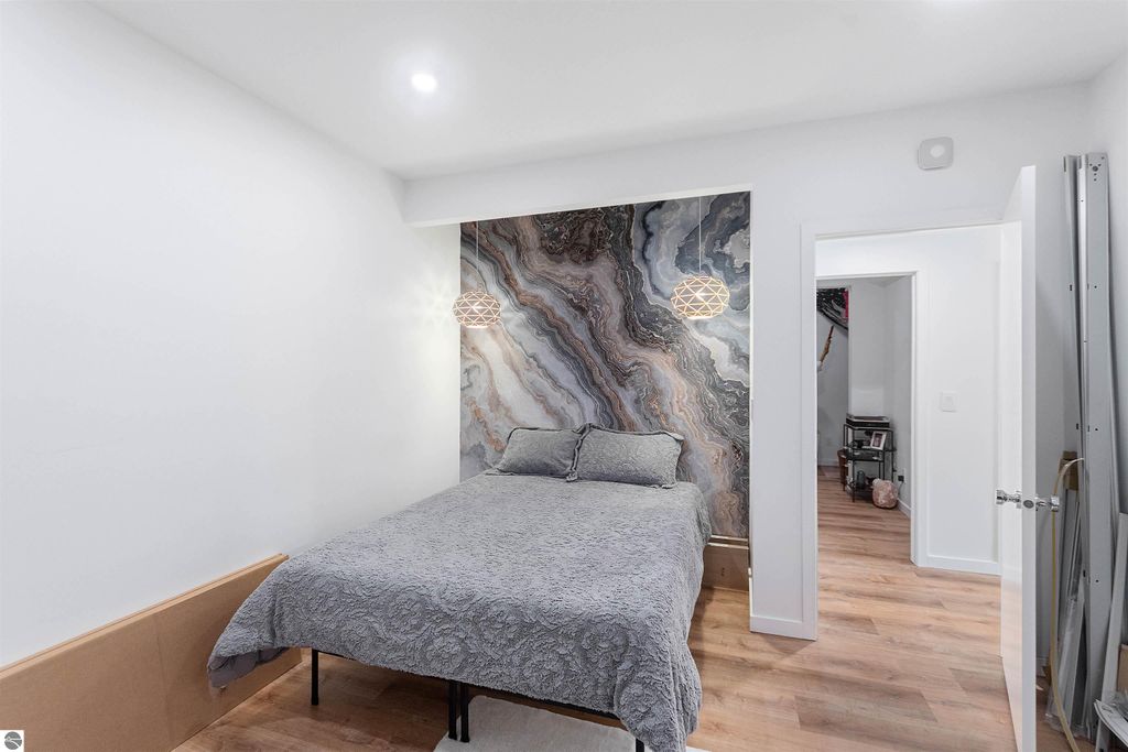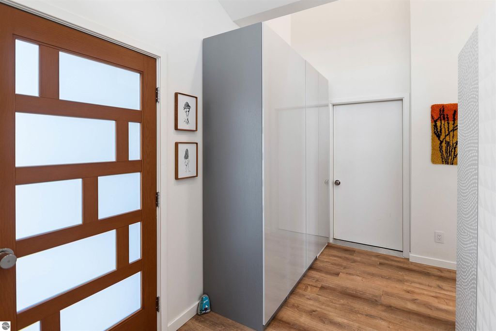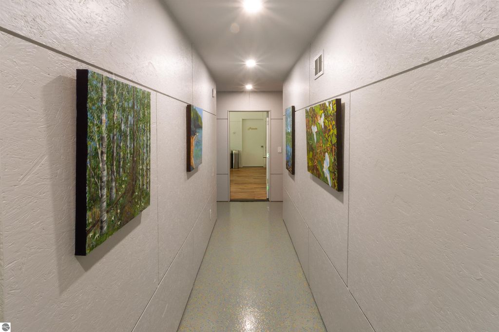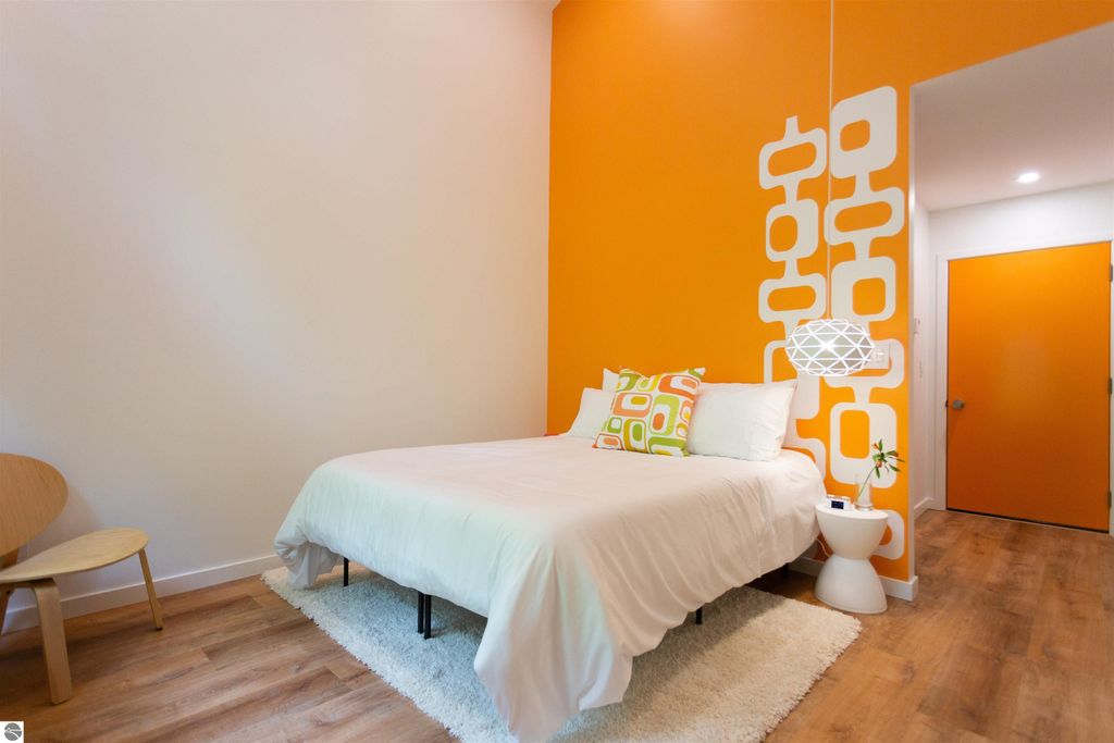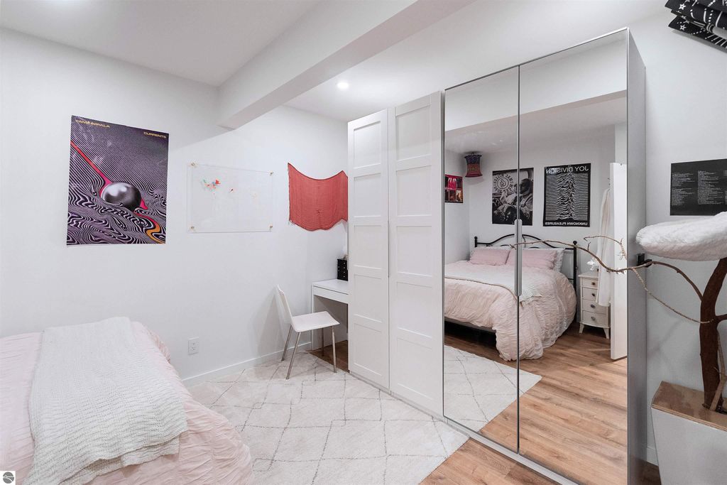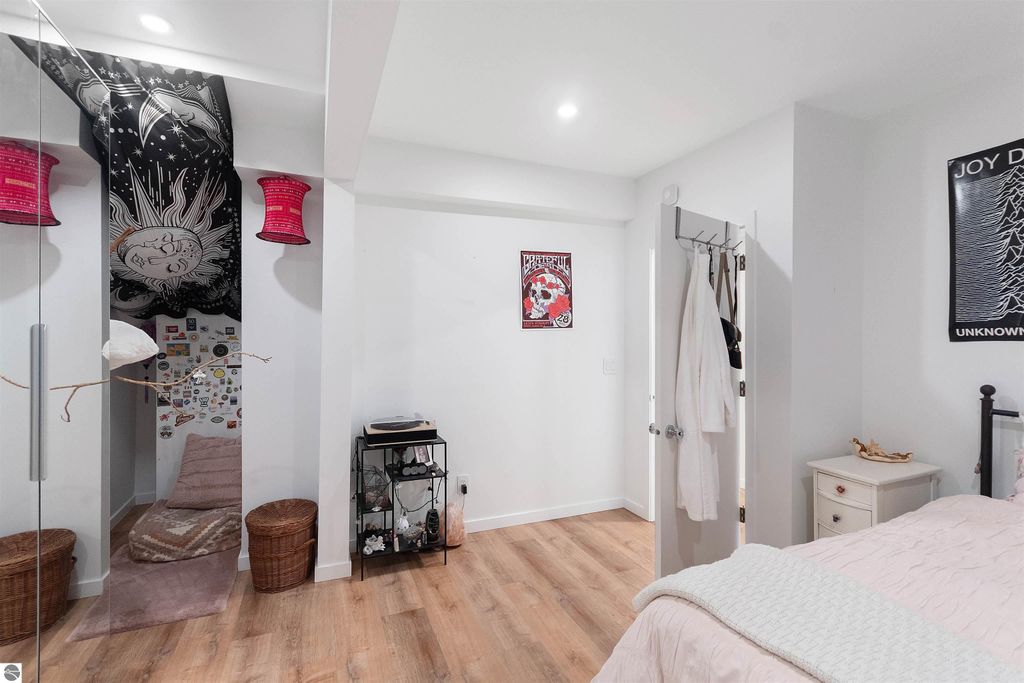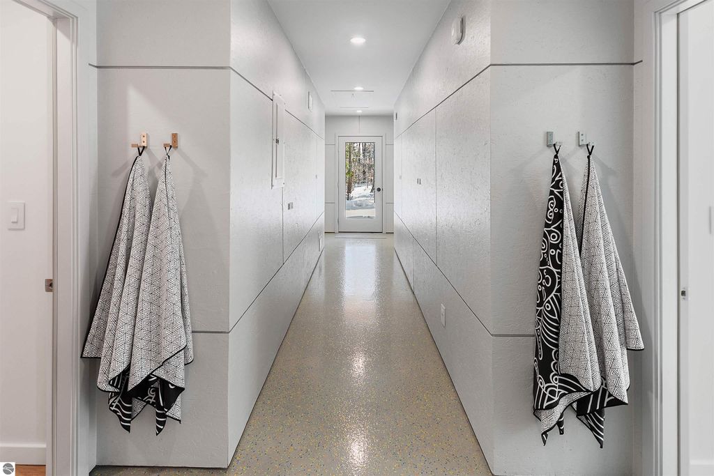 Exceptional opportunity to own a modern bed & breakfast on more than 5.5 private wooded acres with 402 feet of water frontage on Lake View, a peaceful no-wake lake. This thoughtfully designed retreat blends natural beauty with contemporary Scandinavian style. Located just one minute from Lake Ann and 15 minutes from Lake Michigan and Sleeping Bear Dunes National Lakeshore, the property offers convenient access to beaches, trails, wineries, breweries, and year-round recreation while maintaining exceptional privacy. The B&B features four identical studio-style guest suites with in-floor heat and high-end finishes, centered around a welcoming lounge where guests gather and relax. A separate guest parking area provides ample parking and easy access. The wooded grounds offer walking trails, abundant wildlife, and expansive private shoreline ideal for kayaking, paddleboarding, and lakeside enjoyment. A charming beach cabana near the water provides additional sleeping space for up to four. The attached owner's residence includes a main-level kitchen, living room, primary bedroom, bathroom, and heated 30x24 garage with workbench, dog wash sink, and an epoxy-sealed floor. The finished lower level offers two flex rooms, a bathroom, and a spacious living area with walkout French doors to a patio. It is also plumbed for a future kitchen, offering potential for a private guest suite or multi-generational living. The property is properly split for potential future development, and Almira Township allows accessory dwellings, providing long-term flexibility and upside. Whether continuing as a successful bed & breakfast, creating a private family compound, or exploring expansion opportunities, this unique lakefront property offers exceptional versatility in a prime Northern Michigan setting. Click the virtual tour link for an incredibly realistic view of the interior.