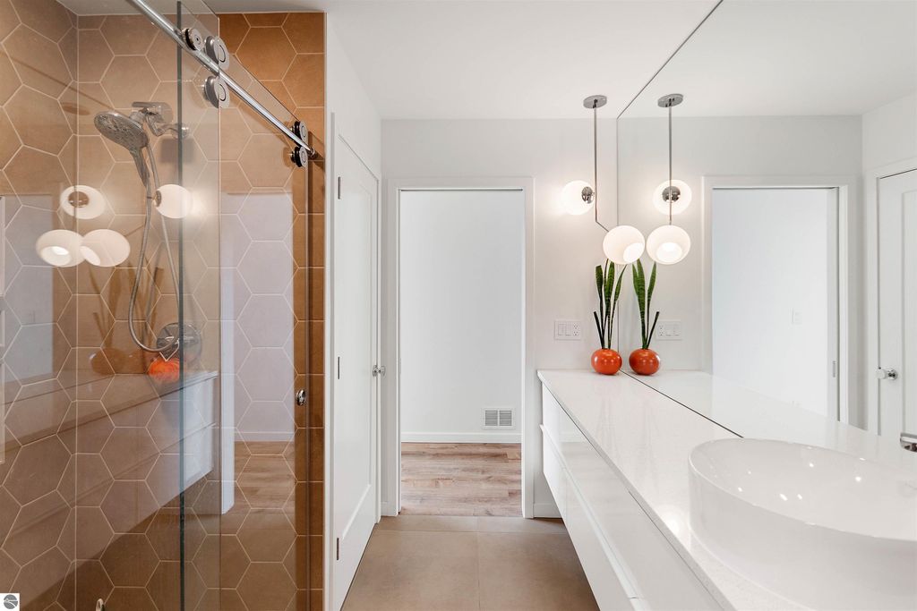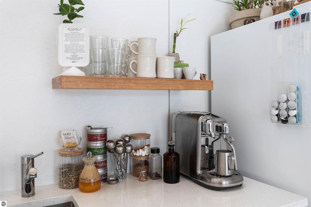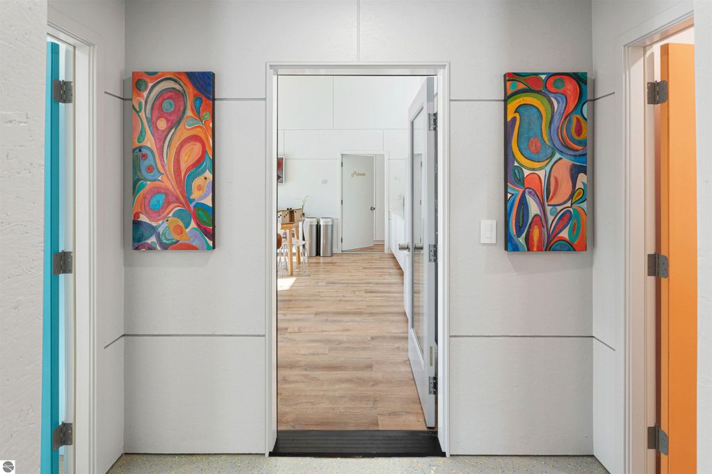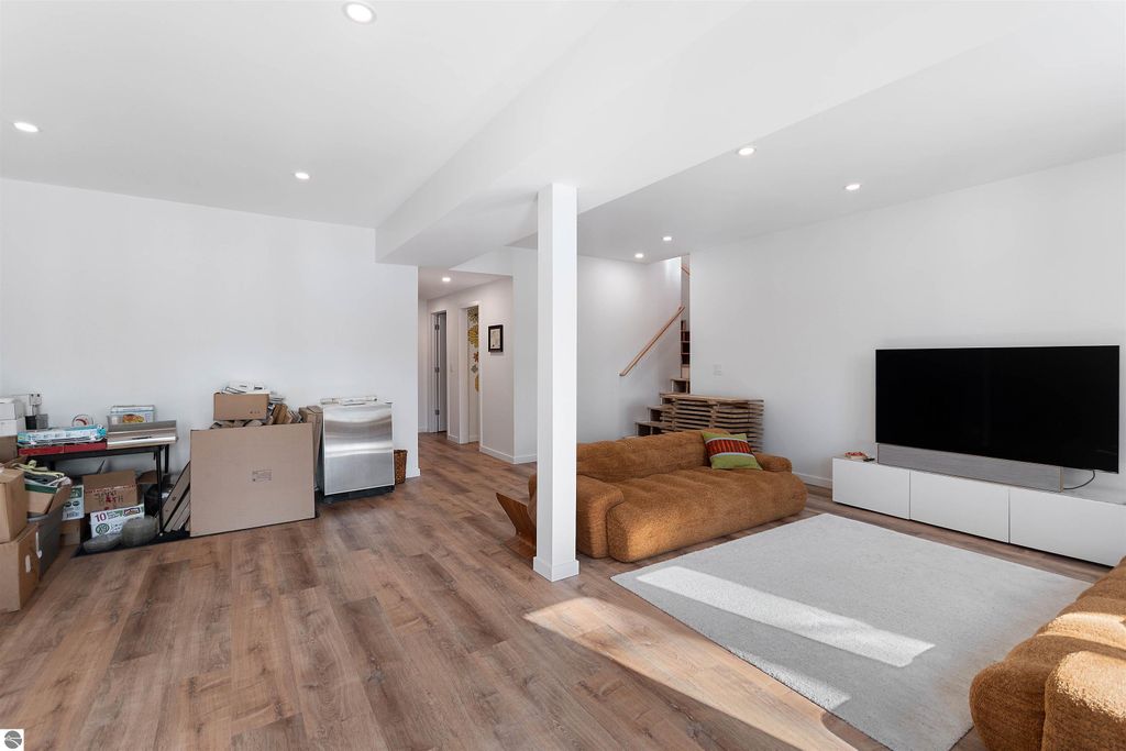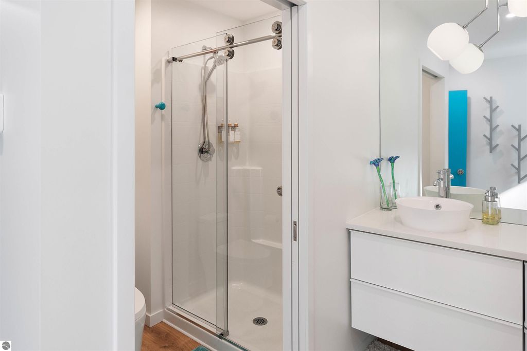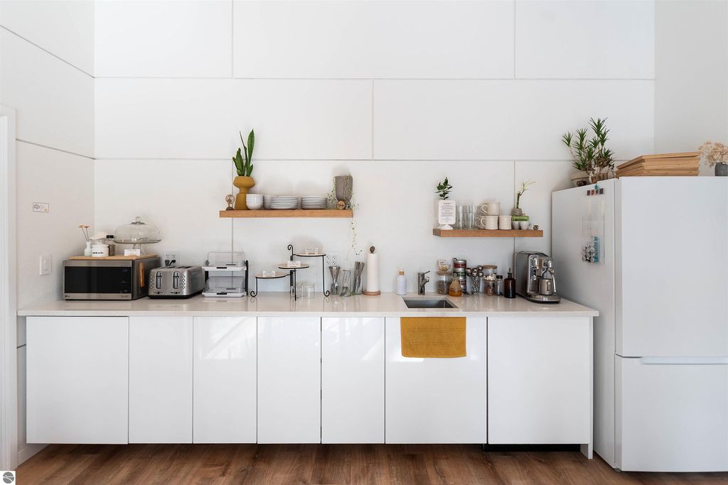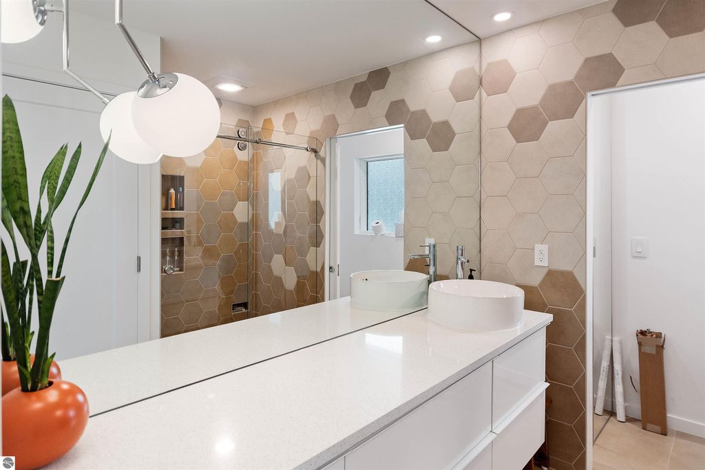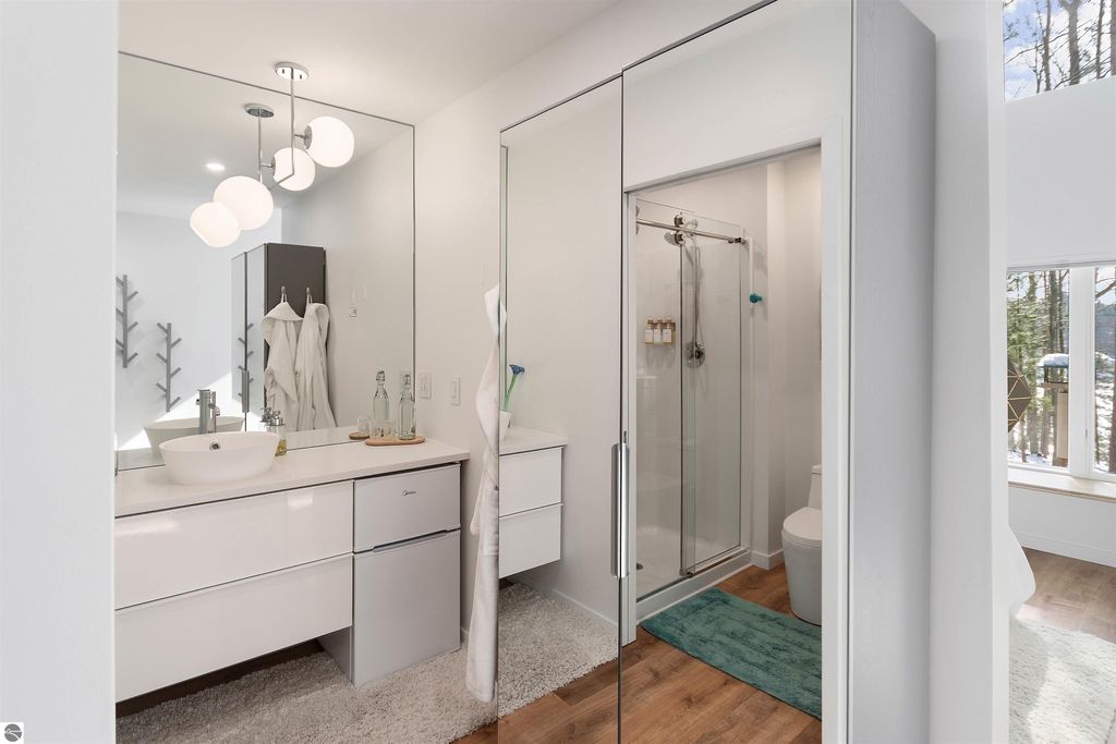 Exceptional opportunity to own a modern bed & breakfast on more than 5.5 private wooded acres with 402 feet of water frontage on Lake View, a peaceful no-wake lake. This thoughtfully designed retreat blends natural beauty with contemporary Scandinavian style. Located just one minute from Lake Ann and 15 minutes from Lake Michigan and Sleeping Bear Dunes National Lakeshore, the property offers convenient access to beaches, trails, wineries, breweries, and year-round recreation while maintaining exceptional privacy. The B&B features four identical studio-style guest suites with in-floor heat and high-end finishes, centered around a welcoming lounge where guests gather and relax. A separate guest parking area provides ample parking and easy access. The wooded grounds offer walking trails, abundant wildlife, and expansive private shoreline ideal for kayaking, paddleboarding, and lakeside enjoyment. A charming beach cabana near the water provides additional sleeping space for up to four. The attached owner's residence includes a main-level kitchen, living room, primary bedroom, bathroom, and heated 30x24 garage with workbench, dog wash sink, and an epoxy-sealed floor. The finished lower level offers two flex rooms, a bathroom, and a spacious living area with walkout French doors to a patio. It is also plumbed for a future kitchen, offering potential for a private guest suite or multi-generational living. The property is properly split for potential future development, and Almira Township allows accessory dwellings, providing long-term flexibility and upside. Whether continuing as a successful bed & breakfast, creating a private family compound, or exploring expansion opportunities, this unique lakefront property offers exceptional versatility in a prime Northern Michigan setting. Click the virtual tour link for an incredibly realistic view of the interior.