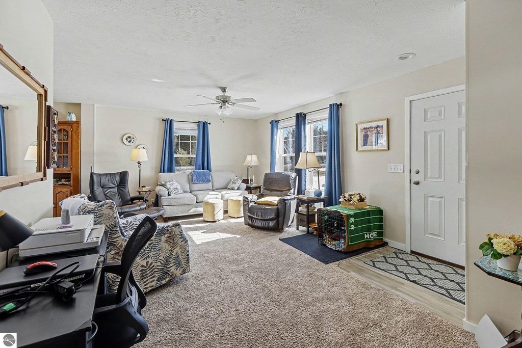Only two years old and perfectly located between Cadillac and Traverse City, this home sits on 2.5 acres"”ideal for those looking for a little extra room to spread out. The home offers convenient main-floor living with two large bedrooms. The primary bedroom includes a private full bath with a step-in shower. Bright windows fill every room with natural light. There is also an option to convert the hallway space into a third bedroom with minimal cost, creating instant additional value. The open living area provides plenty of space for comfortable furniture arrangements. The kitchen features upgraded cabinets that extend to the ceiling, an eat-in dining area, stainless steel appliances, and a tall pantry cabinet for extra storage. A sliding door connects the kitchen to a full-length covered deck, perfect for enjoying long summer evenings. The attached two-car garage includes an extra-deep concrete approach. Sidewalks are installed and wrap from the driveway to the deck area for easy access. As an added bonus, the home is connected to natural gas.