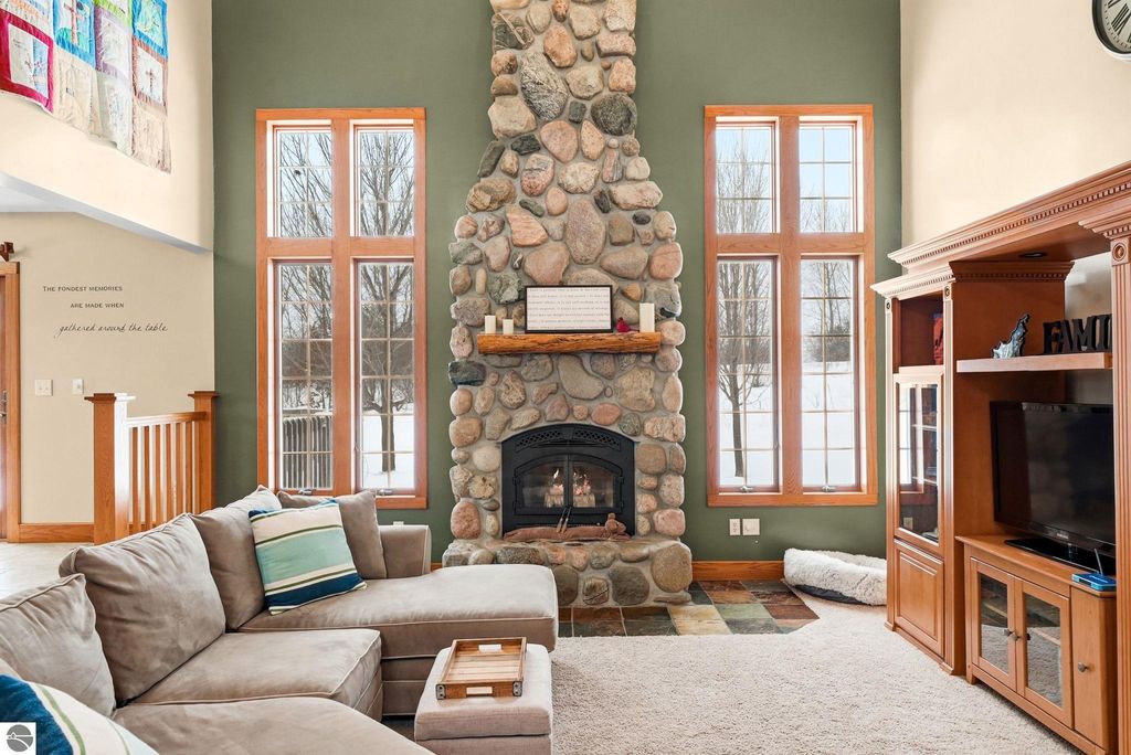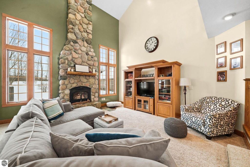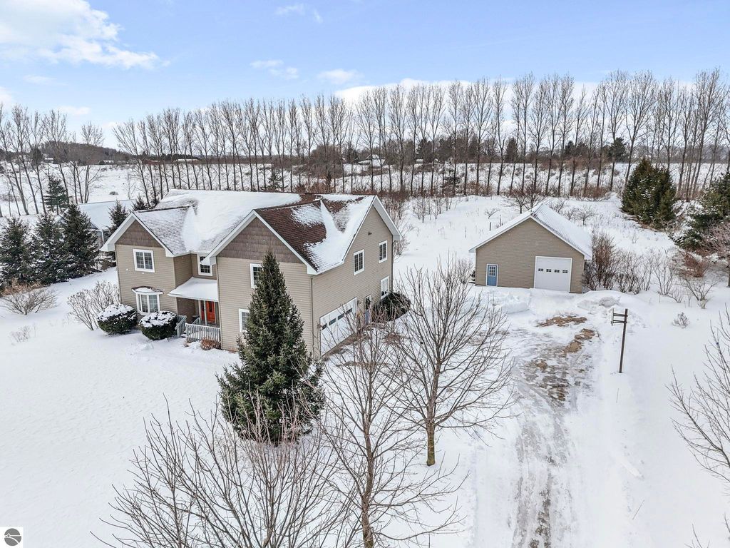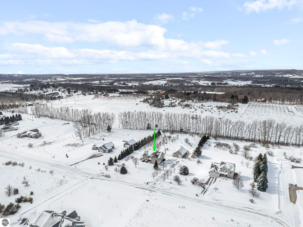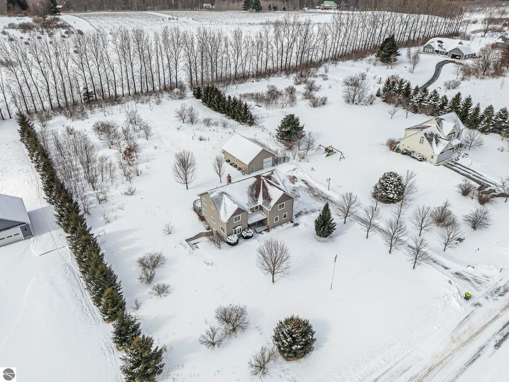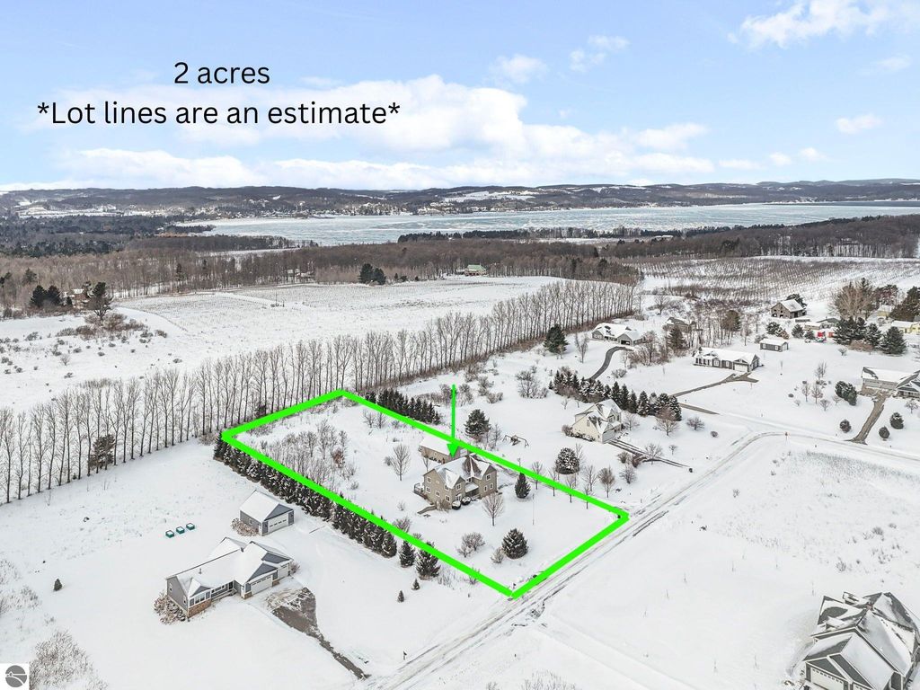 Exceptionally crafted 5 bd 4 bath home just south of Suttons Bay on the beautiful peninsula of Stony Pointe is awaiting it's next family! The main level features a large chef's kitchen opening to the living room anchored by a custom crafted 2 story stone fireplace framed by floor to ceiling windows. 5 bedrooms, 4 bathrooms, with 2 den/office spaces leaves plenty of room for families to grow or to entertain guests. Upper level features a sprawling catwalk to the primary bedroom, a true oasis in and of itself with a custom tiled shower and heated floors throughout. The lower level walks out to the property with a separate entrance and features an oversized wet bar with granite countertops, a bedroom and bathroom with a dual vanity and a dedicated 2nd laundry room that connects to the garage. Additionally the property features a 30x40 detached pole barn with second level storage for all of your vehicle and miscellaneous storage needs. The home sits on a well maintained 2 acre parcel with mature landscaping, invisible pet fencing, underground sprinkler system, covered front porch, and large porch out the back. The Orchards subdivision has county maintained roads with low association fees for a low maintenance lifestyle. Just 4 minutes from Suttons Bay you truly have all of the best parts of the Leelanau lifestyle at your fingertips. From world class restaurants, to pristine sandy beaches, well awarded wineries, to the T.A.R.T bike trail connecting through Traverse City, this home truly has it all.
