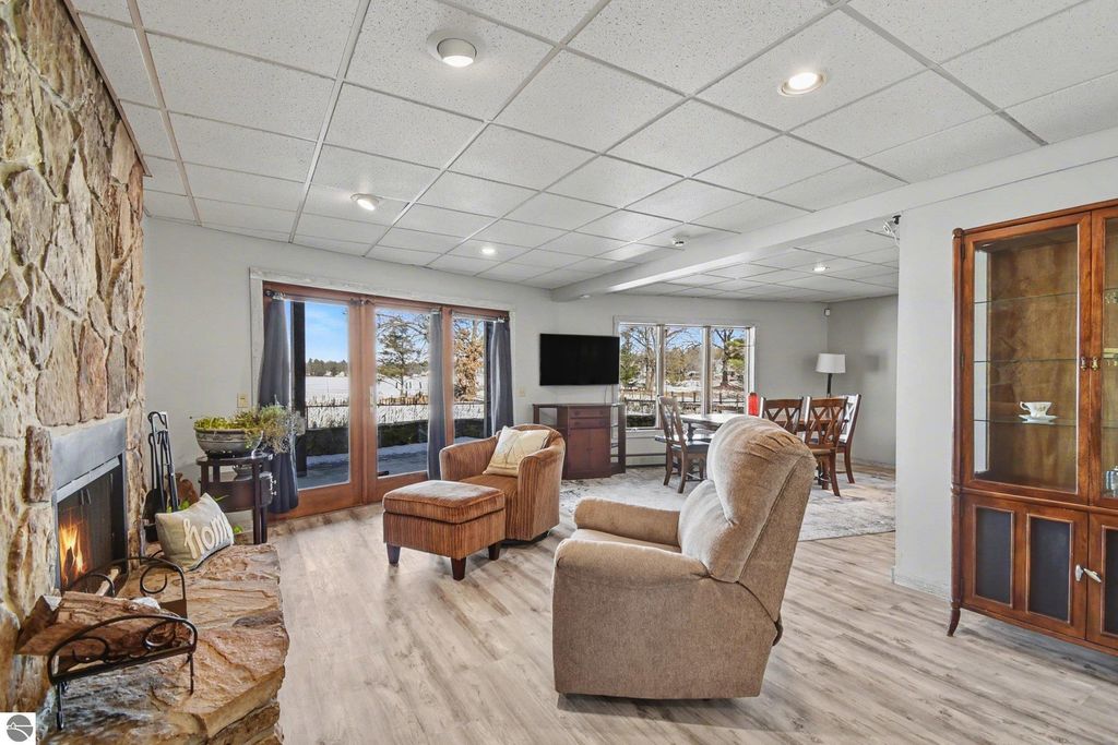 Experience the pinnacle of lakeside living in this extraordinary waterfront residence on the shores of Sand Lake. Perfectly positioned to capture breathtaking lake views, this exceptional home offers 105 feet of pristine waterfront and a private sandy beach, creating an idyllic setting for both relaxation and recreation. From the moment you enter, you are welcomed by soaring ceilings, expansive windows, and an abundance of natural light that highlights the home's exquisite architectural details. A custom stone fireplace anchors the main living space, creating a warm and inviting atmosphere while framing spectacular lake views. The open-concept living and dining areas flow seamlessly, ideal for both grand entertaining and intimate gatherings. The gourmet chef's kitchen serves as the heart of the home, featuring premium finishes, custom cabinetry, and a spacious island designed for both culinary creativity and effortless entertaining. The primary suite is accessed through elegant double French doors and thoughtfully positioned for privacy away from the main living areas and features a spa-inspired ensuite and separate his and hers closets, creating a comfortable and refined personal retreat. The walk-out lower level expands the home's versatility, offering a kitchenette, laundry area, an additional fireplace, and extra sleeping space"”perfect for guests, extended family, or lakeside entertaining. Step outside to enjoy a beautifully balanced property featuring a fenced yard area for privacy and recreation, along with preserved natural surroundings that attract migratory birds and local wildlife, providing a peaceful connection to nature. The expansive garage offers exceptional space for vehicles and storage, complete with a lake-side garage door for easy access to water toys and equipment. Above the garage, an unfinished loft area provides potential for additional living space, a studio, or a customized retreat.