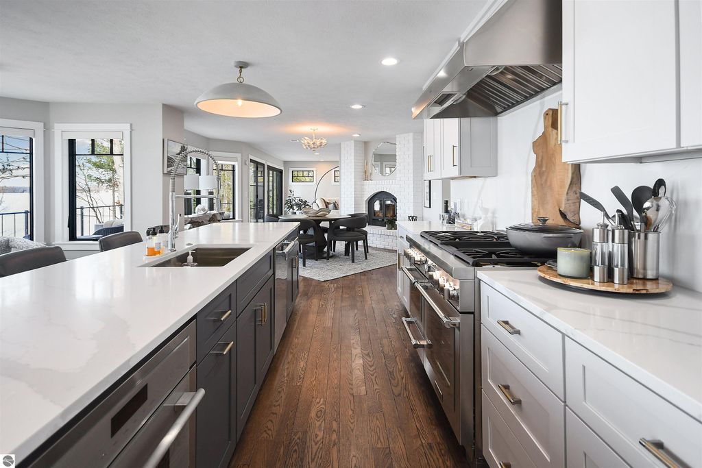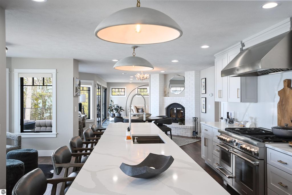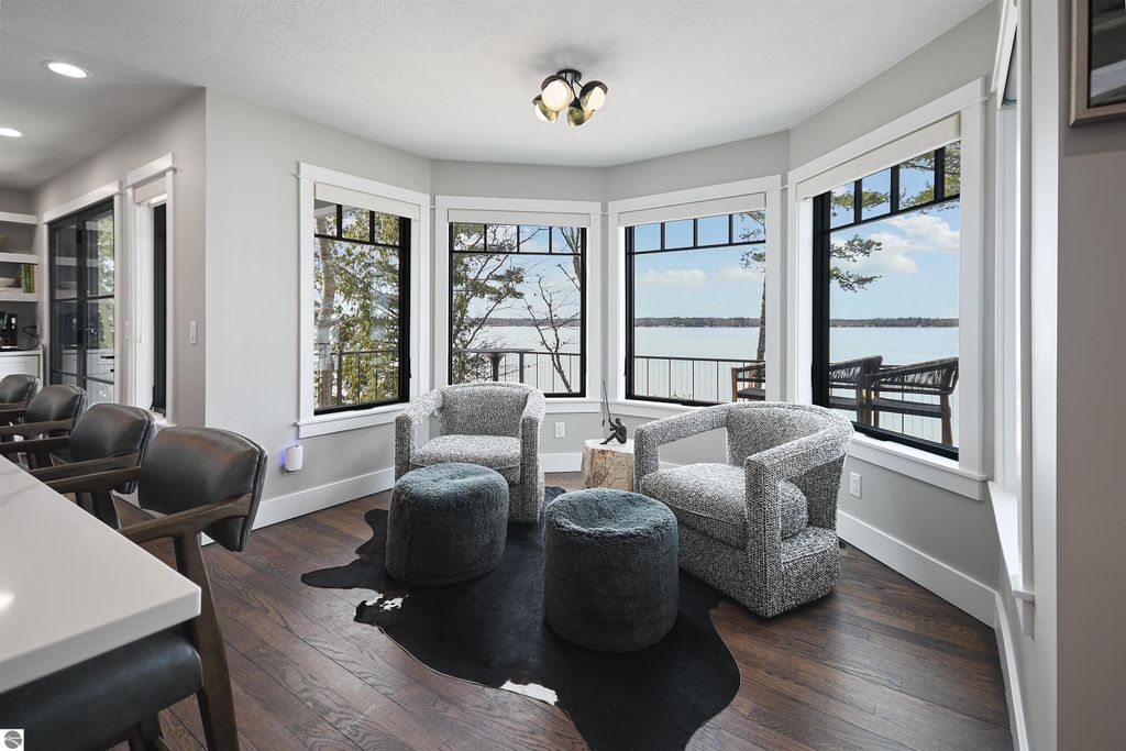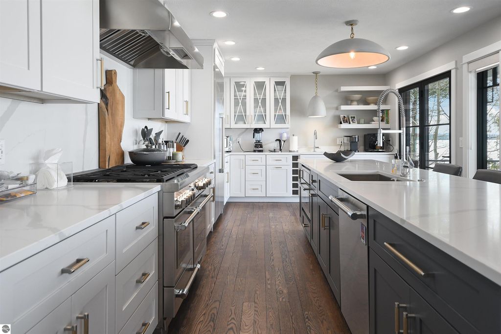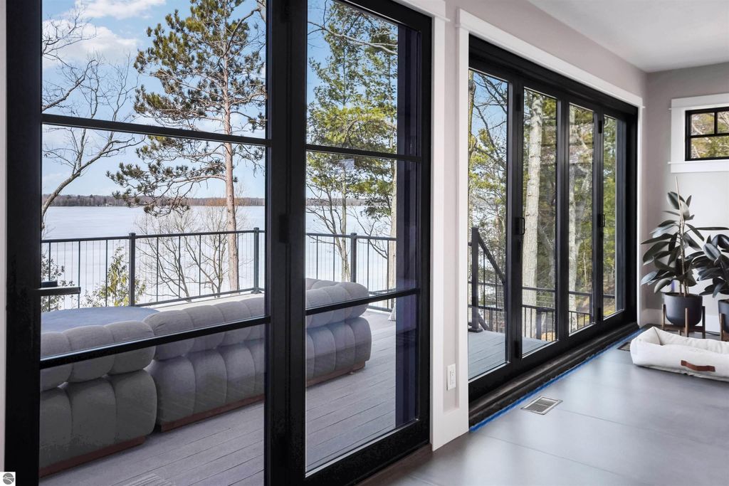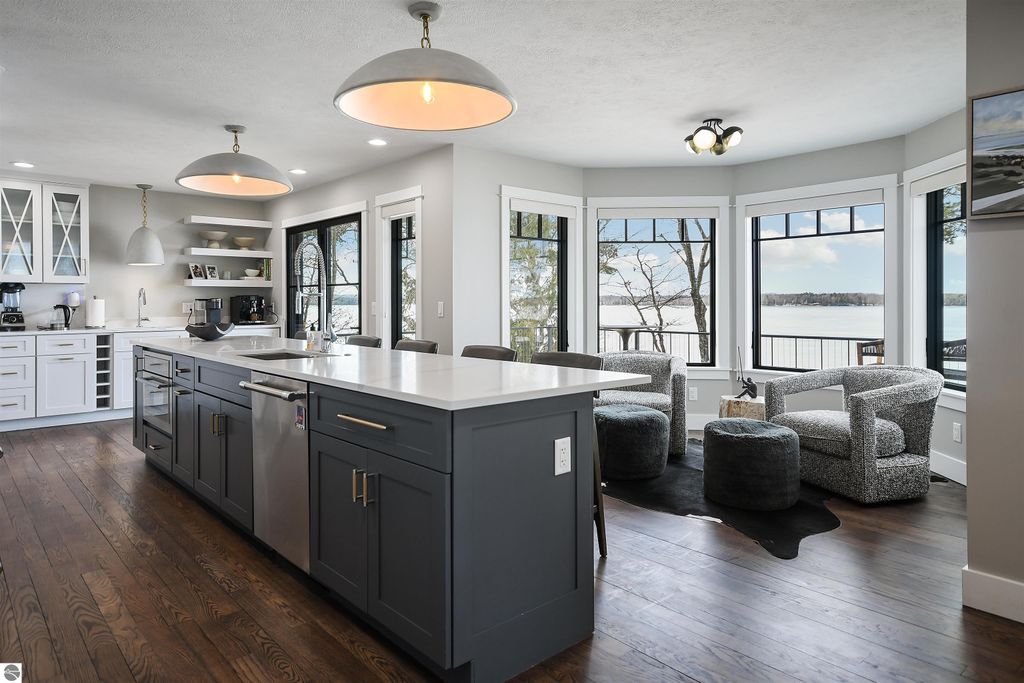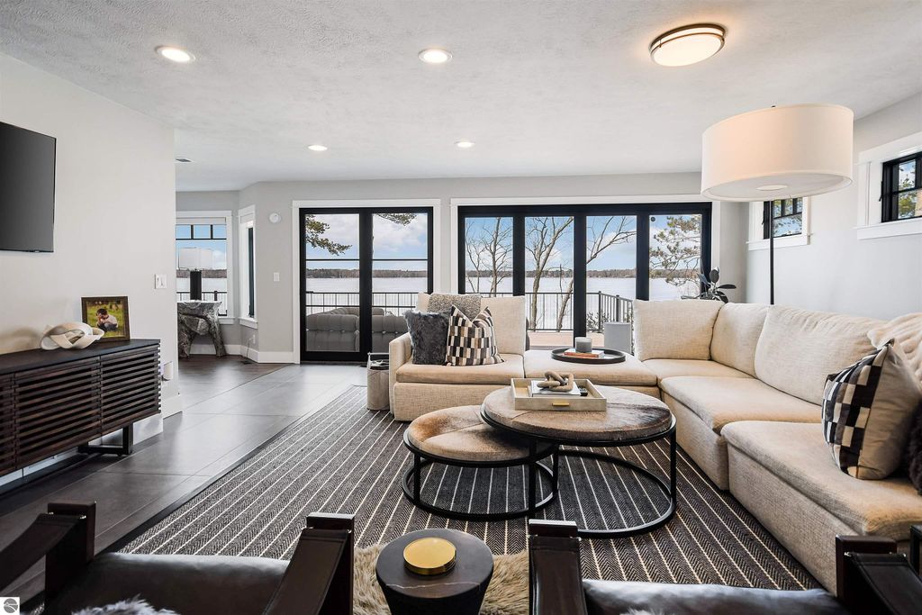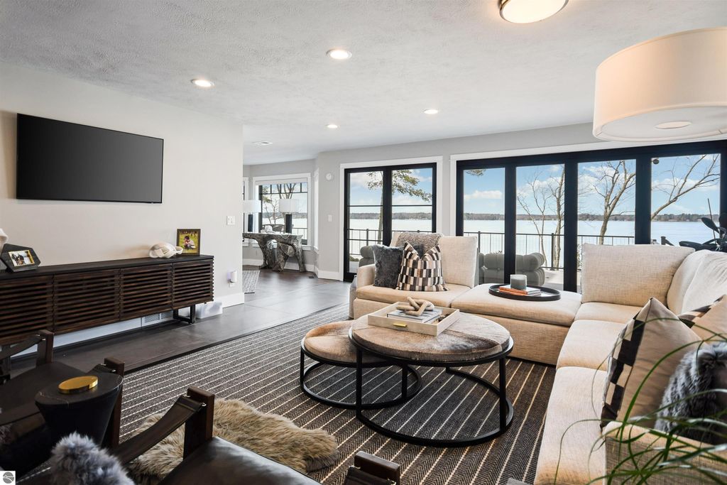 Stunning Green Lake waterfront. This exceptional lakefront property, extensively renovated between 2022-2024, offers breathtaking sunset views and 75' of private sandy beach"”perfect for enjoying Northern Michigan summers. Expansive outdoor living spaces provide multiple areas for entertaining, all set against the beautiful backdrop of Green Lake. Inside, the home showcases a complete top-to-bottom remodel with showroom-quality finishes and a sophisticated neutral palette that creates a bright, modern feel throughout. The centerpiece of the home is a chef's dream kitchen featuring a dramatic island with premium quartz countertops and matching backsplash, paired with high-end Thermador appliances. Nearly every room captures stunning water views, creating a seamless connection between indoor living and the surrounding waterfront setting. The luxurious primary suite offers a spacious walk-in closet, private sitting area with balcony access, and a spa-inspired en suite bath with a deep soaking tub and indulgent steam shower. The fully finished walkout lower level functions beautifully as an in-law or guest suite, complete with its own kitchenette, laundry, and private entrance. Located in the highly sought-after Penn Lock Colony neighborhood, the property enjoys convenient access to Interlochen Center for the Arts just across the lake, the Village of Interlochen, Crystal Mountain Resort, and is only a short drive to downtown Traverse City. Click on virtual tour link for an incredibly realistic view of the interior.