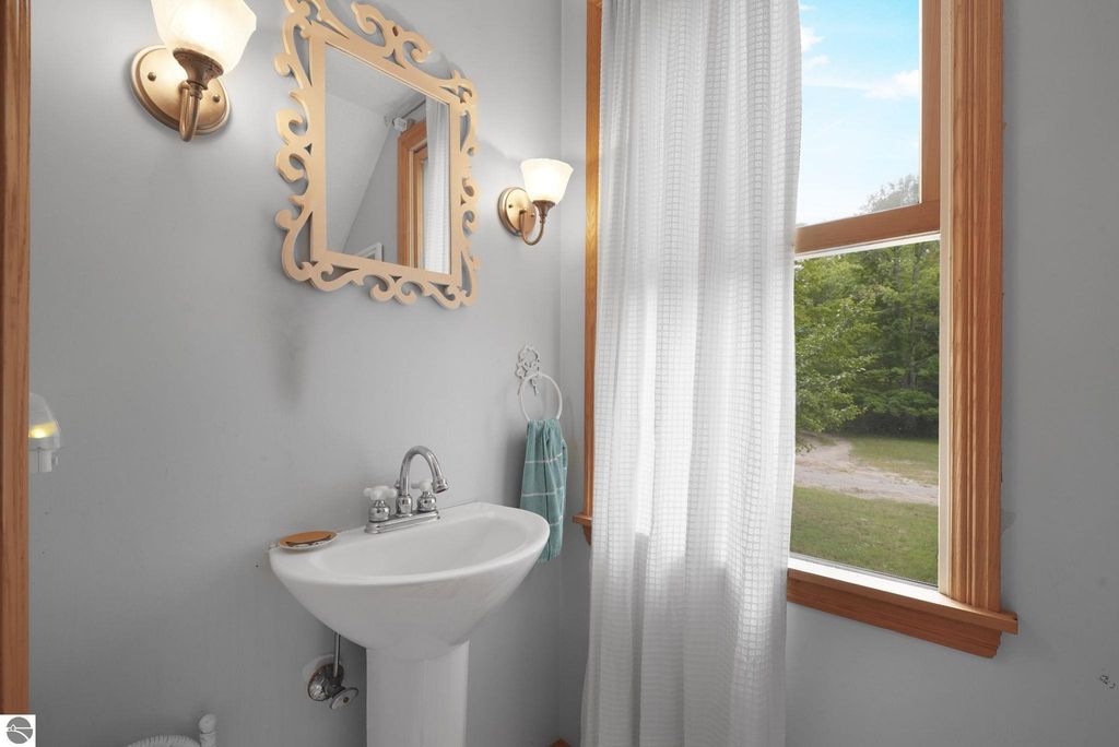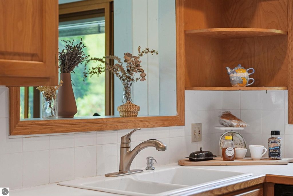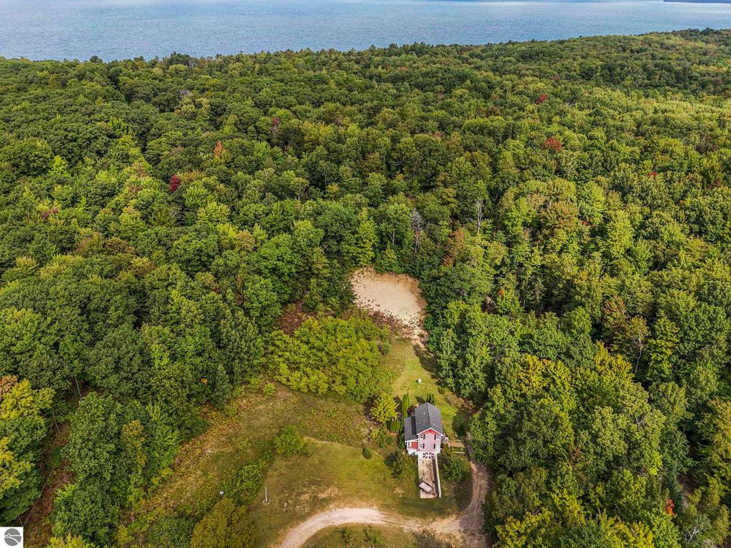 Presenting a unique, elevated farmhouse on 3 acres, just north of Leland! This simple, 1 bedroom / 1.5 bathroom residence is perched at the edge of a beautiful dune-like clearing, and is accessed via shared driveway easement off of scenic M22. The kitchen, living room with fireplace, dining area, and half bathroom are located on the main floor, which opens to a private deck - a delightful location to enjoy views of the yard and take in the sounds of nearby Lake Michigan. Upstairs, the primary bedroom has a vaulted ceiling, clad in wood tongue and groove paneling. This space is bright and cheerful, featuring numerous windows with views of the surrounding dune and woods. A full bathroom and walk-in closet with washer and dryer complete this upper floor. On the lowest level, a workshop and storage area walkout to grade through wooden barn doors. This home is being sold as-is: it is a cosmetic fixer-upper with excellent bones and endless potential, just waiting for your personal touch and updates. Don't miss your chance to live near beautiful Leland! Full associated documents include an inspection report from Fall of 2025. FOR CLARITY: this property includes the house and lean-to structure. Any other structures shown in the background of any photographs are on the neighboring parcel and are not included in this sale. Adjacent vacant parcel of 6 acres are available for purchase from a different seller - MLS 1939965.