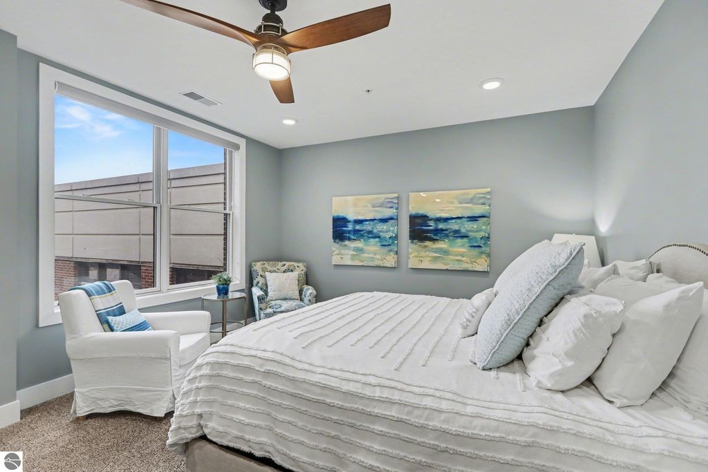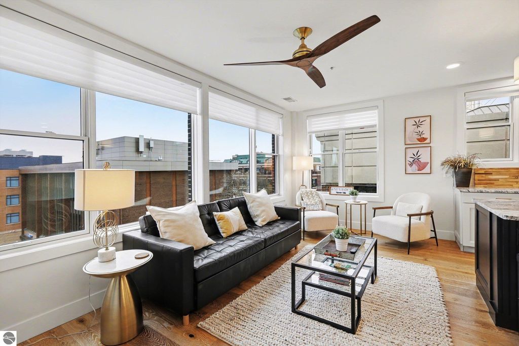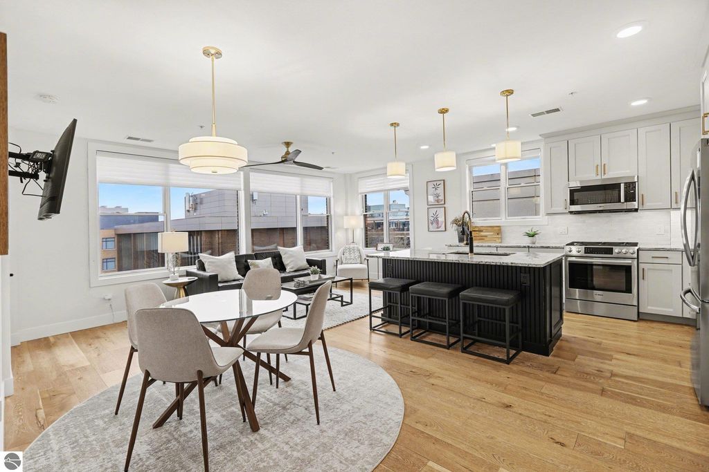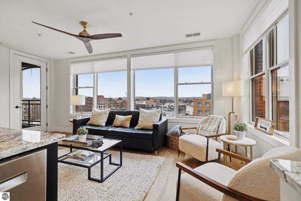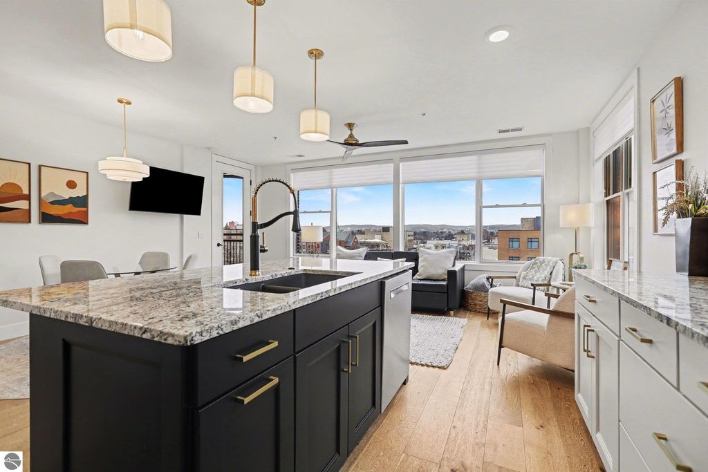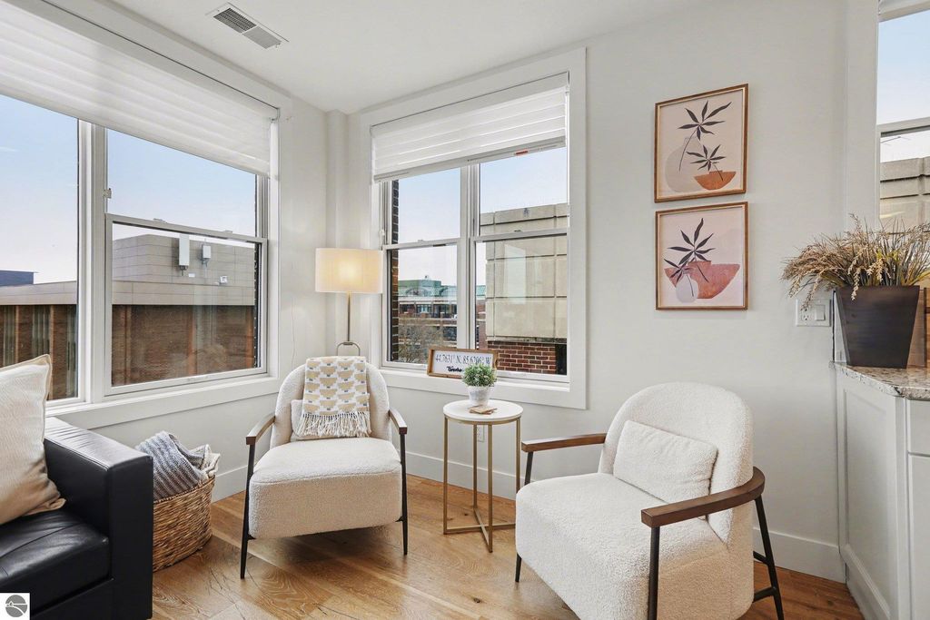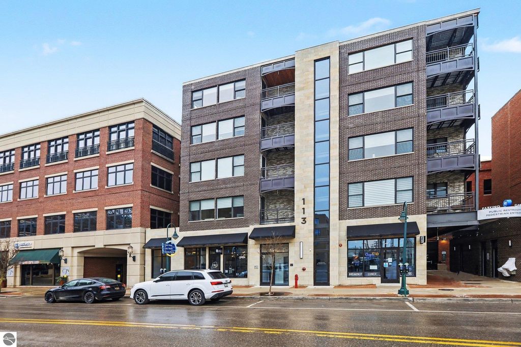 This is the one you have been looking for. Here you will find the ultimate combination- penthouse living, amazing location, & STR income potential. Enjoy elevated downtown living in Traverse City. Located between Front and State, this top-floor residence is walking distance to Front Street, a variety of restaurants, shopping, and the TART Trail. West Bay is only a block away, making this the ideal home base for both urban convenience and waterfront enjoyment. This beautiful condo features exceptional privacy with only 8 condos in the building, no shared walls, and only two units on the level. Thoughtful design and high-end finishes define the space, including 9-foot ceilings, open floor plan design, granite countertops, hardwood flooring, secure entrance, elevator, convenient parking, and a private balcony with views of the Bay. Whether you are looking for a personal residence, an investment property for your portfolio, or both, this fabulous condo checks all the boxes. Make it yours today.