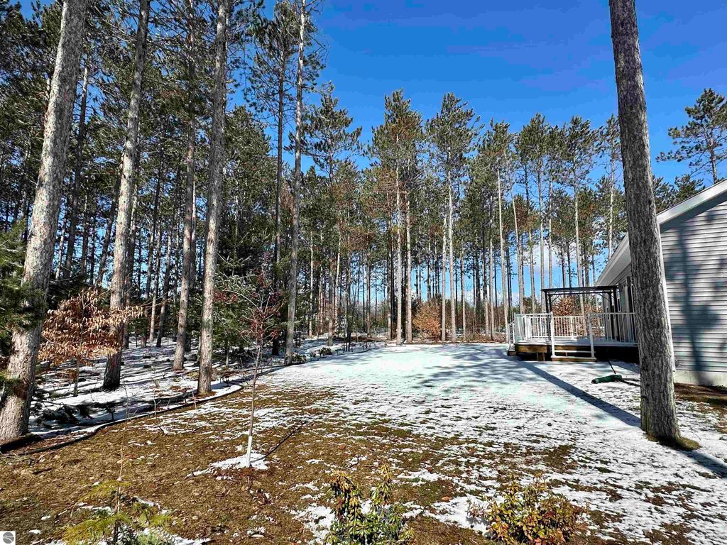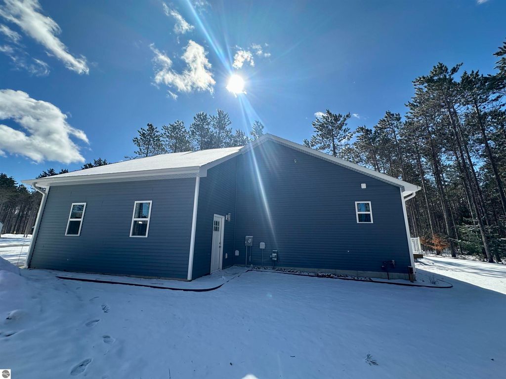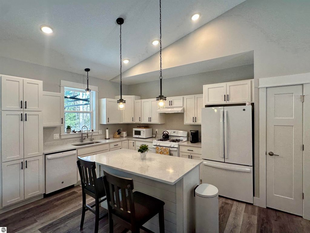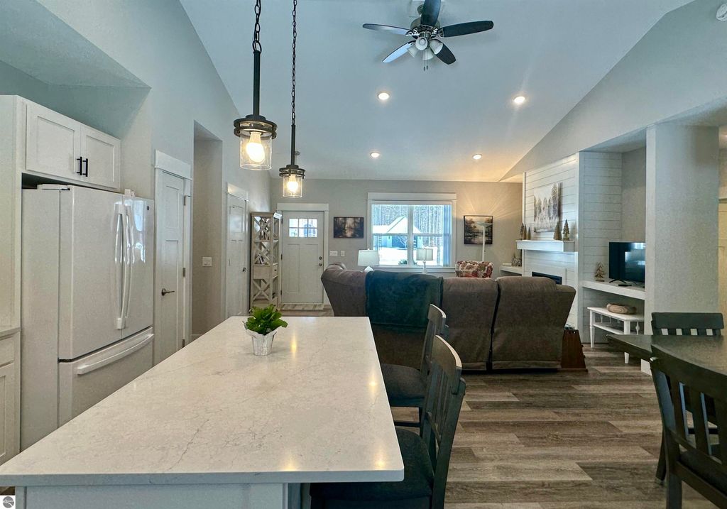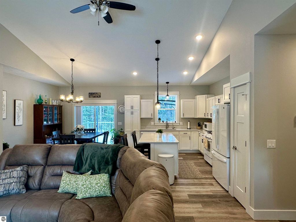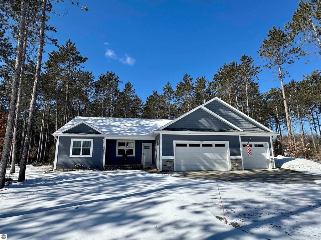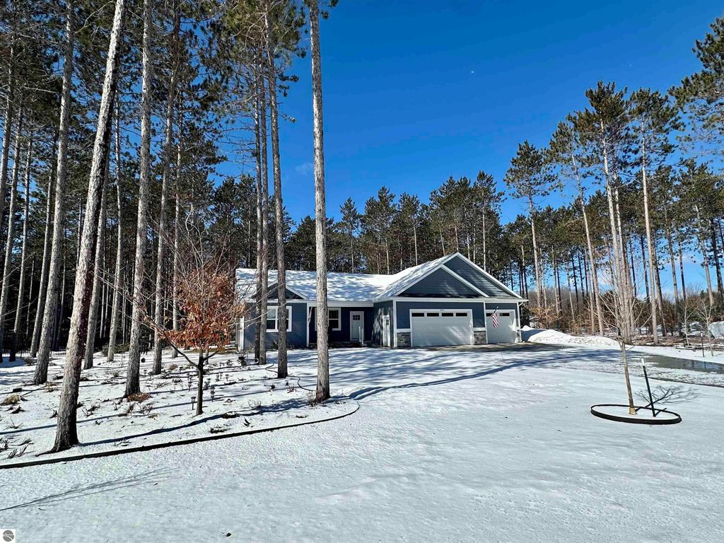 Stunning newer construction ranch built in 2023 featuring a fully finished lower level with full in-law suite completed in 2025, offering four bedrooms, three bathrooms, and just under 3,000 finished square feet of thoughtfully designed living space. The main floor showcases an open-concept layout with vaulted ceilings and abundant natural light, highlighted by a quartz kitchen and large island providing additional storage and gathering space. The private primary suite is situated on its own side of the home and features tray ceilings, a spacious walk-in closet, and a luxurious bathroom with double vanity and a tiled walk-in shower. Two additional bedrooms, a full bathroom, and convenient main-floor laundry complete the main level. The finished lower level expands the home with a massive family room flowing into a full second kitchen, along with a spacious fourth bedroom with walk-in closet and an oversized bathroom, creating ideal space for extended guests or multi-generational living. Situated on just under an acre and surrounded by mature hardwoods in a newer neighborhood with a shared path leading to a natural area, the property also features natural gas, a finished attached three-car garage, and a 12' x 20' composite deck with awning. Located just minutes from the Gilbert Park boat launch and only 20 minutes from Traverse City.