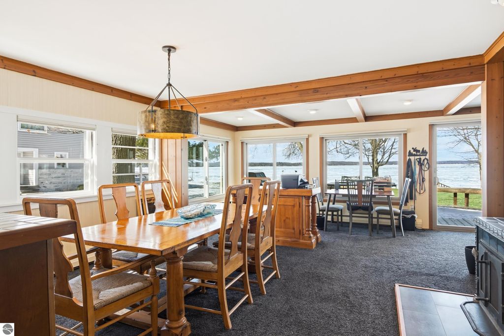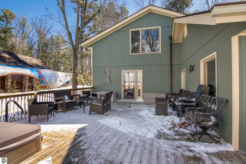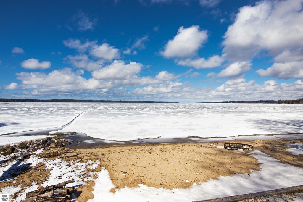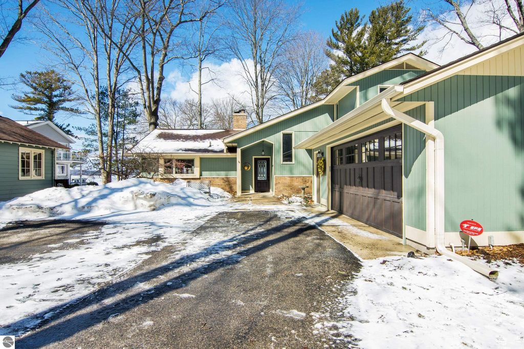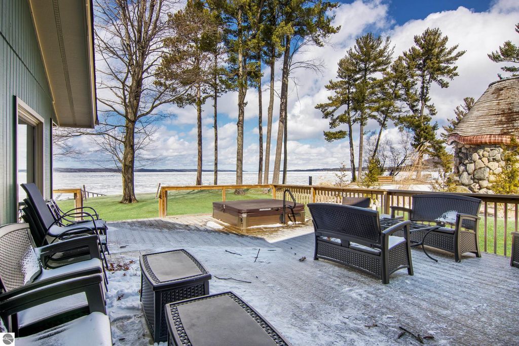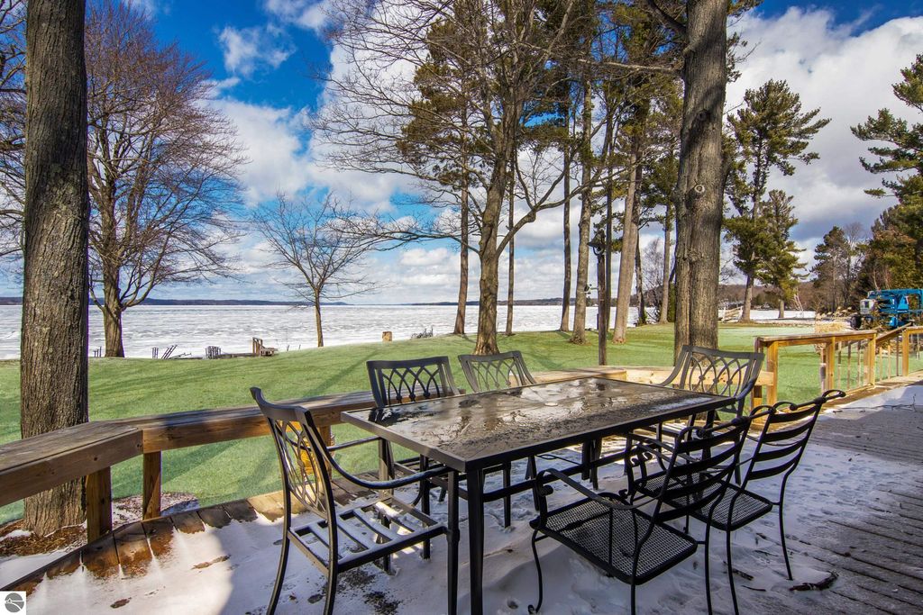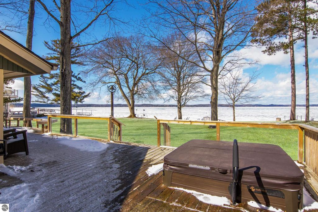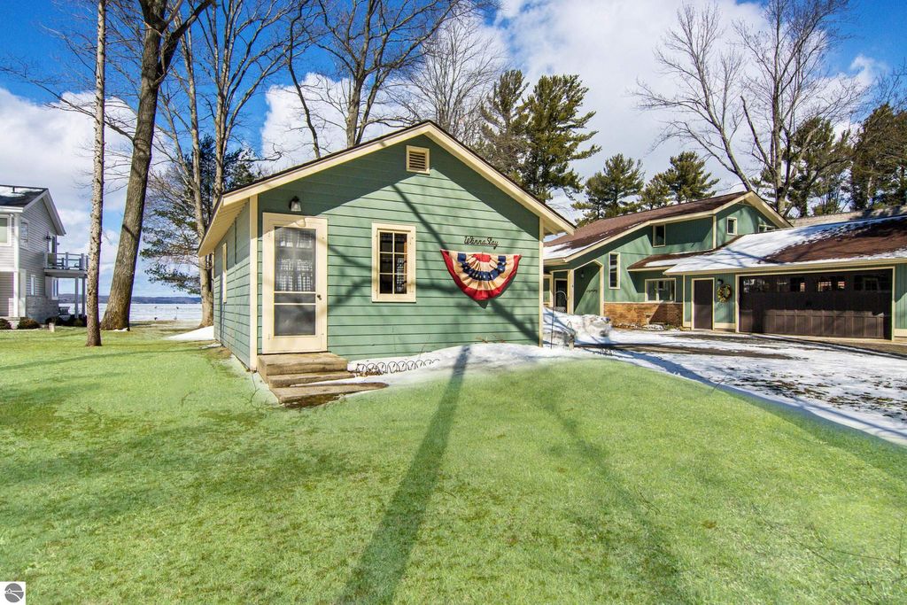 ONE OF THE BEST BEACHES ON TORCH LAKE with 103' of sandy frontage just came on the market! As you enter the spacious foyer you will be impressed with the lake views. The inviting living room is enhanced by a gorgeous stone fireplace, picturesque windows facing your private frontage and unique cedar ceiling. The kitchen features efficient use of space, plentiful cabinetry and large pantry. The dining area offers plenty of natural light and a woodstove with brick surround. The spacious main floor primary bedroom with access to the deck and an ensuite bath. A slider leads you to the large deck and the hot tub will be your place to relax and rejuvenate while listening to the waves lap the shoreline. Upstairs discover a spacious bedroom suite with bath, office/den and lots of storage. Your family and friends will appreciate having their own space in the two bedroom, two full baths separate guest house. The large wrap around deck will be the gathering place where you can enjoy expansive lake views, dining alfresco and end your evening admiring the gorgeous sunset views. Other highlights include a main floor laundry with abundant cabinetry; a steam shower; a workout room; peace of mind with a main floor Generac Generator; underground sprinklers will keep your lawn lush and green; and an oversized 2-car attached garage. The nicely landscaped and wooded setting plus private shared acreage across the street for added privacy and seclusion. Get ready to experience the "lake life" where the turquoise blue Torch Lake water will be your playground. When you are ready to head out on the lake you will find waterfront dining; waterside communities to explore; boating, fishing; sailing and so much more. Four seasons of fun in Northern Michigan are waiting to welcome you with warm smiles and open arms.