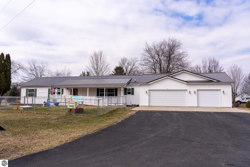 4-bedroom ranch home on 1.5 acres sits on a corner property and boasts driveway access from either Broomfield or Meridian roads which is ideal for added convenience, guest parking, and seamless in-and-out access. Inviting covered front porch and a nice fenced in play area for kids and dogs. Spacious living is open to the kitchen which features lots of cabinet/counter space, quartz counters and stainless-steel appliances. Primary bedroom has coffered ceiling and private bathroom. Main floor has three bedrooms, laundry and offers wheelchair accessibility and step free access to the house from the front door or the garage. Lower level offers a family room, bedroom, kitchenette and a full bath plus other flex space. Newer water heater, furnace, water softener and garage door plus Bluetooth garage door opener. Driveway was resurfaced in 2025. New metal roof with lifetime warranty. House is located directly across from entrance to the 153-acre Meridian Park for hiking, running, and river access for fishing and kayaking/canoeing. Video and audio surveillance on property. Seller is including a one-year home warranty.