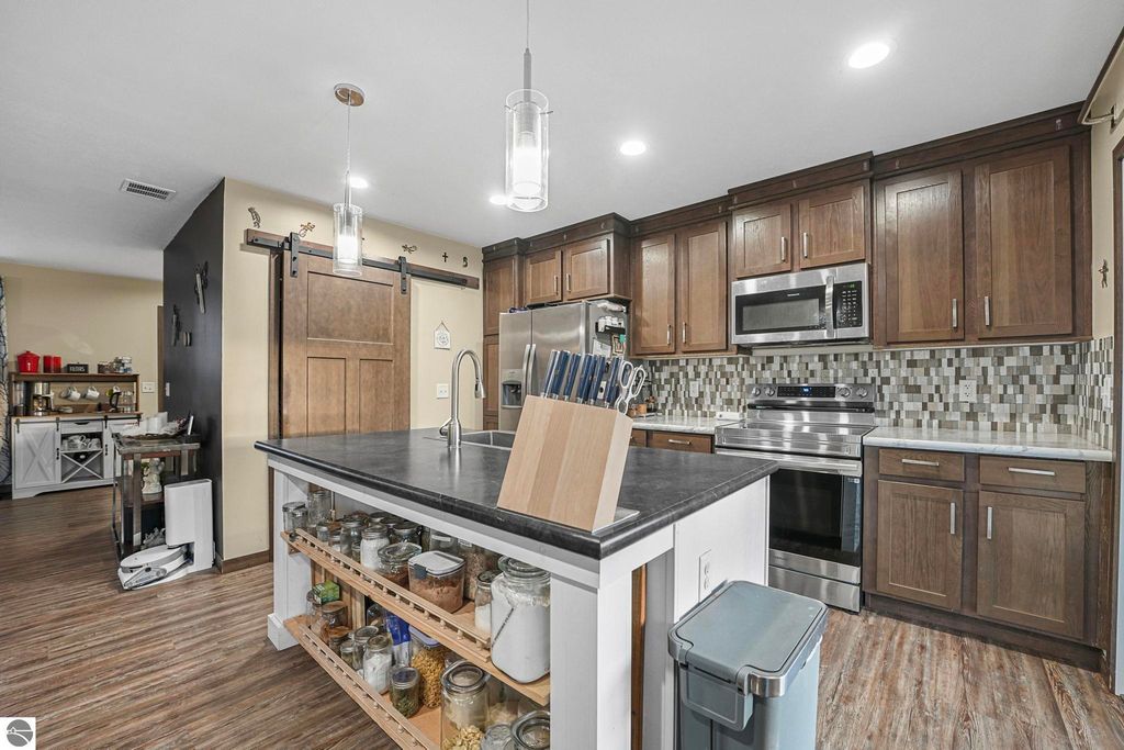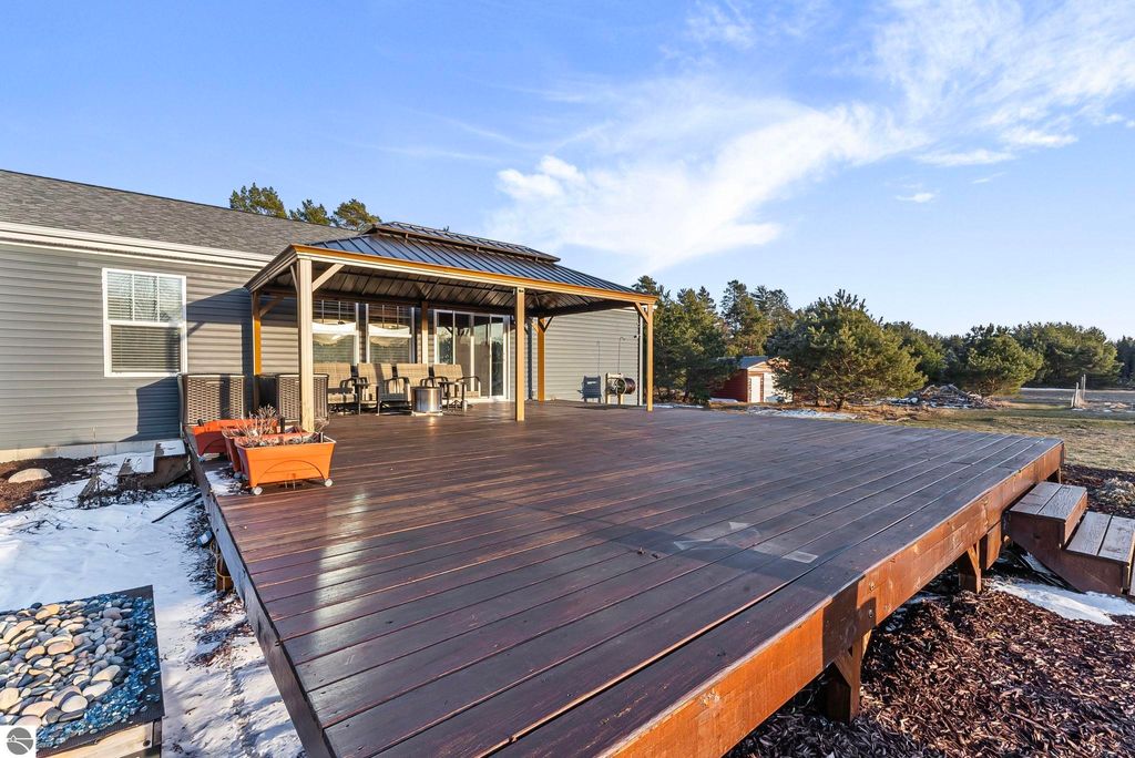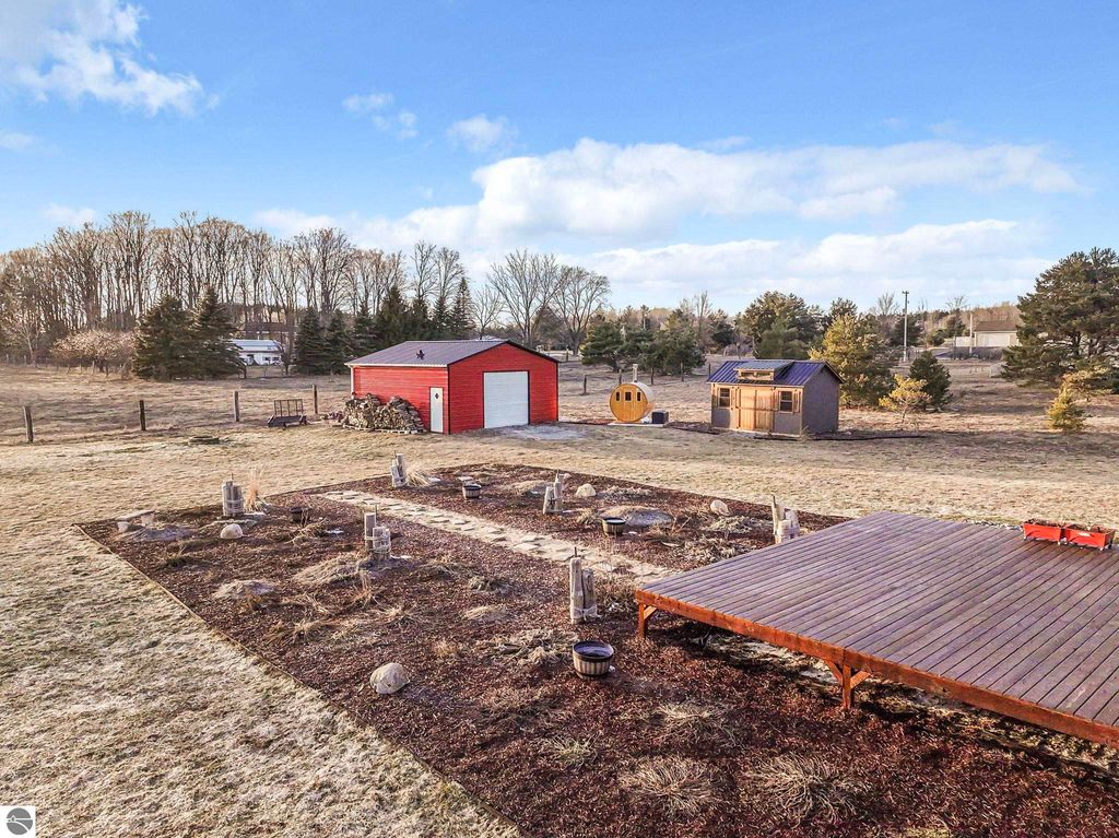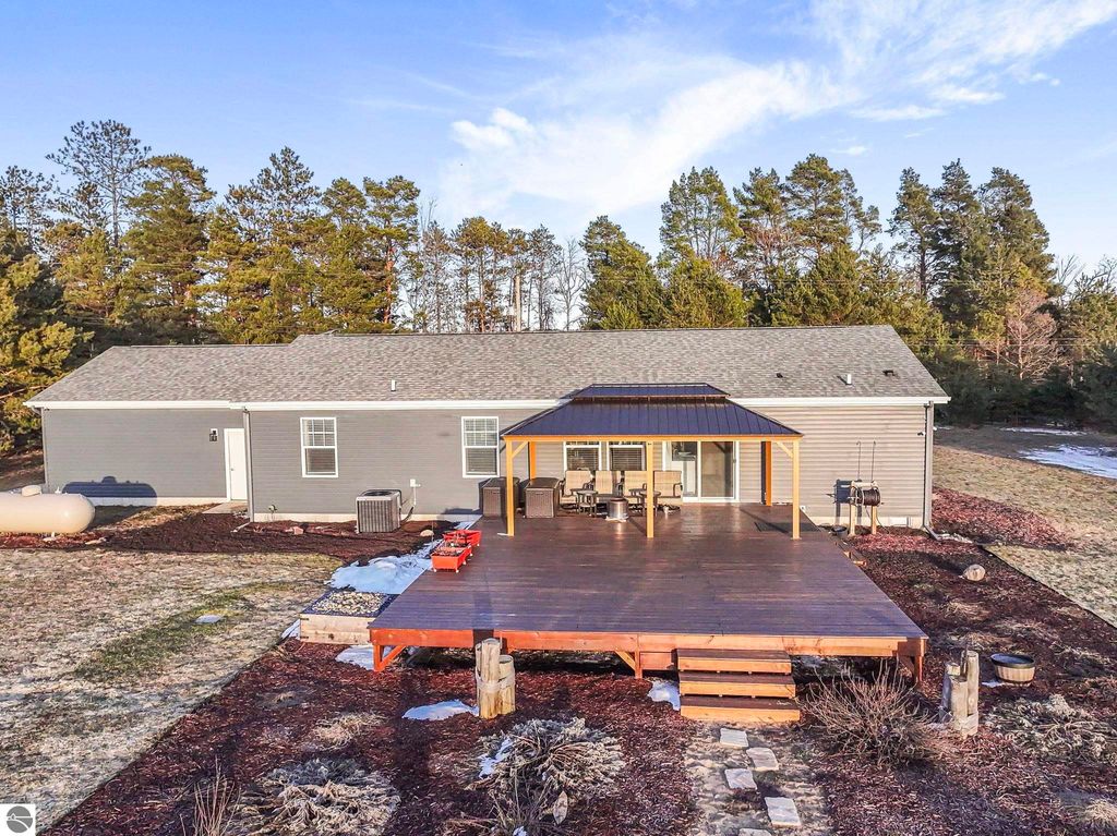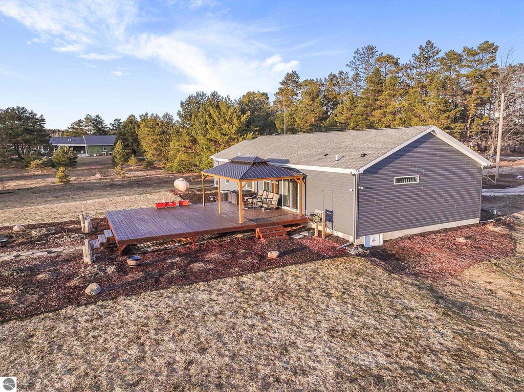 Modern country living on 6.75 acres with multiple outbuildings and outdoor entertaining areas. Built in 2021, this well maintained 3 bedroom, 2 bath home with 2-car attached garage offers the space, privacy, and functionality buyers searching for acreage will appreciate. Inside, the open-concept floor plan connects the kitchen, dining, and living areas, creating a comfortable space for everyday living and entertaining. The split-bedroom layout places two bedrooms on the opposite side of the home from the spacious primary suite, providing privacy for family or guests. The primary bath features a soaking tub and walk-in shower, creating a relaxing retreat. The kitchen boasts a large pantry, newer appliances and an island. Additional features include a laundry/mud room, LED ceiling fans, faux wood blinds throughout, and outside camera security system. Outdoor living is a highlight of this property. A 24x30 deck built in 2024 sits just off the kitchen and includes a 12x20 gazebo with a metal roof, ideal for gatherings, or relaxing evenings. The yard features water-wise landscaping, flower beds that host a variety of birds and wild-life, and a fenced garden area with a 10x16 shed, dual access gates & invisible dog fence. This property offers excellent storage, hobby farm potential, and workshop space with multiple outbuildings including a 24x25 metal barn with cement floor, electricity, wood stove, and remote door opener, a 20x30 metal barn, and two 10x16 Amish-built sheds. Recent upgrades include central air (2024), epoxy garage floor with lifetime warranty (2024), seamless gutters (2022), invisible pet fence, and a Reolink 360 degree smart security system. Located 3 minutes north of everything the North end of Cadillac has to offer, shops, restaurants, grocery stores etc. and 9 minutes to downtown Manton. This home provides ease of living in the country while still being close to everything you could possibly need. Don't delay!