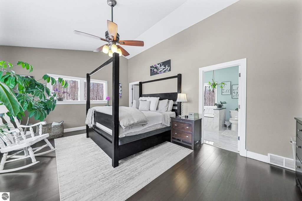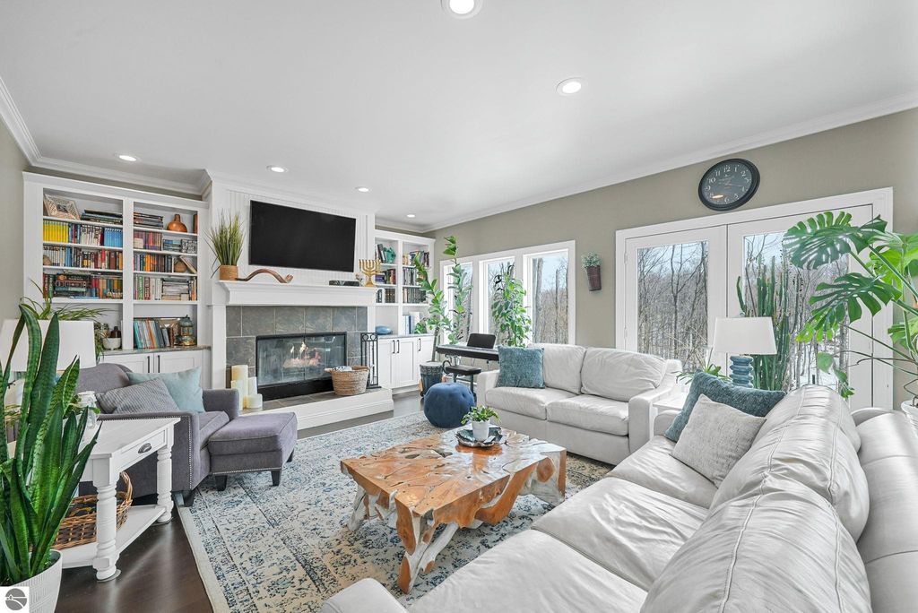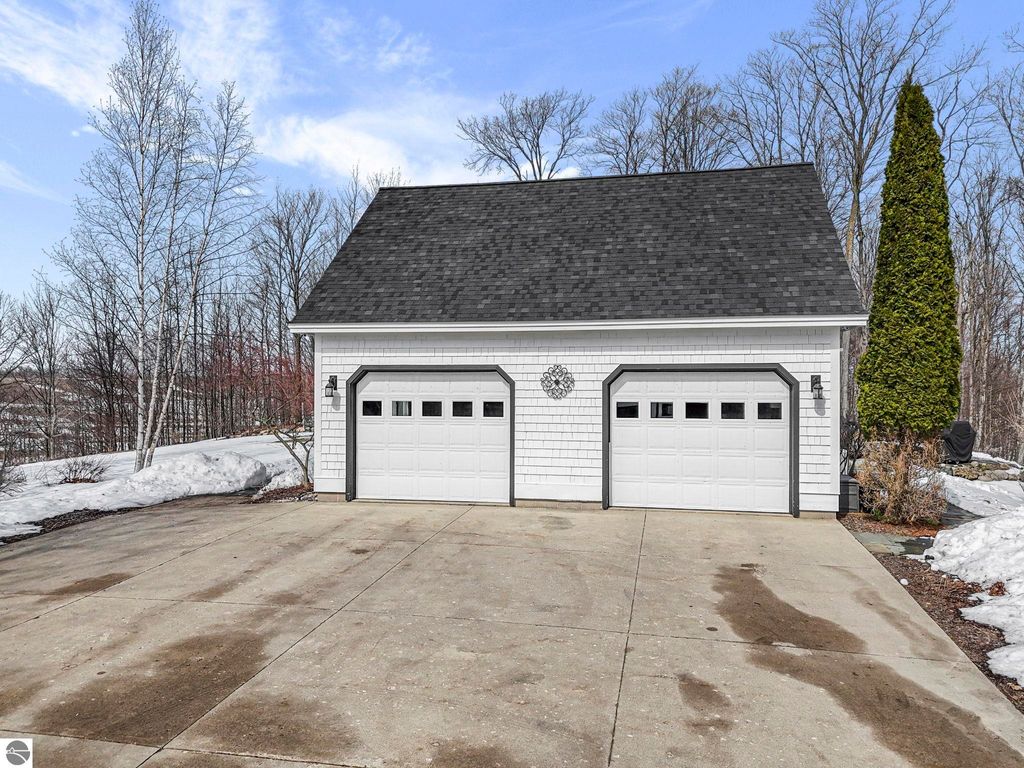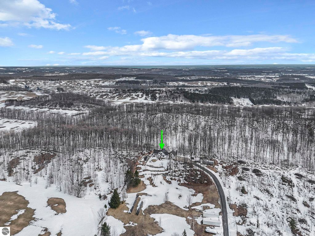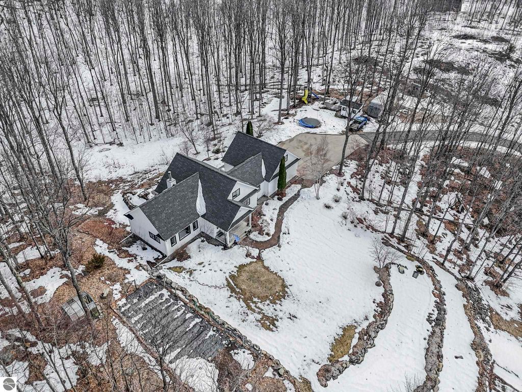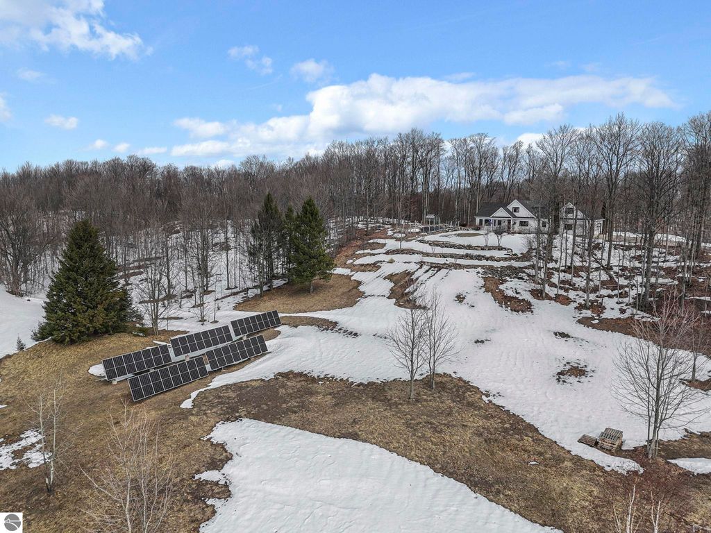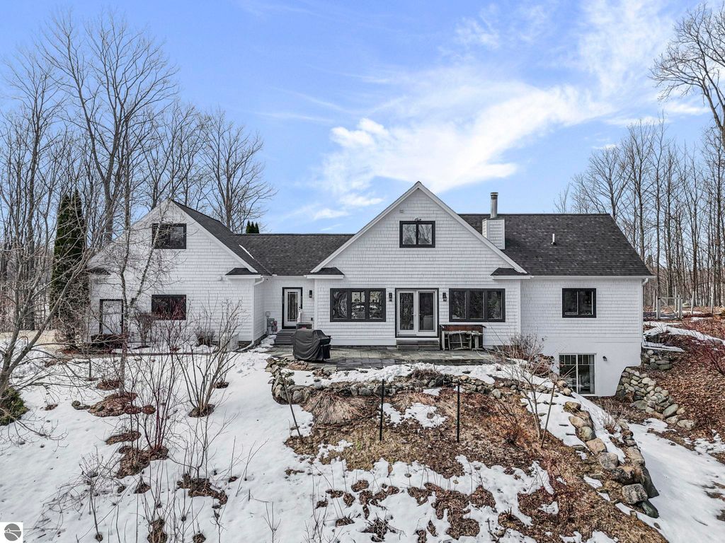 Escape to your own private oasis on 10 rolling acres in highly sought-after Leelanau County, where refined comfort meets natural beauty. This exceptional 1.5-story home offers an abundance of finished sq. ft. with a light filled open design ideal for both everyday living and entertaining. Featuring 4 bedrooms, 3.5 baths, and a versatile bonus room, the home showcases quality throughout. The newly remodeled island kitchen is appointed with stainless steel appliances, granite countertops and abundant cabinetry, while rich hardwood flooring flows through the main level. The inviting living room features a wood-burning fireplace, built-ins & access to rear patio. Main floor primary suite offers a spa like en-suite with soaking tub and tiled walk-in shower. Finished walkout lower level offers family area, rec-area, office area, gas log fireplace, 4th bedroom, full bath and storage rooms. Additional highlights include a finished heated garage, main floor laundry/mudroom, back-up generator and solar panels, fiber optic internet via point broadband service. Thoughtfully designed outdoor spaces with multiple seating areas and extensive landscaping create a serene setting. Enjoy peaceful privacy just a short drive to Lake Michigan, Inland Lakes and nearby villages. Take in all that Pure Leelanau County has to offer!