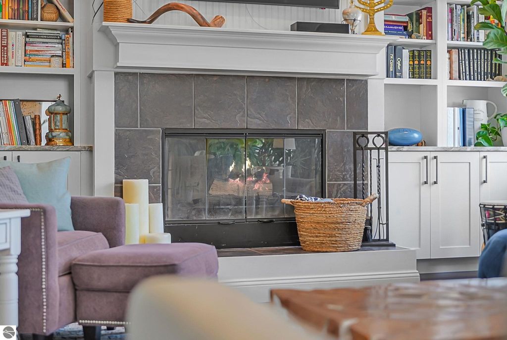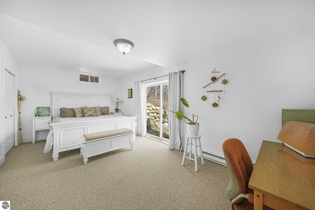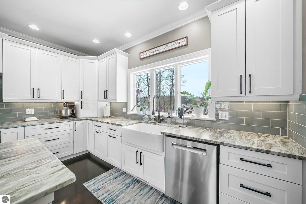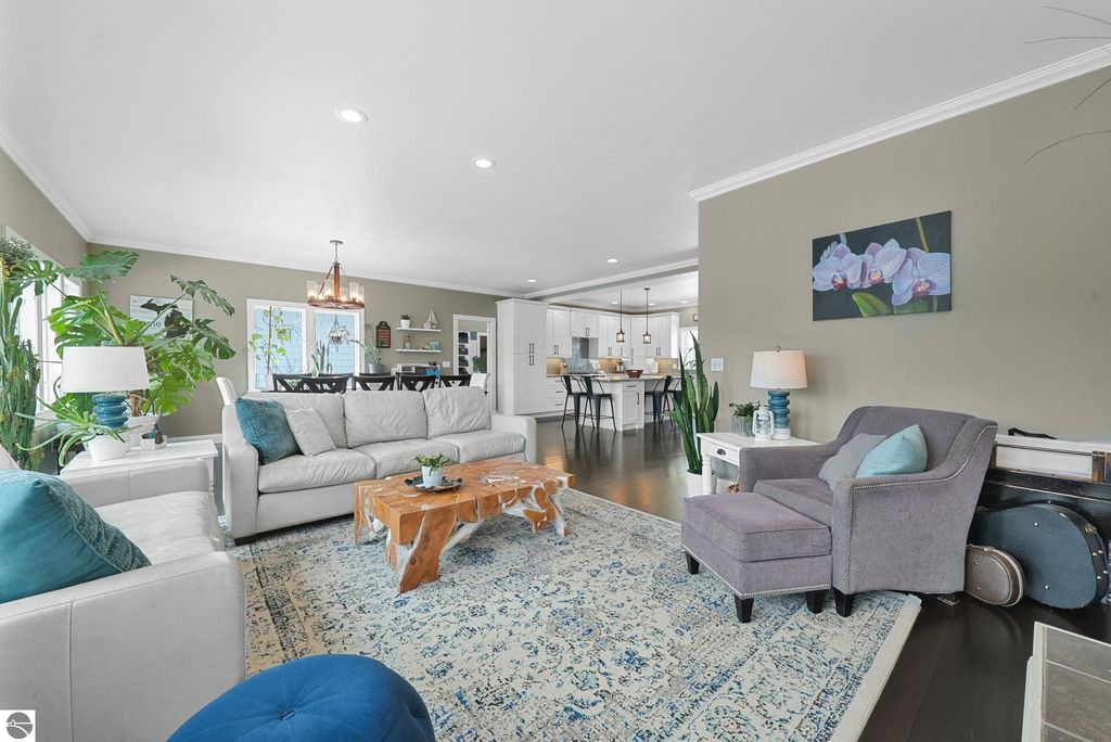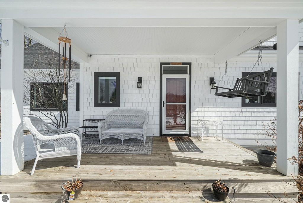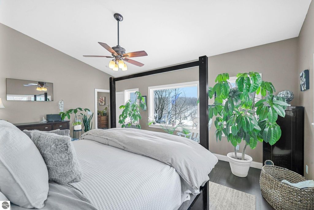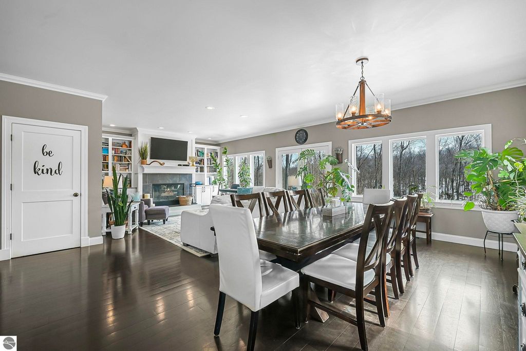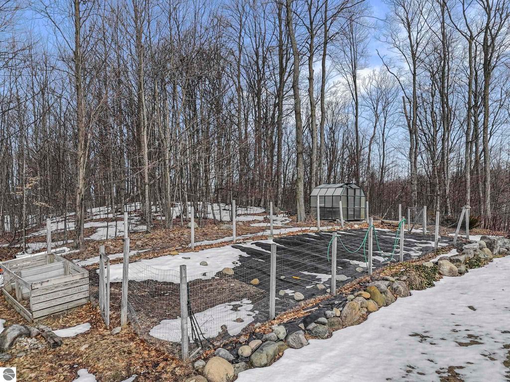 Escape to your own private oasis on 10 rolling acres in highly sought-after Leelanau County, where refined comfort meets natural beauty. This exceptional 1.5-story home offers an abundance of finished sq. ft. with a light filled open design ideal for both everyday living and entertaining. Featuring 4 bedrooms, 3.5 baths, and a versatile bonus room, the home showcases quality throughout. The newly remodeled island kitchen is appointed with stainless steel appliances, granite countertops and abundant cabinetry, while rich hardwood flooring flows through the main level. The inviting living room features a wood-burning fireplace, built-ins & access to rear patio. Main floor primary suite offers a spa like en-suite with soaking tub and tiled walk-in shower. Finished walkout lower level offers family area, rec-area, office area, gas log fireplace, 4th bedroom, full bath and storage rooms. Additional highlights include a finished heated garage, main floor laundry/mudroom, back-up generator and solar panels, fiber optic internet via point broadband service. Thoughtfully designed outdoor spaces with multiple seating areas and extensive landscaping create a serene setting. Enjoy peaceful privacy just a short drive to Lake Michigan, Inland Lakes and nearby villages. Take in all that Pure Leelanau County has to offer!