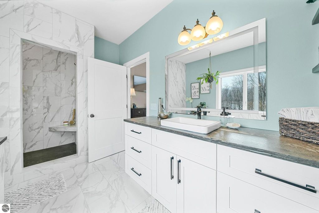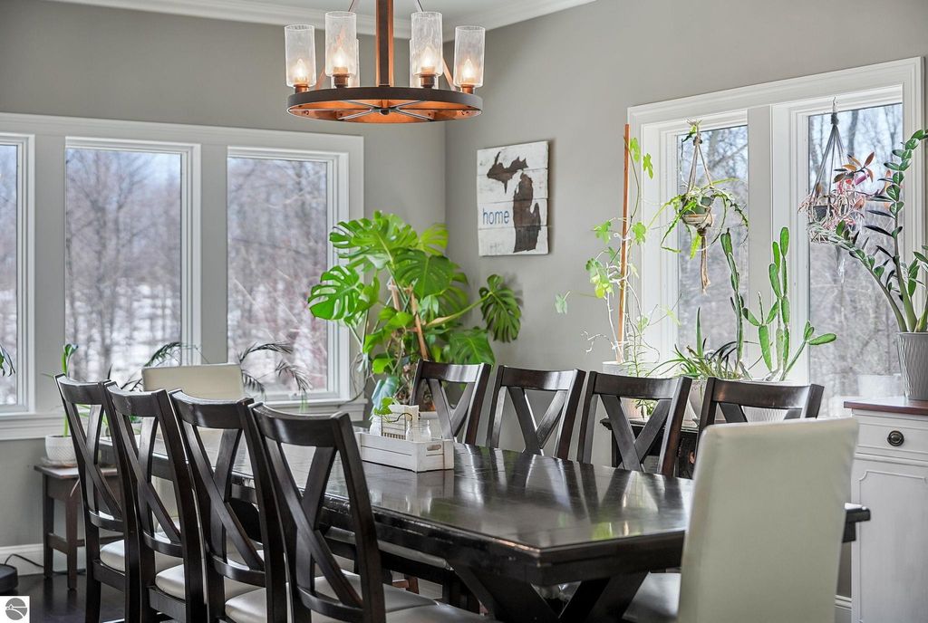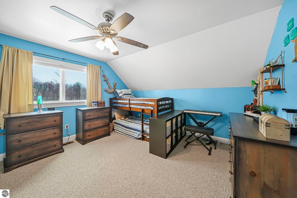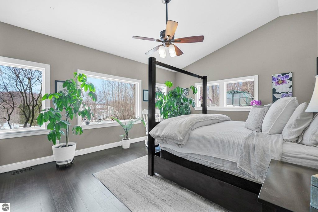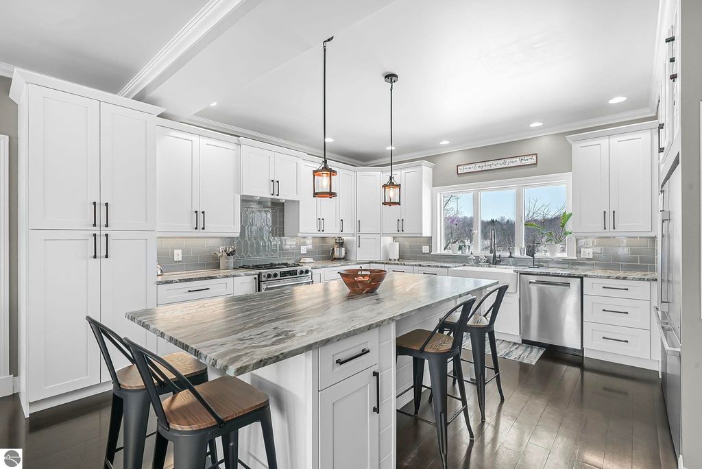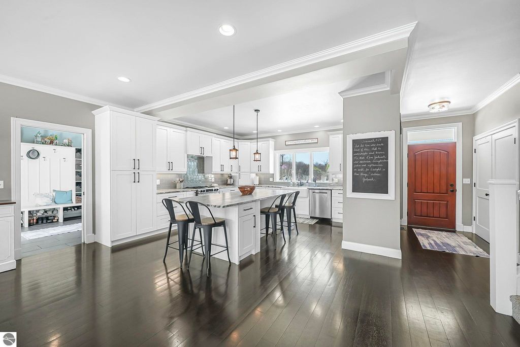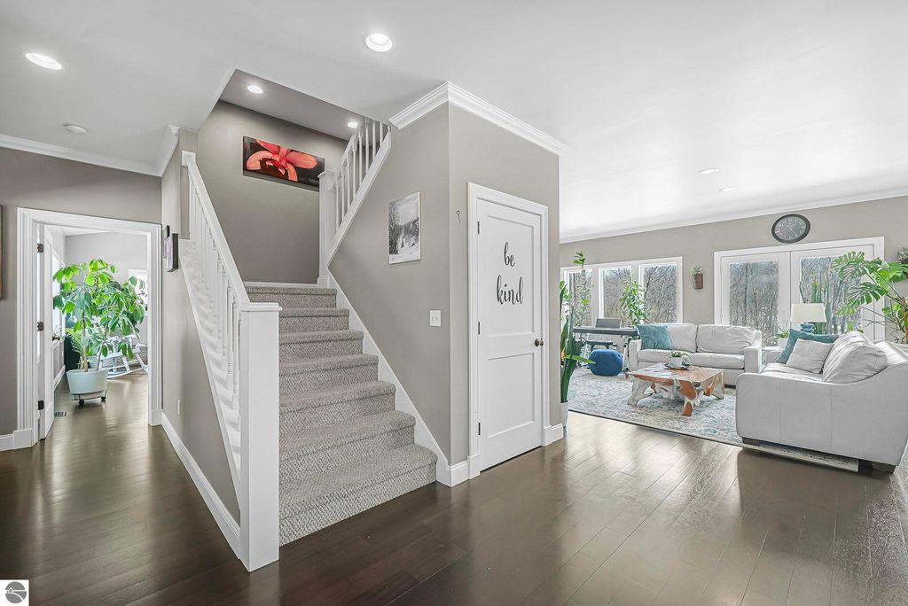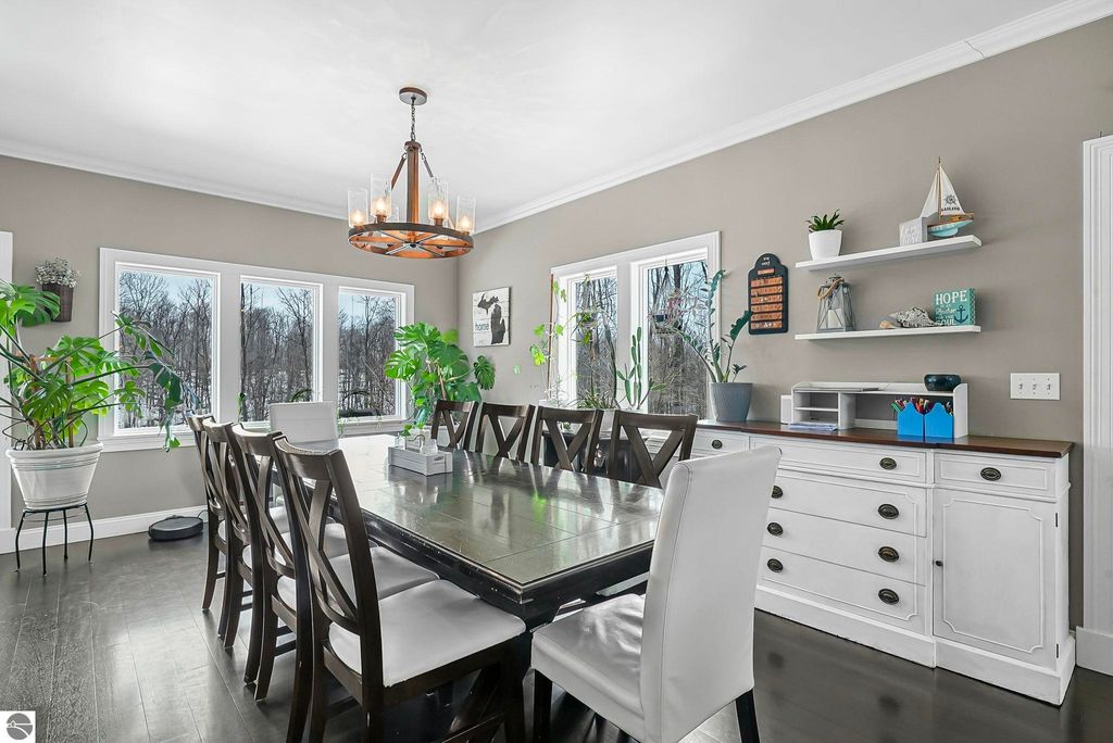 Escape to your own private oasis on 10 rolling acres in highly sought-after Leelanau County, where refined comfort meets natural beauty. This exceptional 1.5-story home offers an abundance of finished sq. ft. with a light filled open design ideal for both everyday living and entertaining. Featuring 4 bedrooms, 3.5 baths, and a versatile bonus room, the home showcases quality throughout. The newly remodeled island kitchen is appointed with stainless steel appliances, granite countertops and abundant cabinetry, while rich hardwood flooring flows through the main level. The inviting living room features a wood-burning fireplace, built-ins & access to rear patio. Main floor primary suite offers a spa like en-suite with soaking tub and tiled walk-in shower. Finished walkout lower level offers family area, rec-area, office area, gas log fireplace, 4th bedroom, full bath and storage rooms. Additional highlights include a finished heated garage, main floor laundry/mudroom, back-up generator and solar panels, fiber optic internet via point broadband service. Thoughtfully designed outdoor spaces with multiple seating areas and extensive landscaping create a serene setting. Enjoy peaceful privacy just a short drive to Lake Michigan, Inland Lakes and nearby villages. Take in all that Pure Leelanau County has to offer!