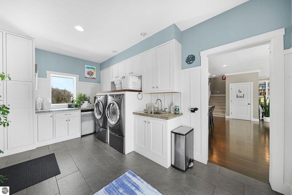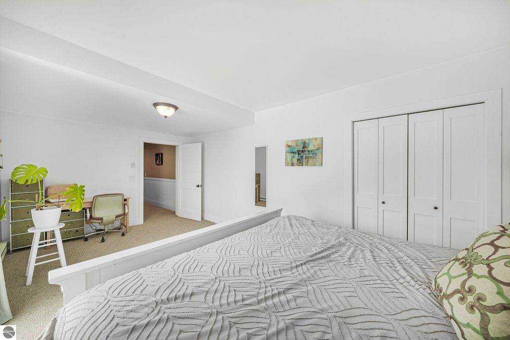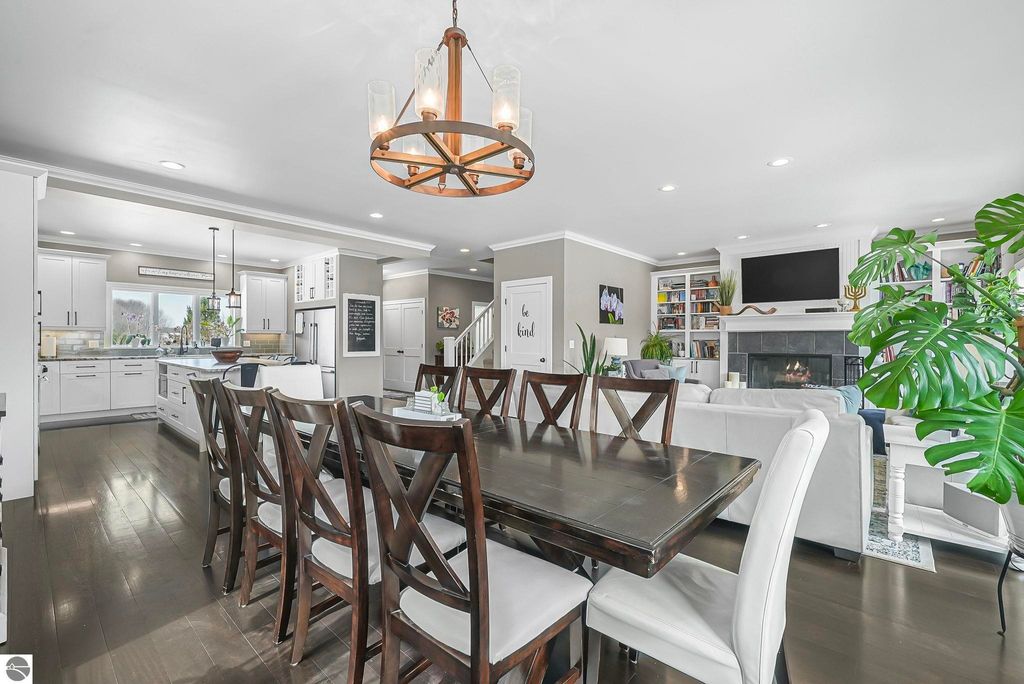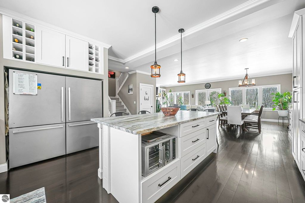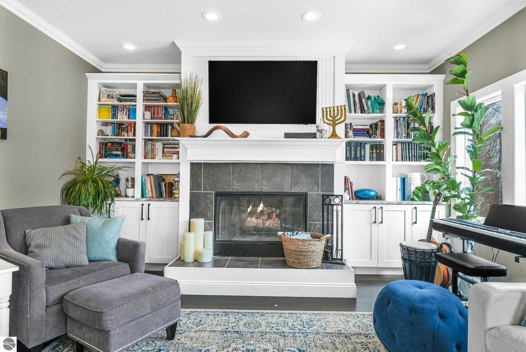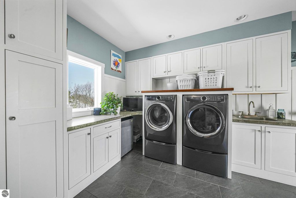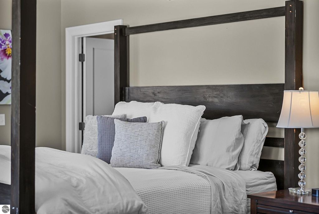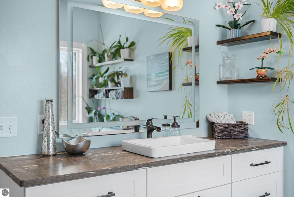 Escape to your own private oasis on 10 rolling acres in highly sought-after Leelanau County, where refined comfort meets natural beauty. This exceptional 1.5-story home offers an abundance of finished sq. ft. with a light filled open design ideal for both everyday living and entertaining. Featuring 4 bedrooms, 3.5 baths, and a versatile bonus room, the home showcases quality throughout. The newly remodeled island kitchen is appointed with stainless steel appliances, granite countertops and abundant cabinetry, while rich hardwood flooring flows through the main level. The inviting living room features a wood-burning fireplace, built-ins & access to rear patio. Main floor primary suite offers a spa like en-suite with soaking tub and tiled walk-in shower. Finished walkout lower level offers family area, rec-area, office area, gas log fireplace, 4th bedroom, full bath and storage rooms. Additional highlights include a finished heated garage, main floor laundry/mudroom, back-up generator and solar panels, fiber optic internet via point broadband service. Thoughtfully designed outdoor spaces with multiple seating areas and extensive landscaping create a serene setting. Enjoy peaceful privacy just a short drive to Lake Michigan, Inland Lakes and nearby villages. Take in all that Pure Leelanau County has to offer!