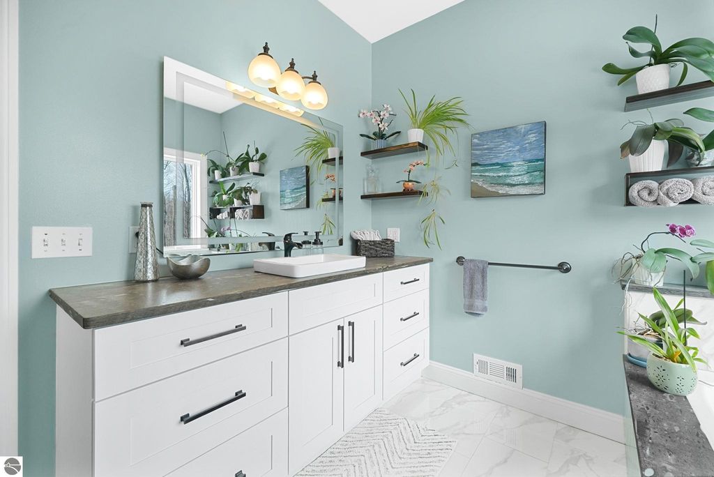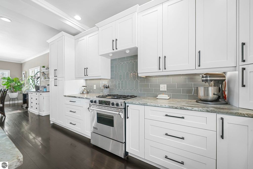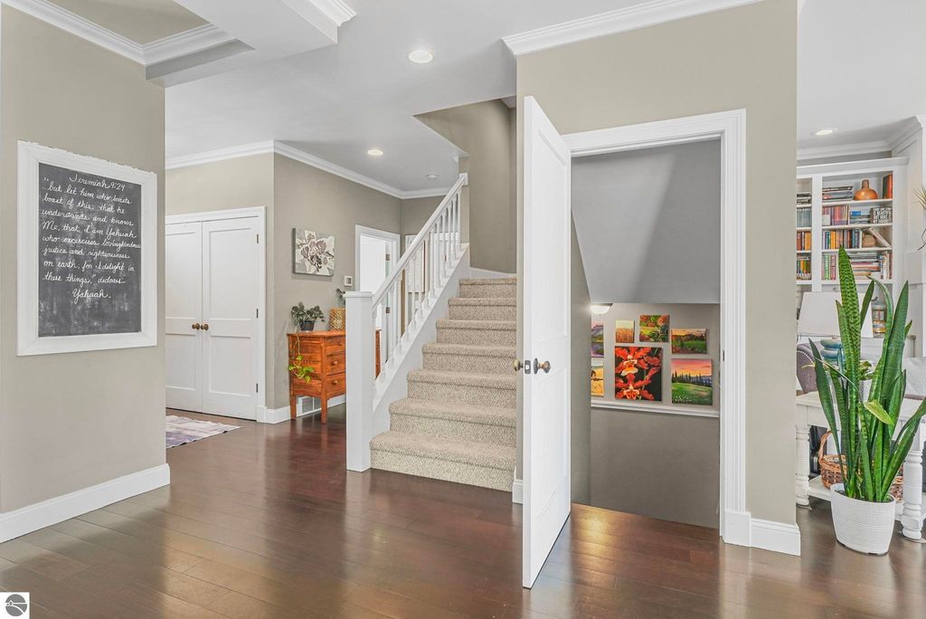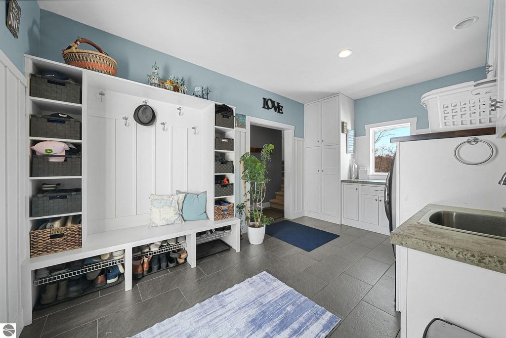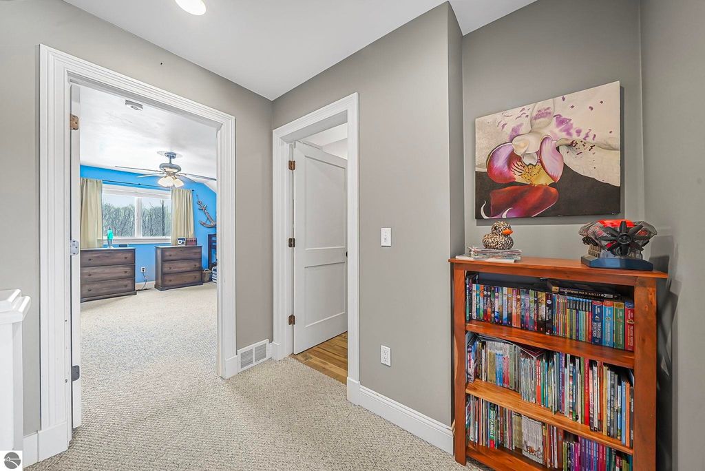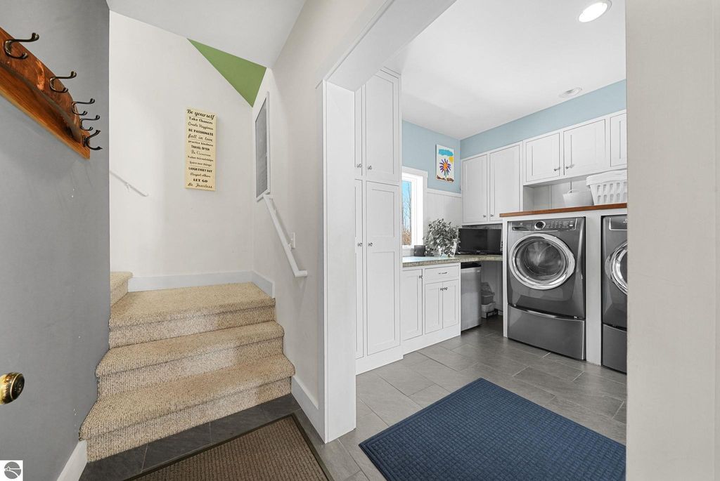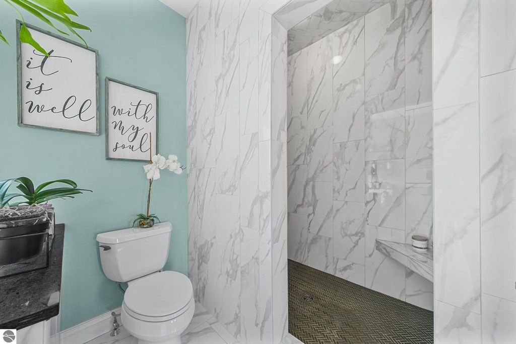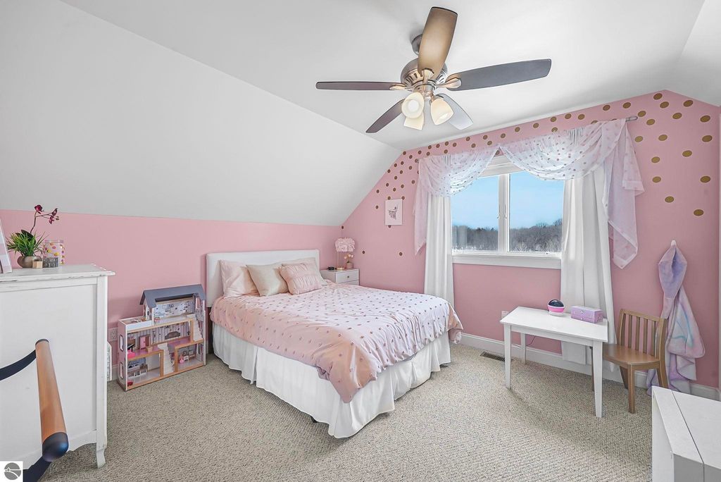 Escape to your own private oasis on 10 rolling acres in highly sought-after Leelanau County, where refined comfort meets natural beauty. This exceptional 1.5-story home offers an abundance of finished sq. ft. with a light filled open design ideal for both everyday living and entertaining. Featuring 4 bedrooms, 3.5 baths, and a versatile bonus room, the home showcases quality throughout. The newly remodeled island kitchen is appointed with stainless steel appliances, granite countertops and abundant cabinetry, while rich hardwood flooring flows through the main level. The inviting living room features a wood-burning fireplace, built-ins & access to rear patio. Main floor primary suite offers a spa like en-suite with soaking tub and tiled walk-in shower. Finished walkout lower level offers family area, rec-area, office area, gas log fireplace, 4th bedroom, full bath and storage rooms. Additional highlights include a finished heated garage, main floor laundry/mudroom, back-up generator and solar panels, fiber optic internet via point broadband service. Thoughtfully designed outdoor spaces with multiple seating areas and extensive landscaping create a serene setting. Enjoy peaceful privacy just a short drive to Lake Michigan, Inland Lakes and nearby villages. Take in all that Pure Leelanau County has to offer!