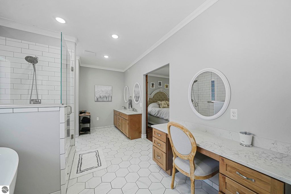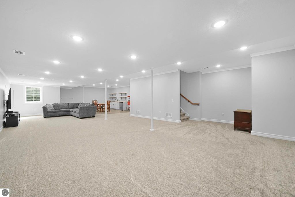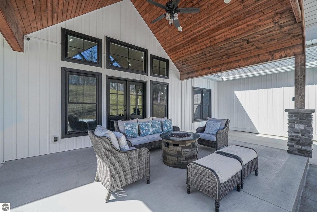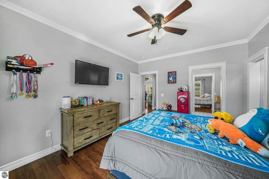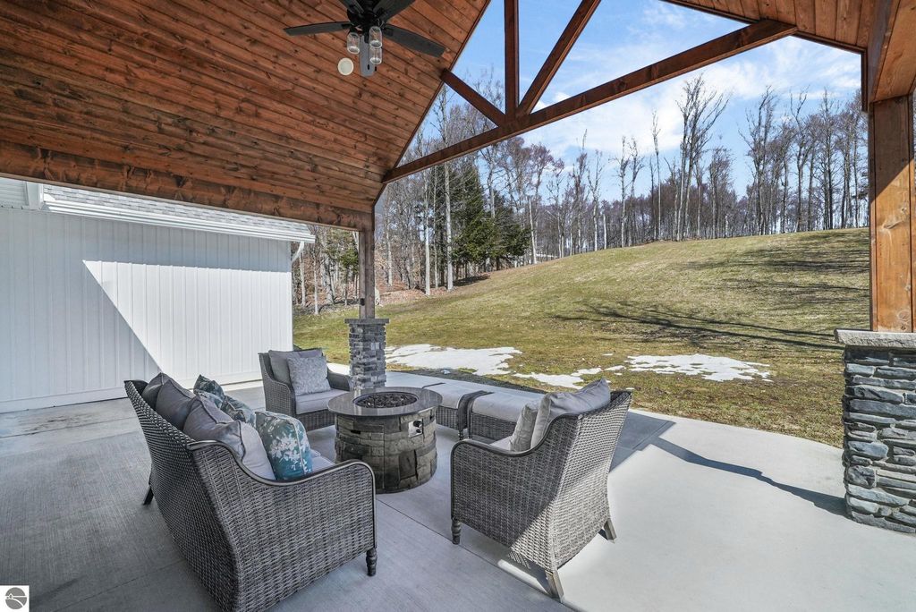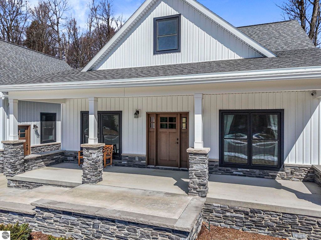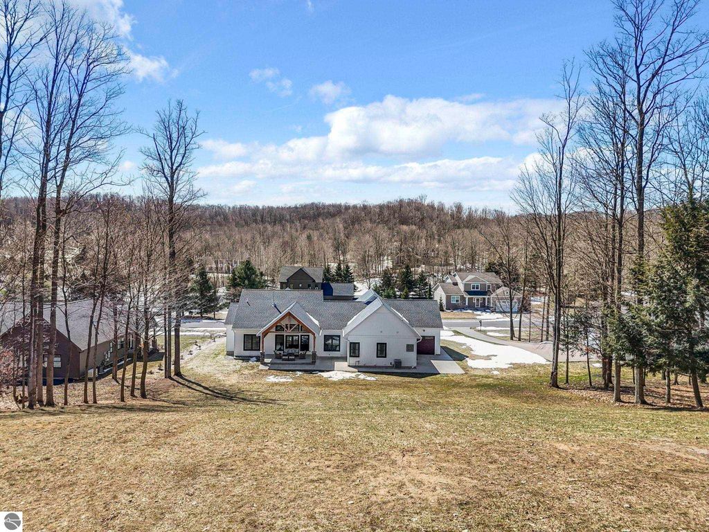 This stunning custom-built home showcases exceptional attention to detail throughout. Nestled in desirable Leelanau Highlands and if you are looking for space, this home delivers. Offering plenty of room to live, relax and entertain. Bright, open living areas feature cathedral ceilings and rich hardwood and tile flooring throughout the main level. The gracious living room with fireplace flows seamlessly to a large covered rear porch perfect for outdoor entertaining. The island kitchen is thoughtfully designed with butcher block countertops, stainless double wall ovens, gas cook top and a walk-in pantry. Enjoy the ease of main floor living, including a spacious primary suite with a well-appointed en-suite featuring a soaking tub, tiled walk-in shower, and walk-in closet. Two additional bedrooms are thoughtfully situated with a Jack and Jill bath. The finished lower level expands your living space with a large family room, wet bar, fourth bedroom, and full bath. A mudroom and half bath are conveniently located off the finished three-car garage, which includes a drive-thru stall. Experience the beauty and serenity of Leelanau County living, just a short drive from Traverse City.