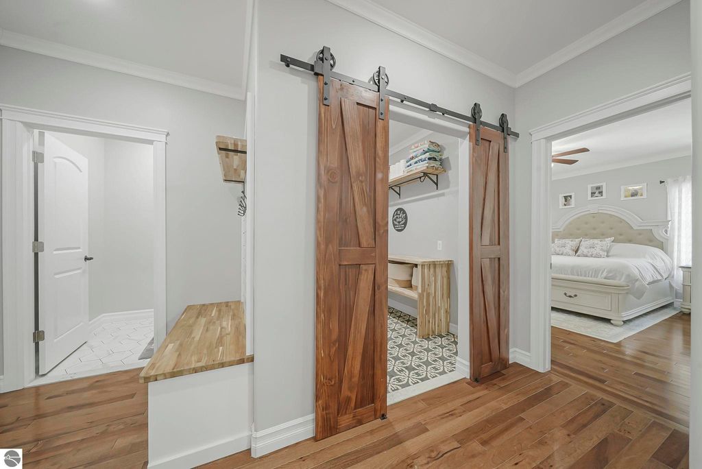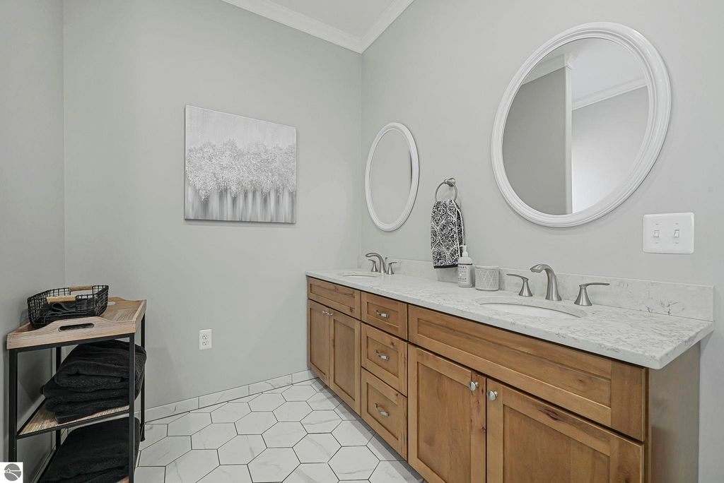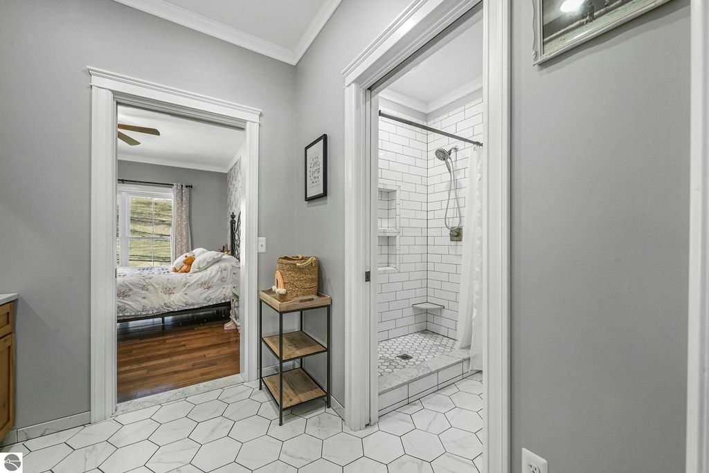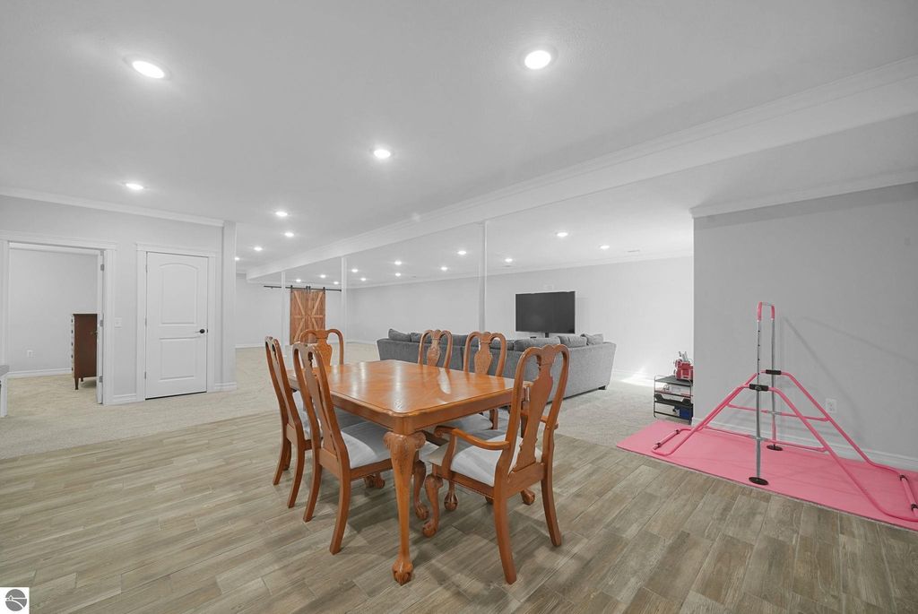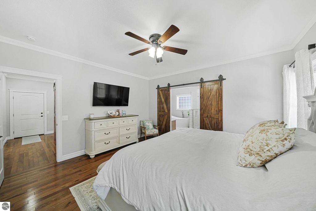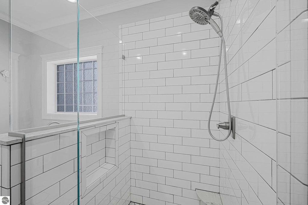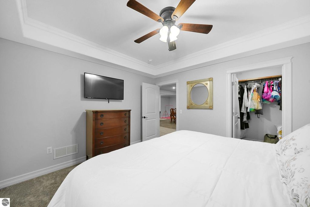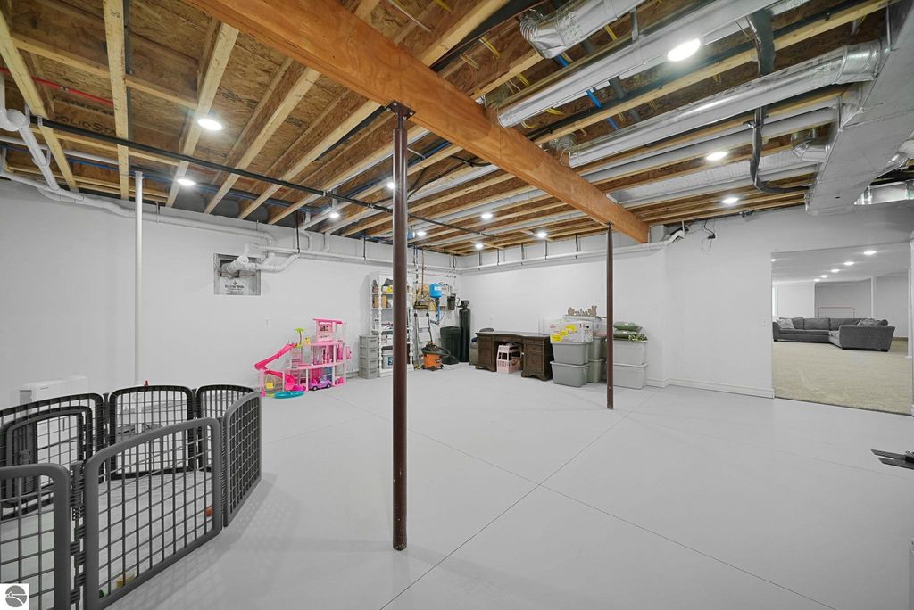 This stunning custom-built home showcases exceptional attention to detail throughout. Nestled in desirable Leelanau Highlands and if you are looking for space, this home delivers. Offering plenty of room to live, relax and entertain. Bright, open living areas feature cathedral ceilings and rich hardwood and tile flooring throughout the main level. The gracious living room with fireplace flows seamlessly to a large covered rear porch perfect for outdoor entertaining. The island kitchen is thoughtfully designed with butcher block countertops, stainless double wall ovens, gas cook top and a walk-in pantry. Enjoy the ease of main floor living, including a spacious primary suite with a well-appointed en-suite featuring a soaking tub, tiled walk-in shower, and walk-in closet. Two additional bedrooms are thoughtfully situated with a Jack and Jill bath. The finished lower level expands your living space with a large family room, wet bar, fourth bedroom, and full bath. A mudroom and half bath are conveniently located off the finished three-car garage, which includes a drive-thru stall. Experience the beauty and serenity of Leelanau County living, just a short drive from Traverse City.