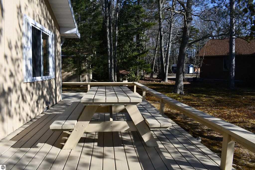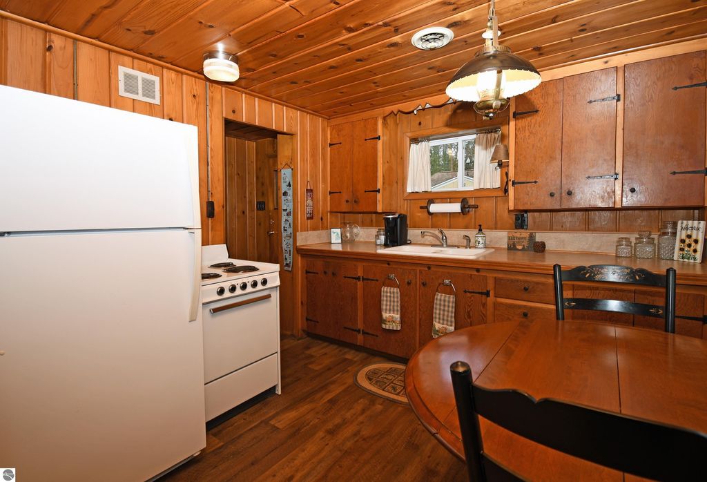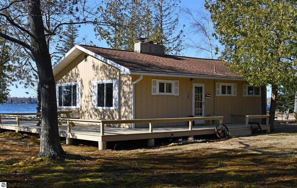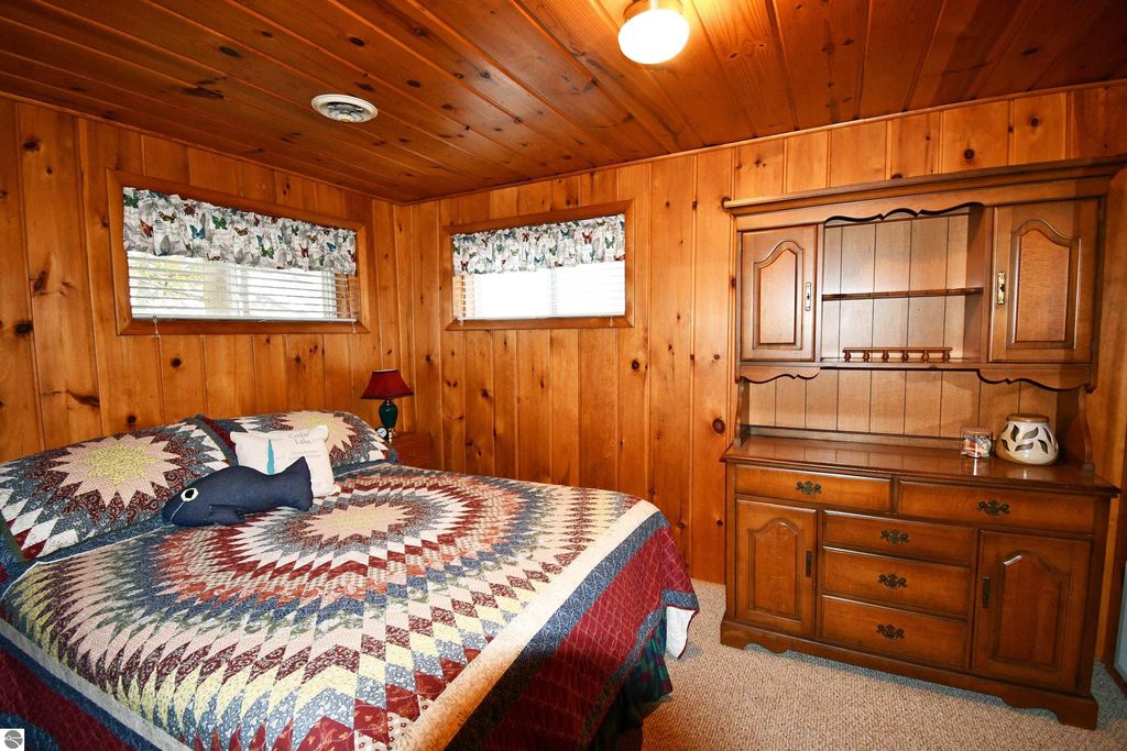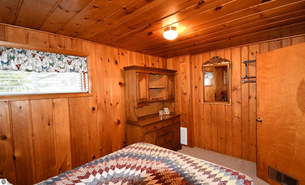 Embrace the Up North lifestyle in this traditional two-bedroom knotty pine cottage in Greenbush. Tucked away on a sprawling double-lot property spanning over an acre, this retreat offers rare privacy and room to breathe with 154 feet of private frontage on Cedar Lake. Inside, the warm knotty pine interior radiates rustic character, centered around a cozy fireplace. The home is equipped with natural gas heat for year-round comfort. Outside, an expansive wrap-around deck provides spectacular, panoramic views of the water, leading to your own sandy beach. The property also includes a detached two-car garage, offering plenty of space for vehicles and water toys. Ideally located for nature lovers, you are just minutes from the pristine shores of Lake Huron and the world-class fishing of the AuSable River.
