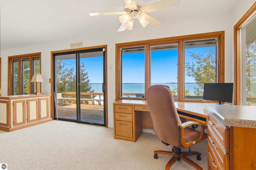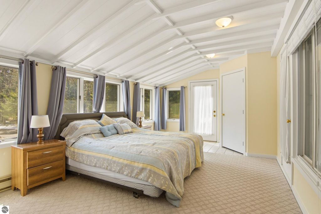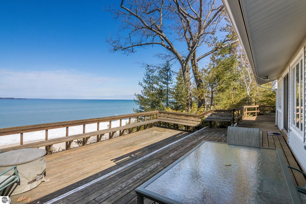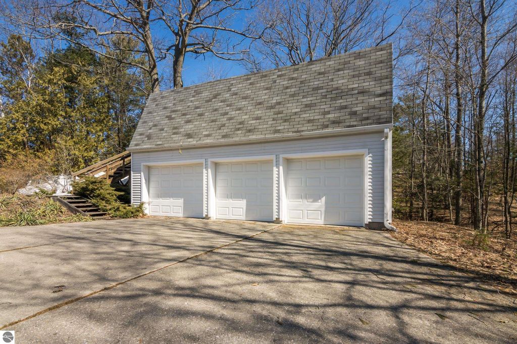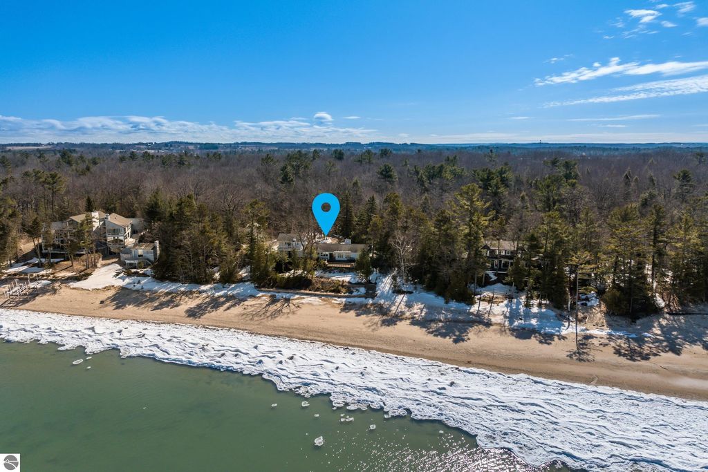 Stunning views from this charming lakeside rambler tucked into the woods just 3 miles north of Elk Rapids. Home is set on 202 feet of Grand Traverse Bay private sandy frontage. Plenty of room for family and friends in this 4 bedroom 3 bath home with two living areas plus an expansive deck that runs the entire lakeside of the house. Eat in kitchen makes the most of the space with tons of storage and wet bar and extra fridge, bar area for casual dining. Living room has a cozy fire place and plenty of room to spread out, family room also with a cozy fireplace. All living areas take full advantage of the amazing views. Split plan for bedrooms plus a primary suite upstairs with attached private bath and walk in closet.There is a 3 car detached garage with a workshop and above garage is a full finished open space. Home is being sold turnkey.
