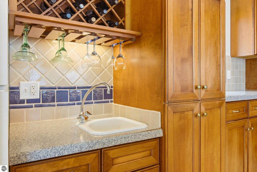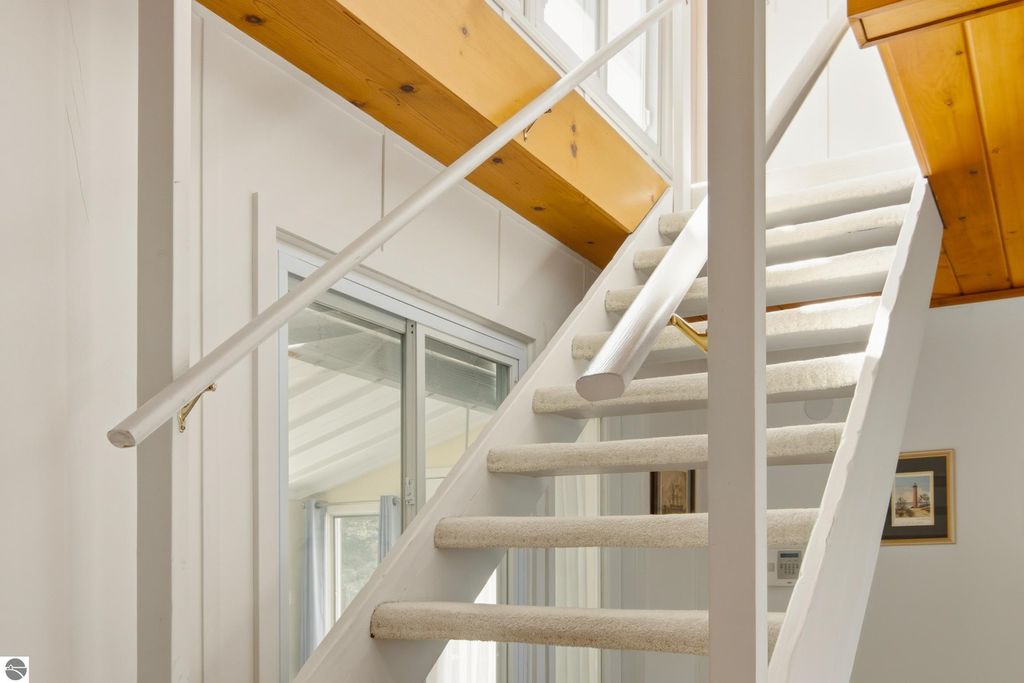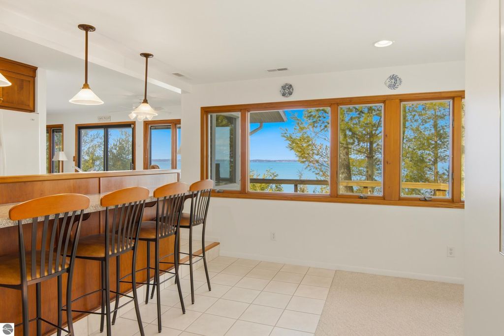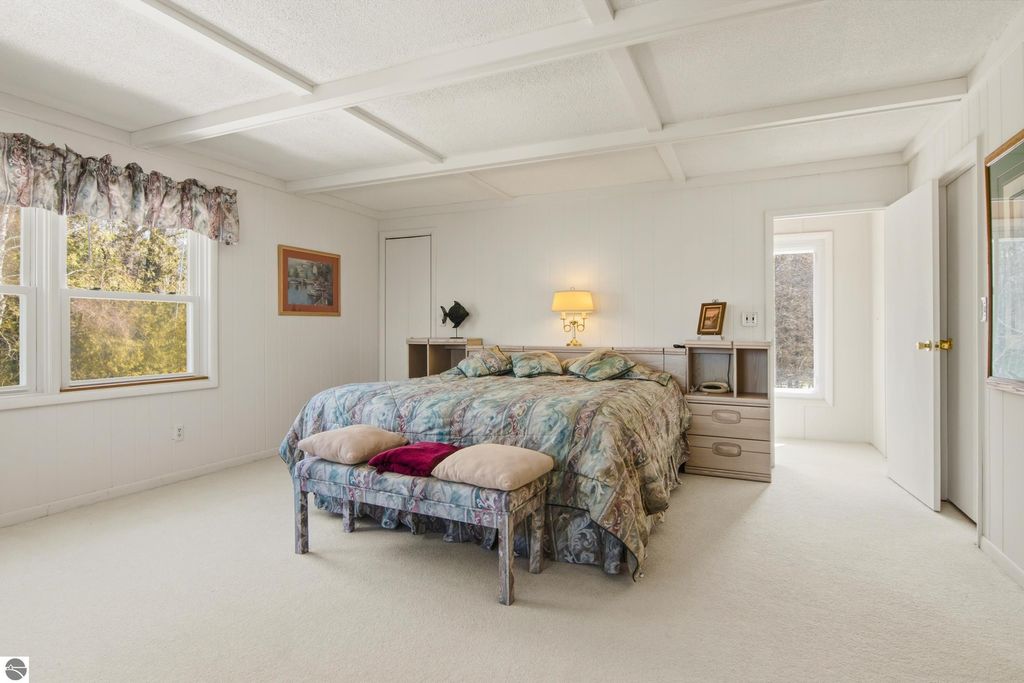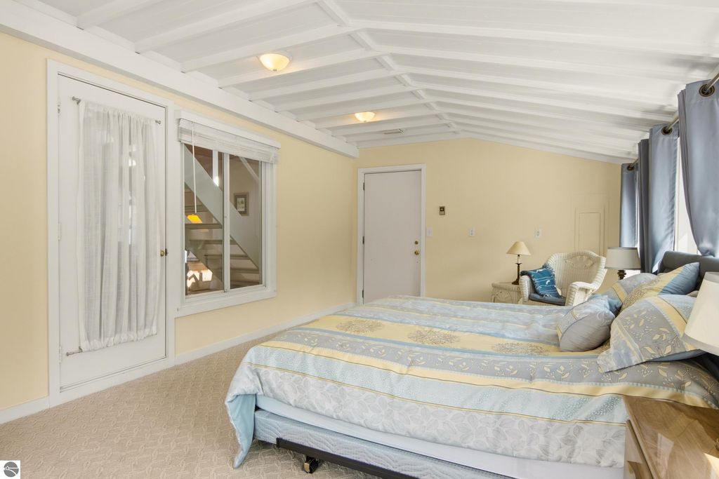 Stunning views from this charming lakeside rambler tucked into the woods just 3 miles north of Elk Rapids. Home is set on 202 feet of Grand Traverse Bay private sandy frontage. Plenty of room for family and friends in this 4 bedroom 3 bath home with two living areas plus an expansive deck that runs the entire lakeside of the house. Eat in kitchen makes the most of the space with tons of storage and wet bar and extra fridge, bar area for casual dining. Living room has a cozy fire place and plenty of room to spread out, family room also with a cozy fireplace. All living areas take full advantage of the amazing views. Split plan for bedrooms plus a primary suite upstairs with attached private bath and walk in closet.There is a 3 car detached garage with a workshop and above garage is a full finished open space. Home is being sold turnkey.