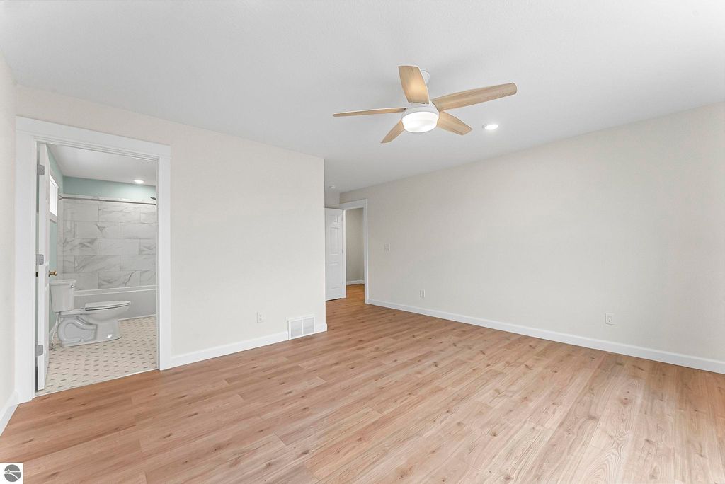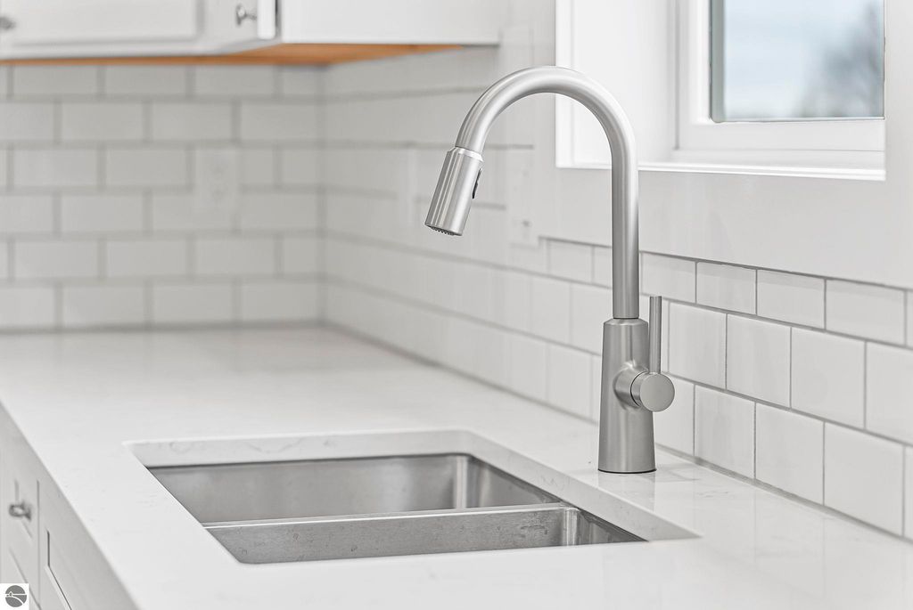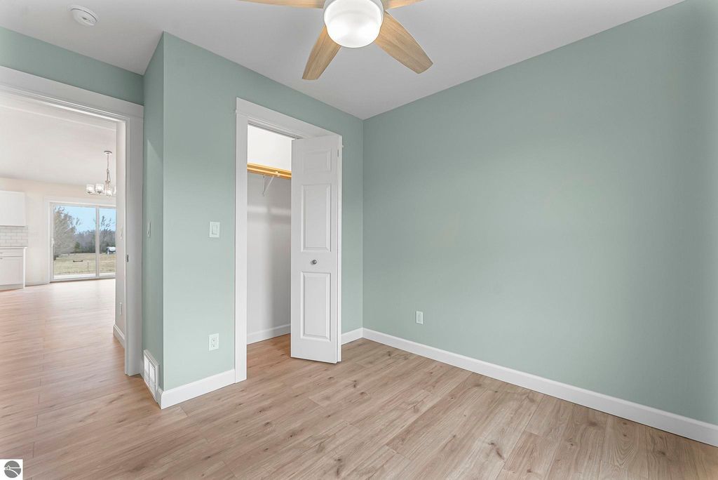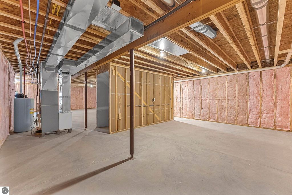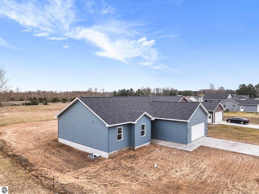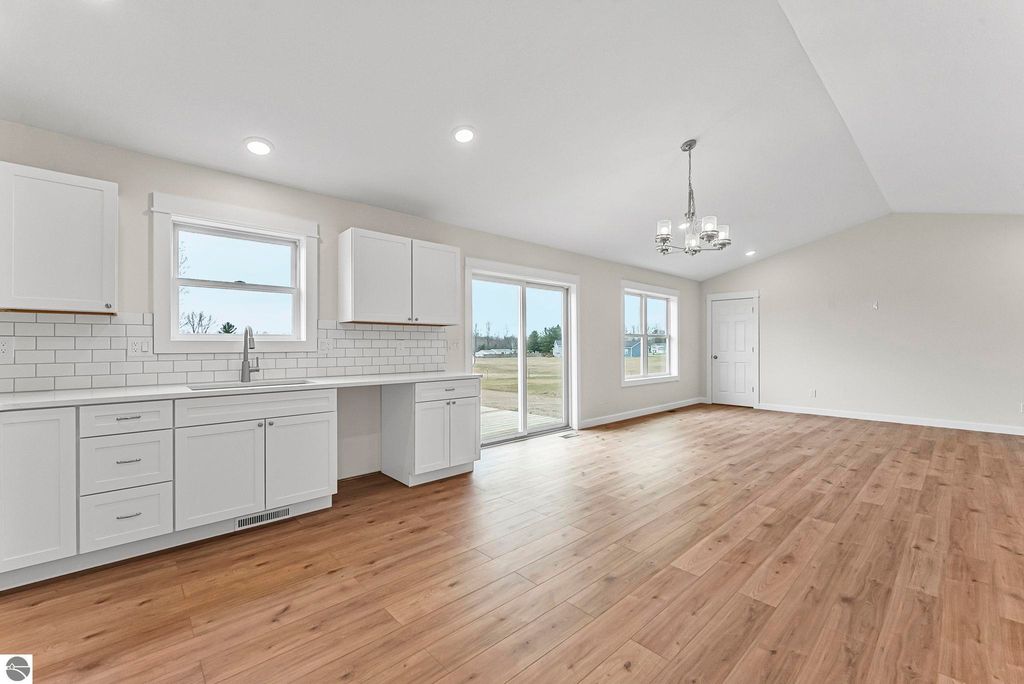 Clean lines, quality finishes, and a functional layout define this newly built ranch in Nickerson Farms. The open-concept design is highlighted by cathedral ceilings and a well-appointed kitchen featuring quartz countertops, soft-close cabinetry, and modern lighting. The adjoining dining area opens to the rear deck, extending your living space outdoors. Vinyl plank flooring flows throughout the main level for a seamless look. The primary suite includes a walk-in closet and private bath. A practical main floor laundry/mudroom connects to the finished two-car attached garage. The full lower level is ready for future expansion or storage. Central air and natural gas add to the home's efficiency and comfort. Convenient location close to parks, schools, shopping, and a short drive to Traverse City.