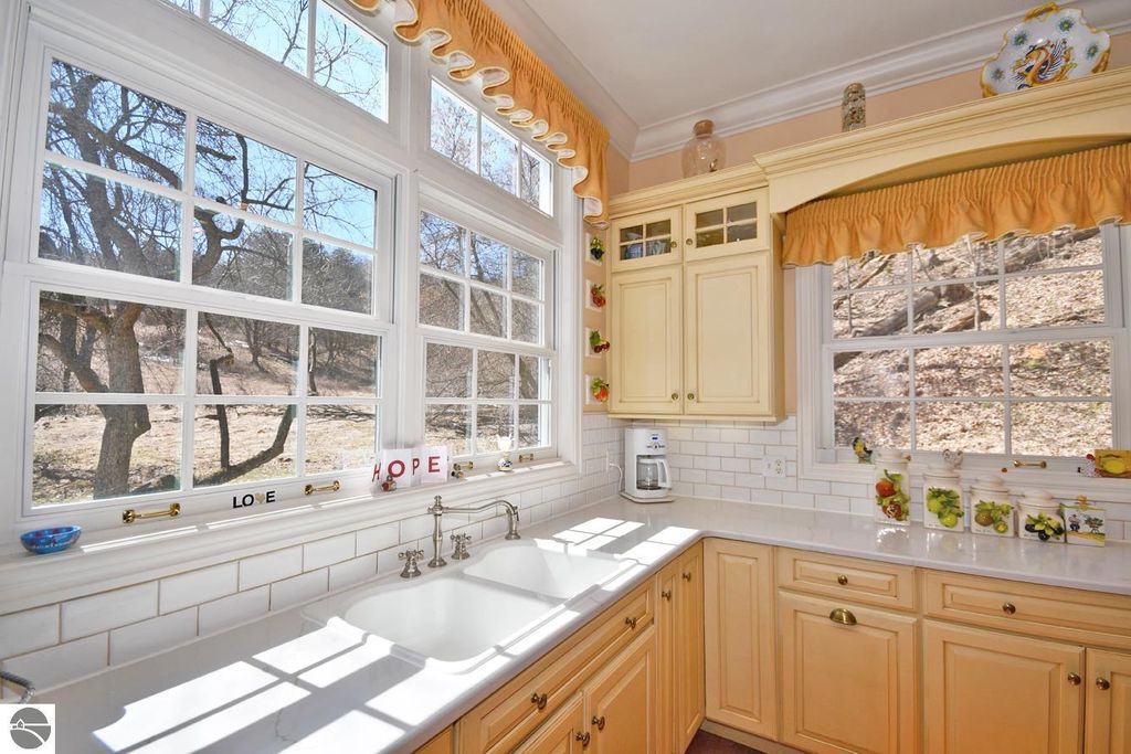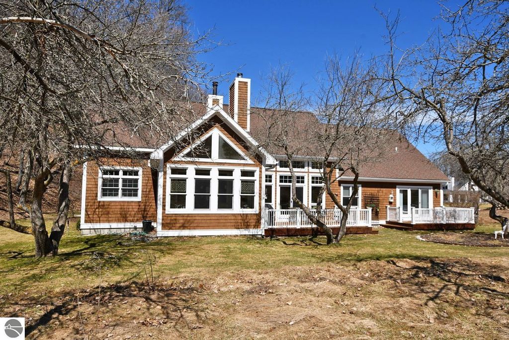A truly well-built, custom home with an exceptional eye to detail! This charming and genuinely lovely Cape Code style home will win you over with its covered front porch and tucked away, cul-de-sac setting before you even enter the front door. 11001 Pitch Apple is located in downtown Empire, near the famed Empire Beach, but is just enough on the outskirts that it's situated amongst orchards and adjoins national parkland, making it private, peaceful, and a true oasis. With four bedrooms (one being used as an office), three and one half bathrooms, an attached two car garage, a large, unfinished basement (that has been partially finished with an additional bathroom), there's ample space to breathe, spread out, and take in the stunning views. So much was gracefully considered when this home was built! Light flooding in to a cheerful, yellow kitchen with corner windows that frame the view, a very expansive family room, dining room, three season sunroom and office all adjacent to the kitchen and accessed by a mudroom space and laundry room area off the garage. Also located on this main floor is a formal living room with soaring ceilings, beautiful crown moulding detail, a two sided gas fireplace, powder room, primary bedroom with en suite bath and its own deck overlooking the orchard, as well as two other bedrooms and an additional full bathroom. This home was also built with central heat and air, is on natural gas, Empire town water, and its own, private septic system. There's even a full-house generator! Two back decks, one off the primary bedroom, and one of the living room space, offer outdoor dining, grilling and lounging. In the attached, two car garage, there is even a golf cart alcove (or as the owners affectionately call it, a "beach cart" alcove). Close to incredible beaches (Empire and Esch), hiking, biking, cross country skiing, shops, dining, inland lakes, Glen Lake, Glen Arbor, Traverse City, and more! Sold furnished with some exceptions.