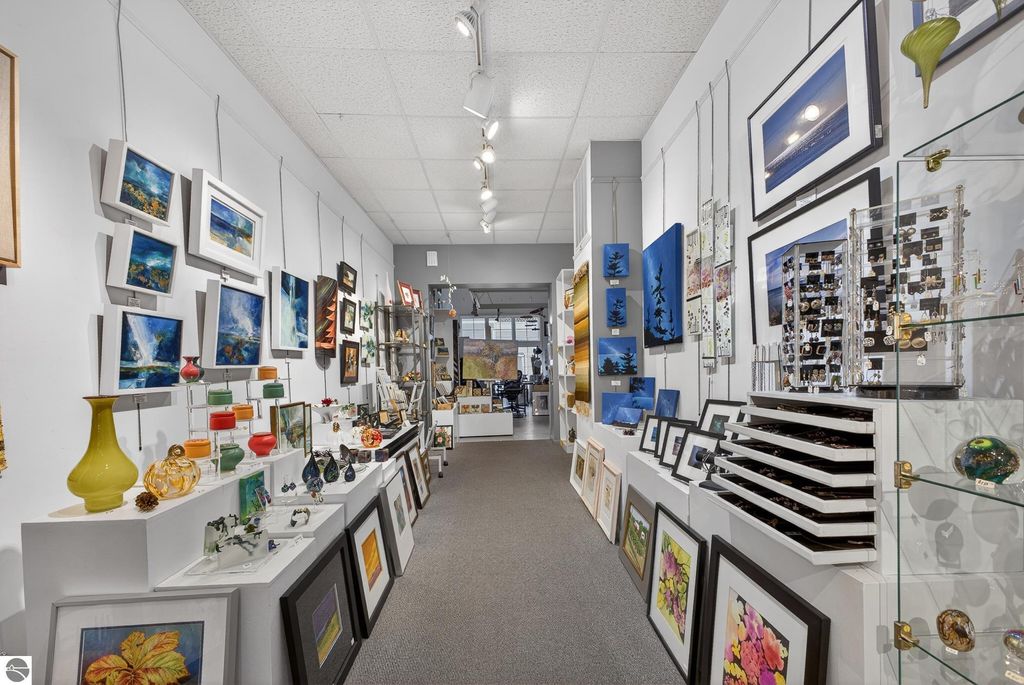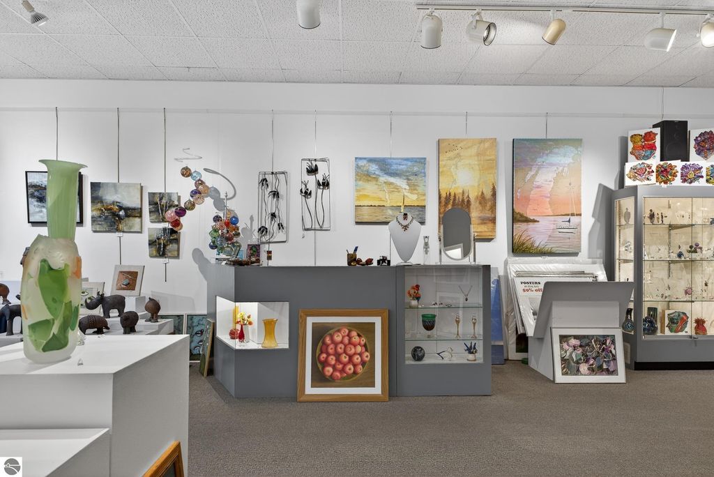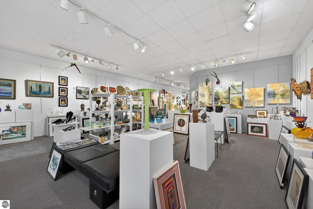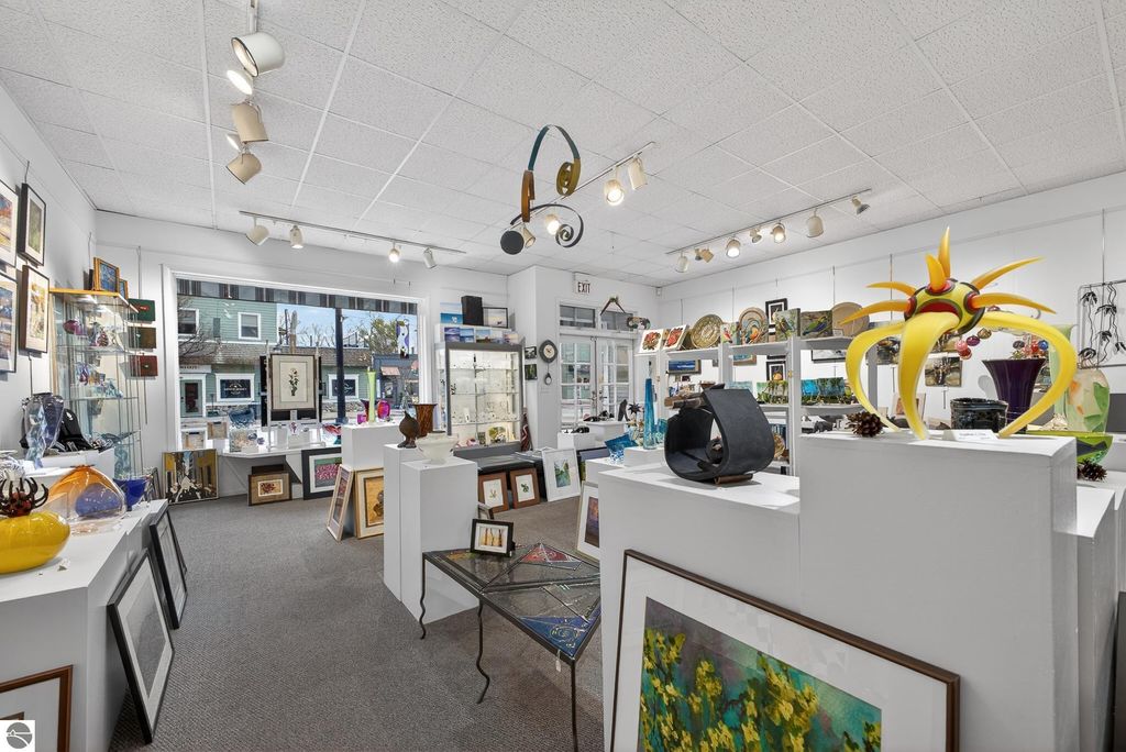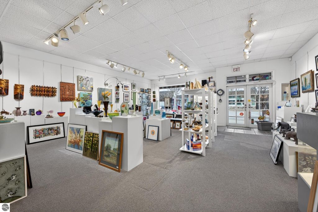 Unique mixed-use opportunity in the heart of downtown Elk Rapids, Michigan, conveniently located near the harbor. Originally constructed circa 1948 as a bank, this distinctive property blends historic character with comfortable residential living. The upper level features a thoughtfully designed owner's residence offering generous and flexible space, including a primary suite with jetted tub and walk-in closet, a large guest bedroom, and a den suitable for a variety of uses, including a potential non-conforming third bedroom. The residence includes a wood-burning fireplace and a spacious private deck, ideal for outdoor living, with gorgeous harbor views. The main level offers additional space currently used as a gallery, showcasing artwork from over 200 fine artists and craftsmen from across North America. The space features a second wood-burning fireplace and retains unique architectural elements, including the original bank vault, adding to the property's character. To maintain privacy and professional standards, the property is shown by appointment only. Prospective buyers can review local zoning details via the Elk Rapids Village website to explore the full potential of this location.