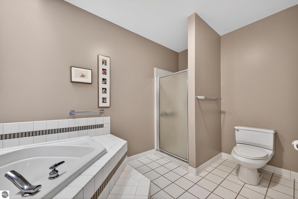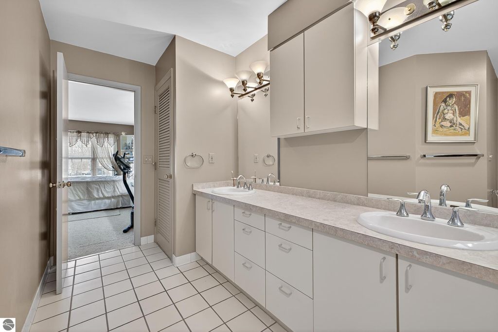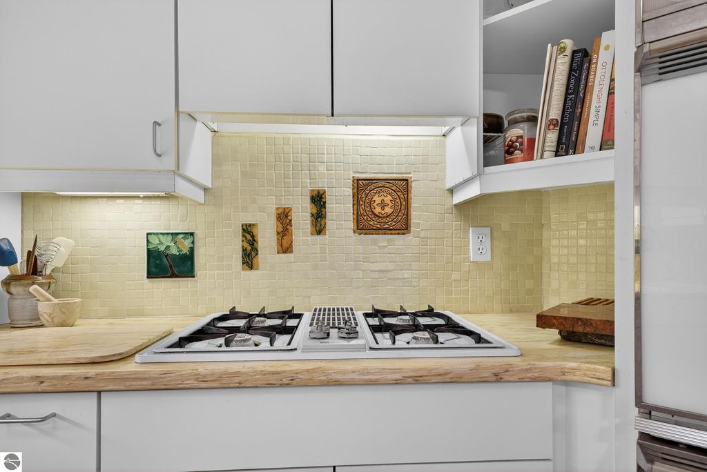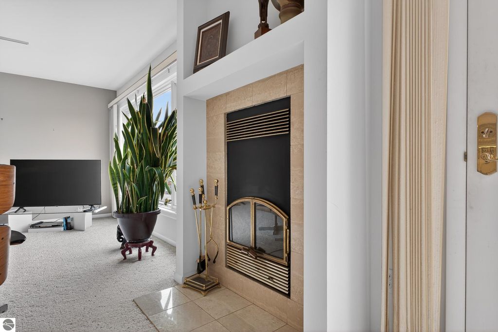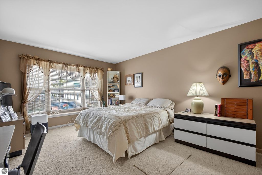 Unique mixed-use opportunity in the heart of downtown Elk Rapids, Michigan, conveniently located near the harbor. Originally constructed circa 1948 as a bank, this distinctive property blends historic character with comfortable residential living. The upper level features a thoughtfully designed owner's residence offering generous and flexible space, including a primary suite with jetted tub and walk-in closet, a large guest bedroom, and a den suitable for a variety of uses, including a potential non-conforming third bedroom. The residence includes a wood-burning fireplace and a spacious private deck, ideal for outdoor living, with gorgeous harbor views. The main level offers additional space currently used as a gallery, showcasing artwork from over 200 fine artists and craftsmen from across North America. The space features a second wood-burning fireplace and retains unique architectural elements, including the original bank vault, adding to the property's character. To maintain privacy and professional standards, the property is shown by appointment only. Prospective buyers can review local zoning details via the Elk Rapids Village website to explore the full potential of this location.