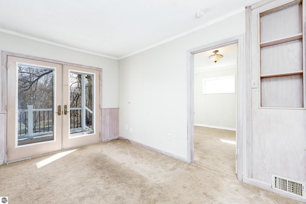 Welcome to this inviting 3-bedroom, 2.5-bath ranch-style home ideally located just off the iconic M-22 drive, only minutes from downtown Frankfort and perfectly situated between Crystal Lake and Lake Michigan. Set on over five acres of beautifully wooded land, this property offers a private and serene setting complete with mature trees and a peaceful creek flowing through the landscape. The outdoor living space is truly a highlight, featuring an expansive deck and a large fire pit perfect for entertaining or relaxing on long summer evenings surrounded by nature. Inside, the home offers a comfortable and functional layout with all living spaces conveniently located on the main floor. A welcoming sitting room flows seamlessly into the kitchen and dining area, which opens directly to the back deck for easy indoor-outdoor living. The primary bedroom includes a private full bath, while two additional guest bedrooms, one with its own half bath, provide flexibility for family or visitors. This home presents an excellent opportunity for a new owner to bring their vision and personal style, with strong potential for value growth through cosmetic updates and improvements. Enjoy the convenience of being just a short distance or even a walk into downtown Frankfort, where you'll find charming shops, restaurants, schools, a hospital, access to Lake Michigan, and the scenic Betsie Valley Trail winding around Betsie Bay. Nearby attractions include a variety of hiking and bike trails along the lakeshore, Crystal Downs Country Club, Point Betsie Lighthouse, and the renowned Sleeping Bear Dunes National Lakeshore, as well as the charming villages of Beulah, Empire, and Glen Arbor. Experience the best of Northern Michigan living in a location that truly has it all natural beauty, recreation, and small-town charm.