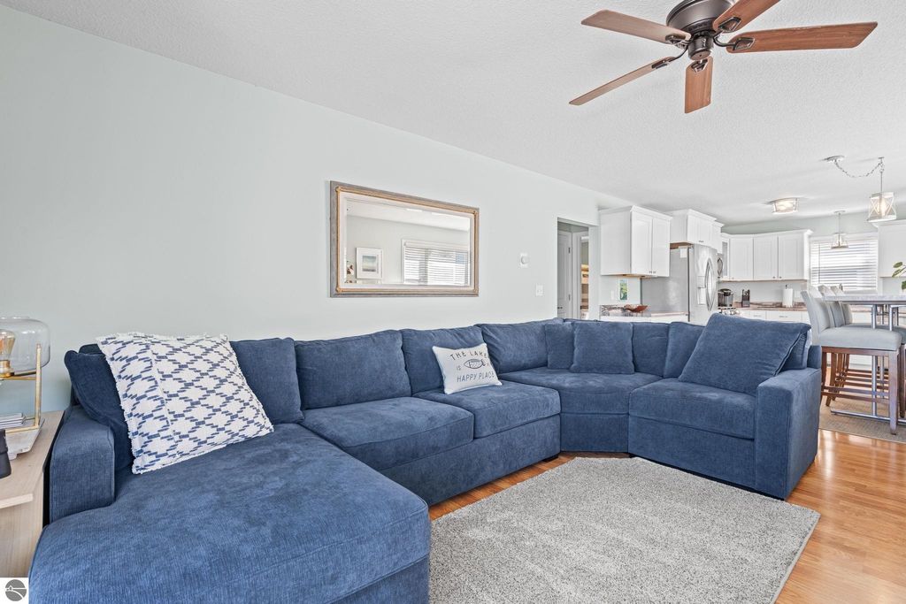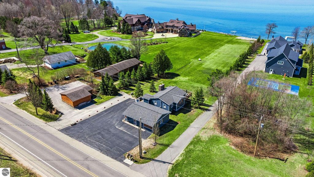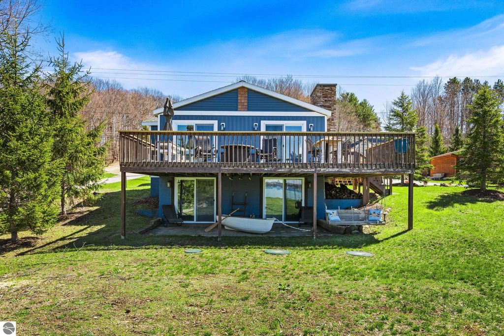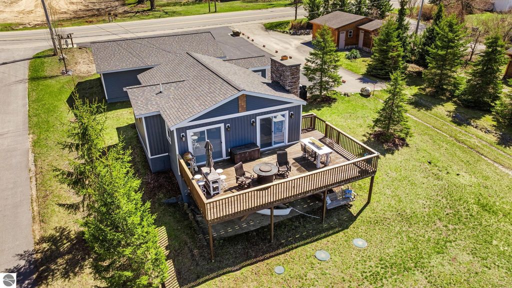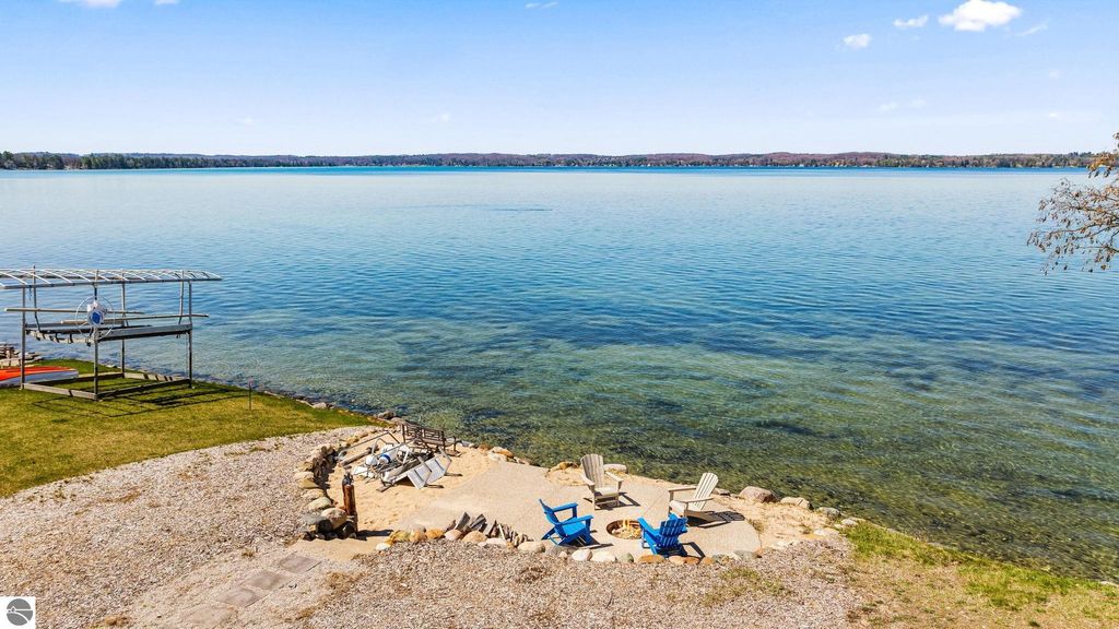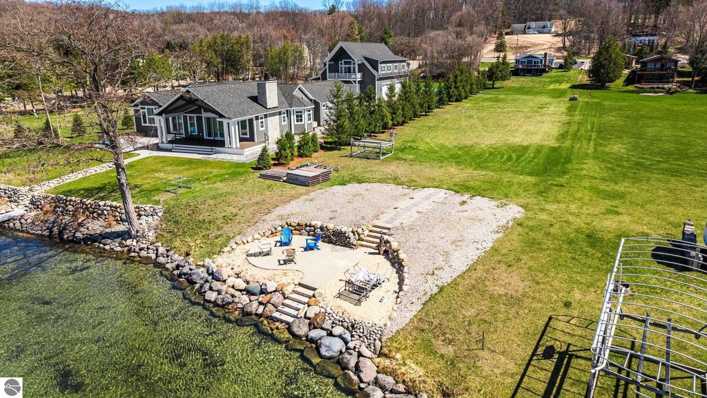 Just in time for summer! 80' of sandy Torch Lake frontage on nearly one acre at the highly sought-after south end. Completely updated, this turn-key 3-bedroom, 2-bath lake house features a walkout lower level and an open floorplan centered on a wood-burning fireplace - ready for you to move in and start enjoying lake life immediately with the septic, roof, siding, windows and furnace all new within the last 10 years. The beautiful shoreline improvements include a riprap wall of large boulders and an aggregate stone patio with fire pit, perfect for entertaining or relaxing by the water. Use the existing home as an ideal up-north getaway, or take advantage of the oversized lot to design your dream lakefront residence and convert the current house into a guest cottage. located in a short-term-rental friendly township and with a previous history of successful rentals, there is also a potential revenue stream if desiredl. A detached 3-car garage provides ample storage for all your toys. Surrounded by high-end estates, the location is unmatched. You're just a short boat ride to Torch Lake's famous south-end sand bar or head north by boat for lunch at Dockside. Less than 1/4 mile from downtown Alden, you can walk or bike into town for dinner, drinks or shopping. Estate-sized lakefront lots like this are increasingly rare. Don't miss this exceptional opportunity!