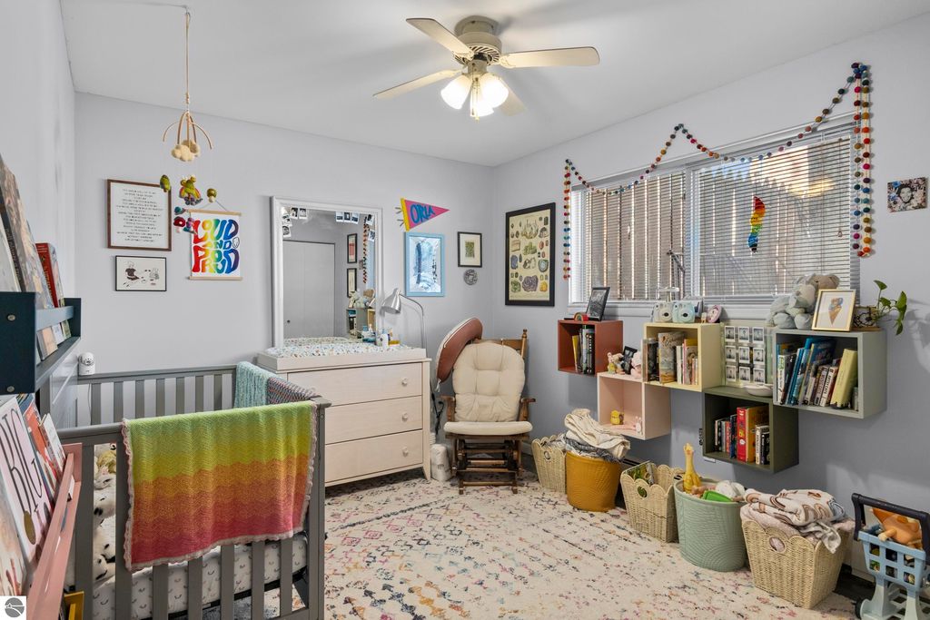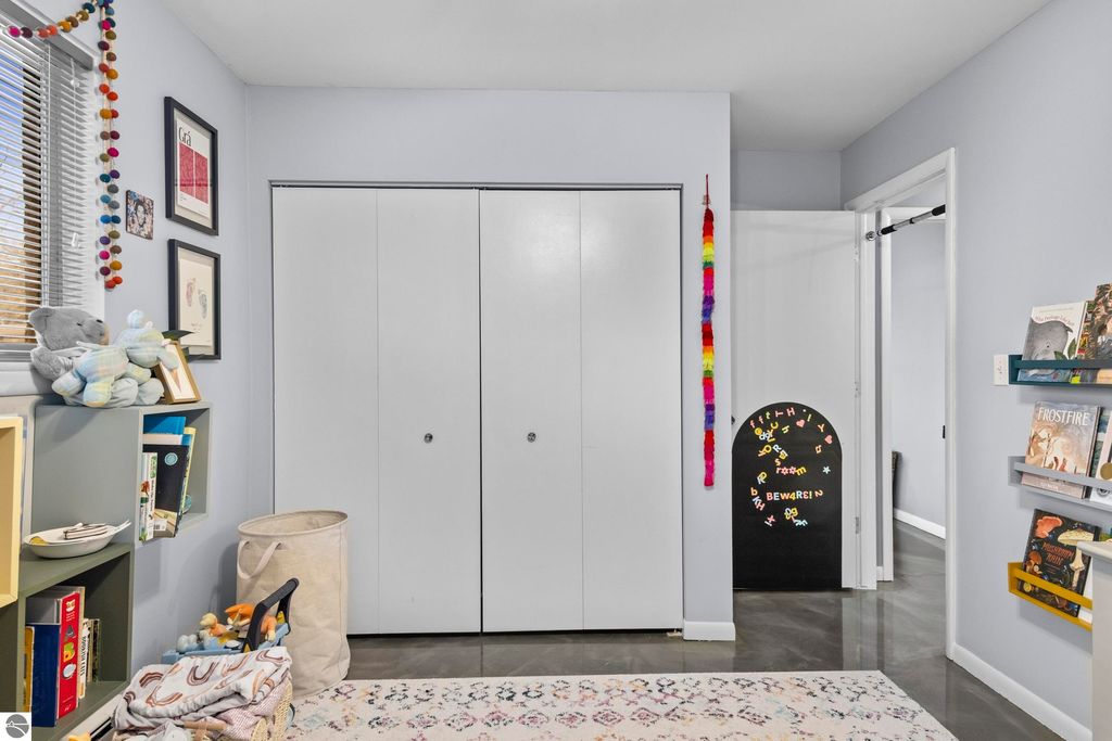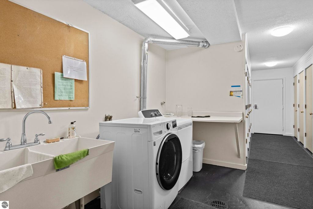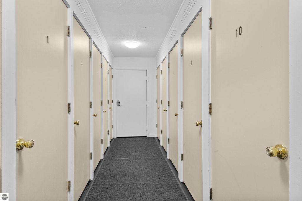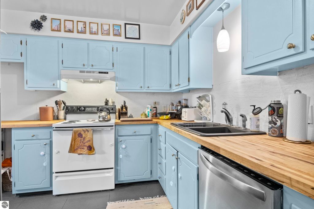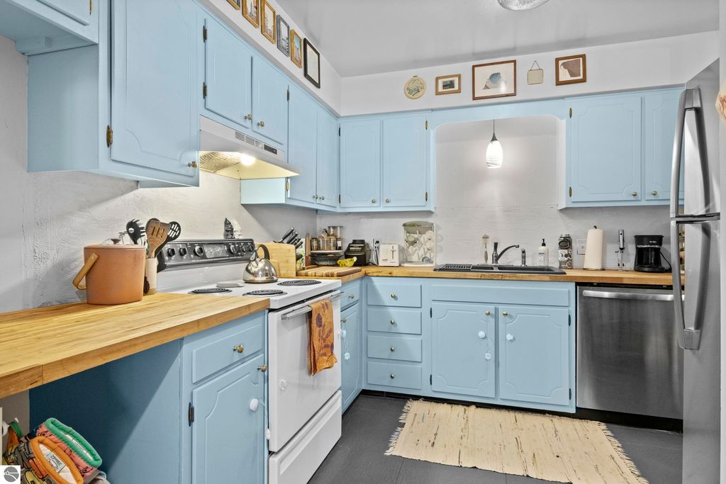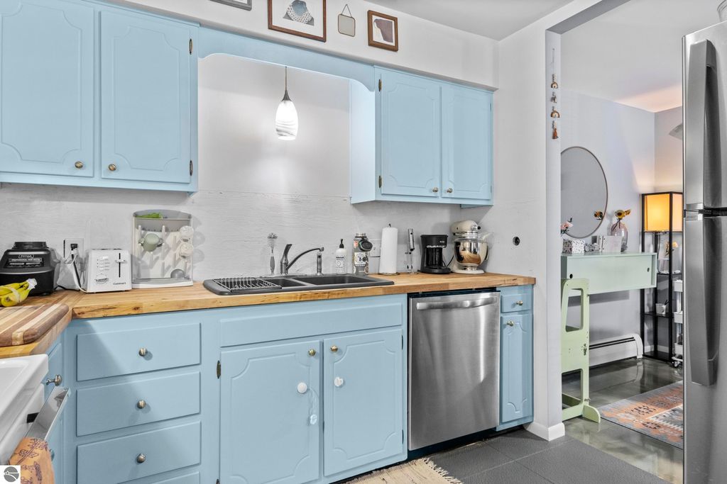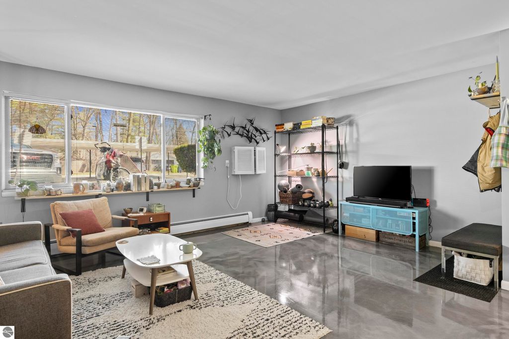 Welcome to this stylish and conveniently located 2-bedroom, 1-bath condo in beautiful Traverse City! Offering 896 square feet of thoughtfully designed living space, this home features sleek epoxy flooring throughout for a modern, low-maintenance finish. The updated kitchen is equipped with stainless steel appliances, including a dishwasher and refrigerator, complemented by warm butcher block countertops that add both function and character. The open layout makes the space feel bright and inviting"”perfect for everyday living or a weekend getaway. Enjoy the convenience of an assigned covered carport space, along with shared laundry facilities located in the lower level. Association dues cover exterior maintenance, water, sewer, lawn care, as well as trash and snow removal. Location is everything, and this condo delivers"”just a short walk to both East and West Grand Traverse Bay access points, and directly across from the Civic Center and park area. With easy access to M-31, you're perfectly positioned to enjoy all that Traverse City has to offer, from outdoor recreation to dining, shopping, and more. Whether you're looking for a year-round residence, vacation home, or investment opportunity, this condo is a fantastic find in a prime location! Sellers are taking the colored shelving in the nursery.