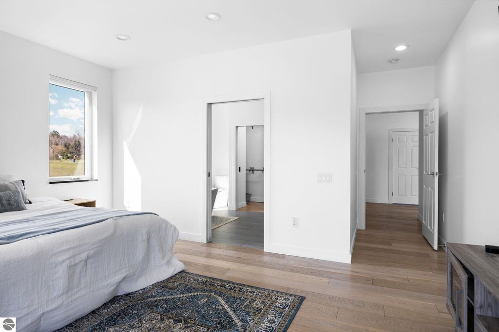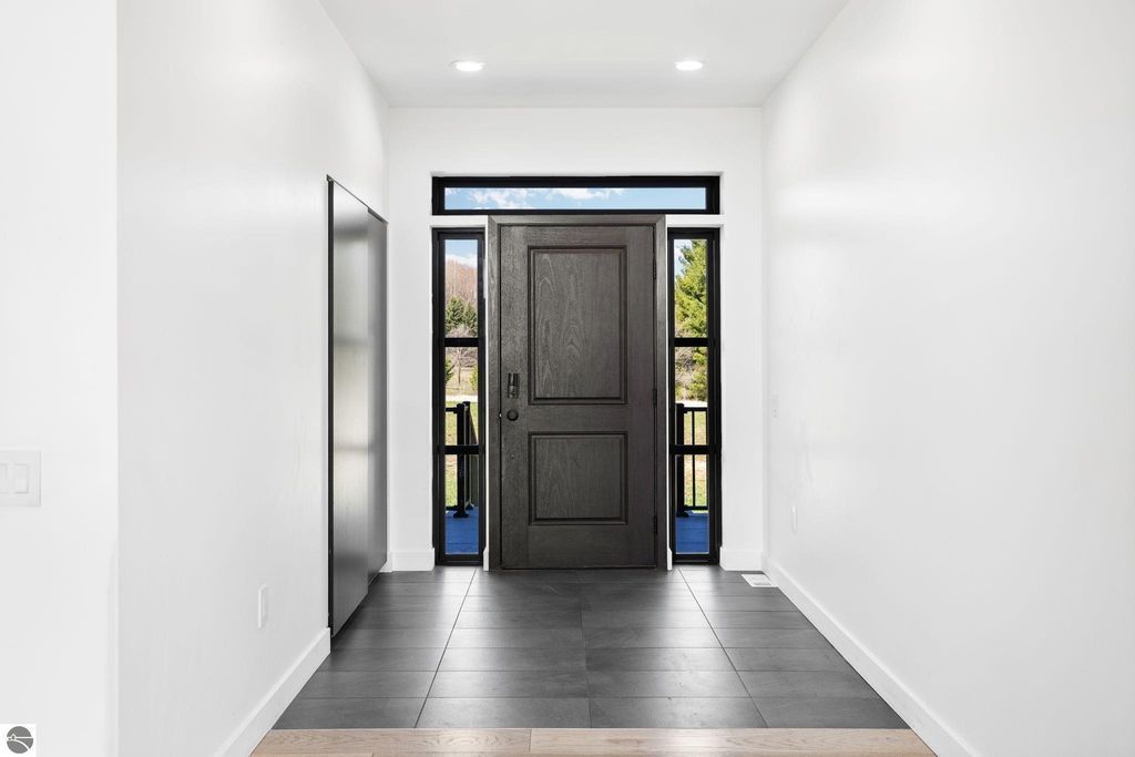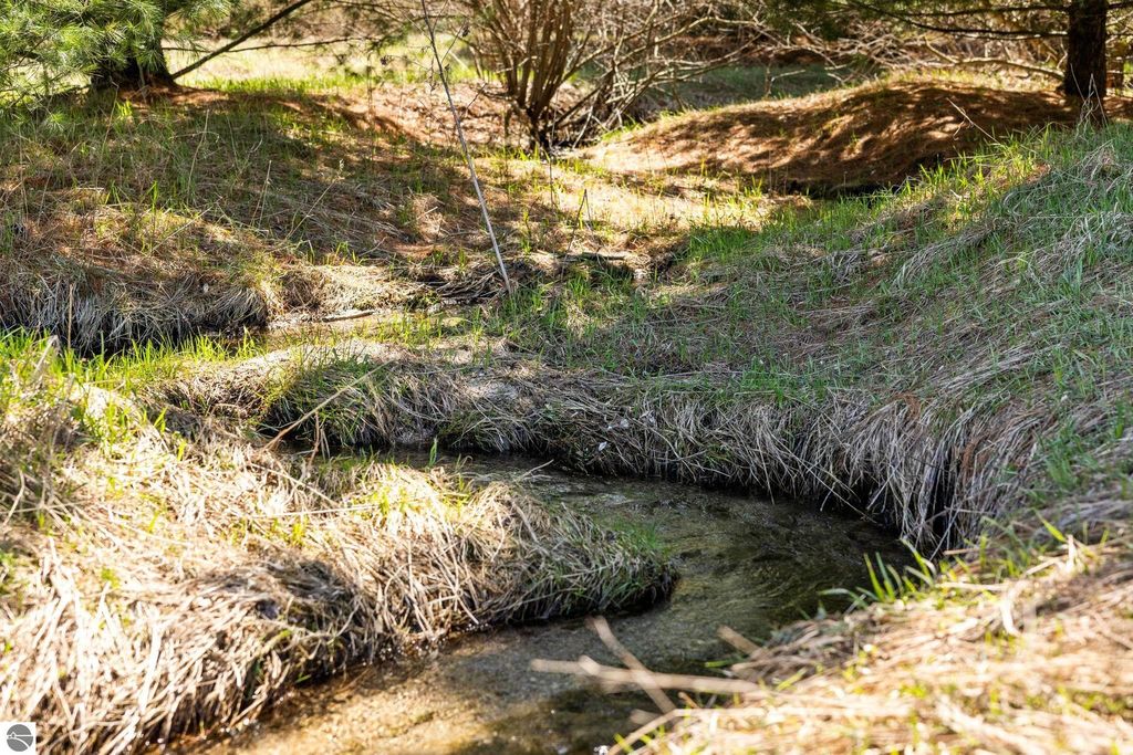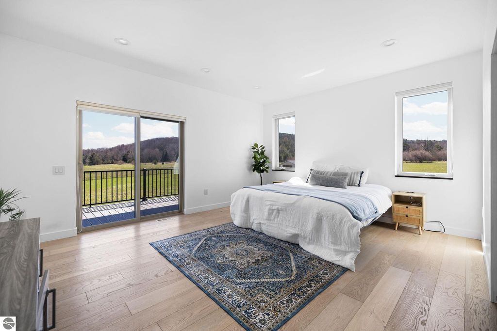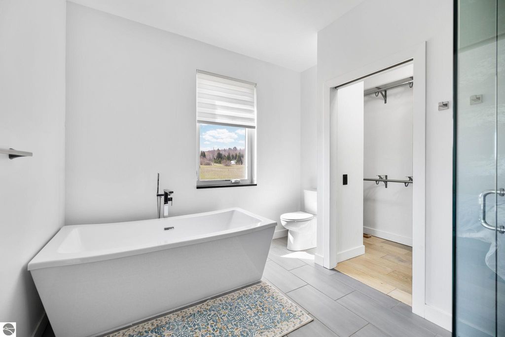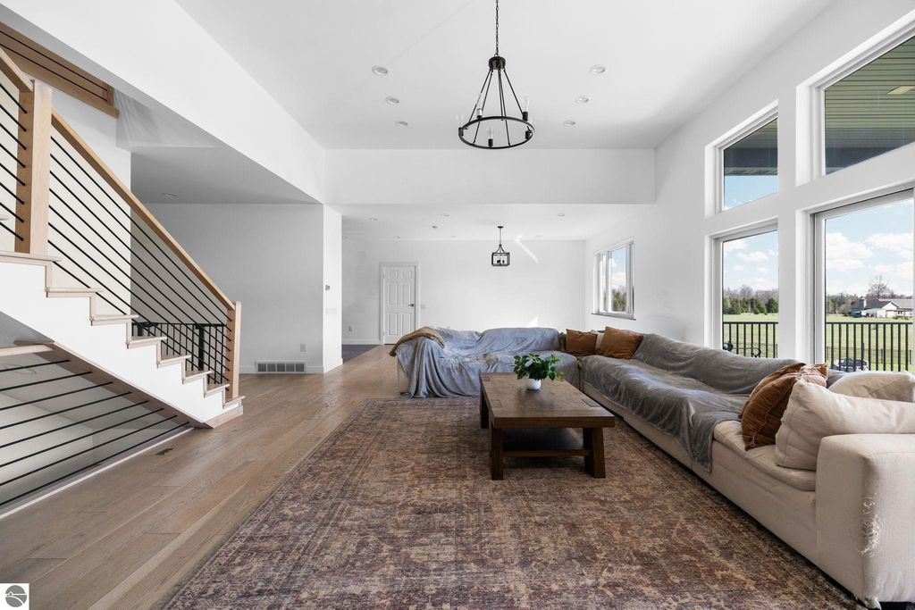 Set on five private acres just minutes from downtown Traverse City, this 2020-built home offers the kind of space, quality, and natural setting that's genuinely hard to find in Northern Michigan. A creek winds through the southeast corner of the property, and the covered back deck is positioned perfectly to catch morning sunrises - the kind of detail that makes a house feel like a place you never want to leave. Inside, the main level spans 2,100 square feet with 12-foot ceilings, an open concept layout, and engineered hardwood floors throughout. The living room anchors the space with a wood-burning fireplace and expansive windows that flood the room with natural light. The kitchen is outfitted with black stainless steel appliances, quartz countertops, lift-up cabinet doors, and a pantry - thoughtfully designed for both everyday living and entertaining. The main floor primary suite is a true retreat, complete with a soaking tub, beautifully tiled walk-in shower, and a walk-in closet. Two additional bedrooms and a full bath round out the main level. Upstairs, 1,350 square feet of additional living space includes two more bedrooms, a bathroom, a dedicated office, and a bonus room with 8-foot ceilings throughout. The 2,000-square-foot unfinished basement is already plumbed for a kitchen, bathroom, and sauna - a blank canvas with serious potential for additional living space, a guest suite, or income-generating use. The covered back deck is fully insulated and weatherproofed, extending the living space outdoors in a way that truly works year-round. Five acres, a firepit, a creek, and a sunrise view - the outdoor experience here is exceptional. All of this, within the Kingsley School District, less than 20 minutes to downtown Traverse City and 15 minutes to shopping, dining, and everyday conveniences.