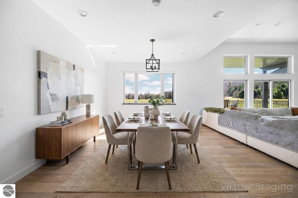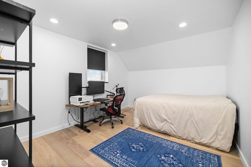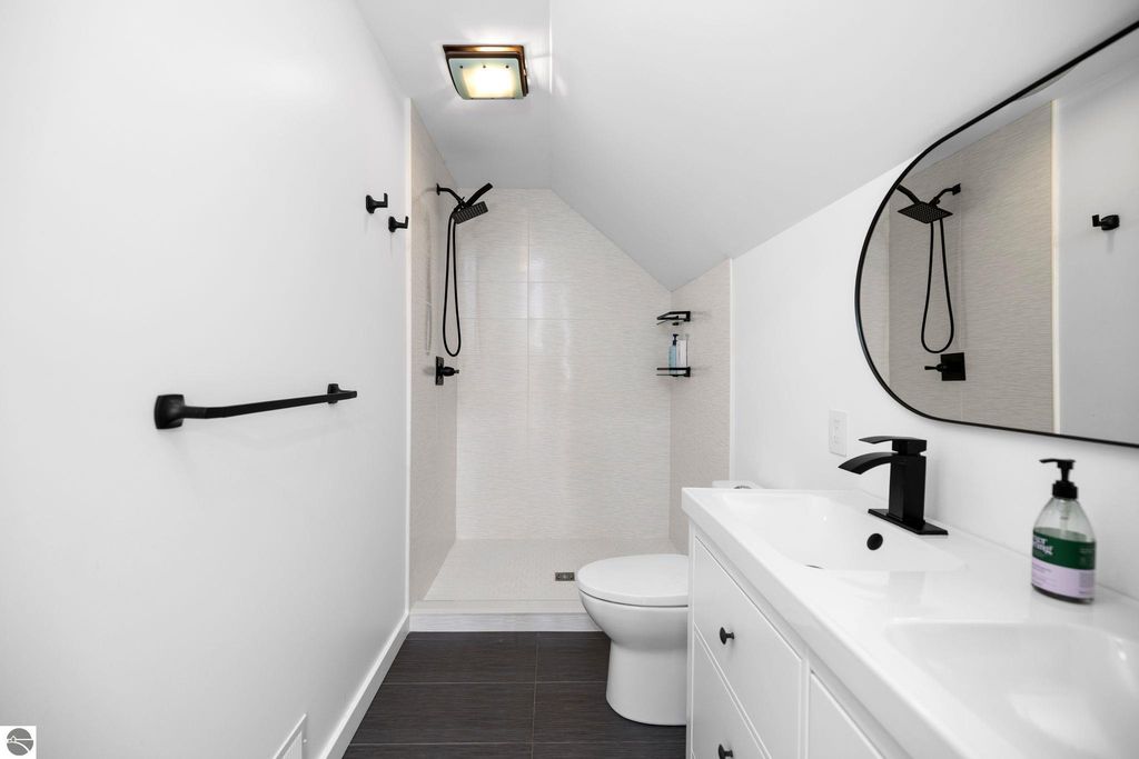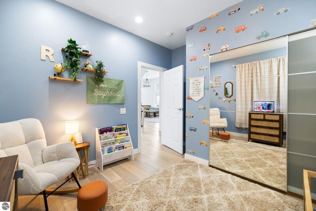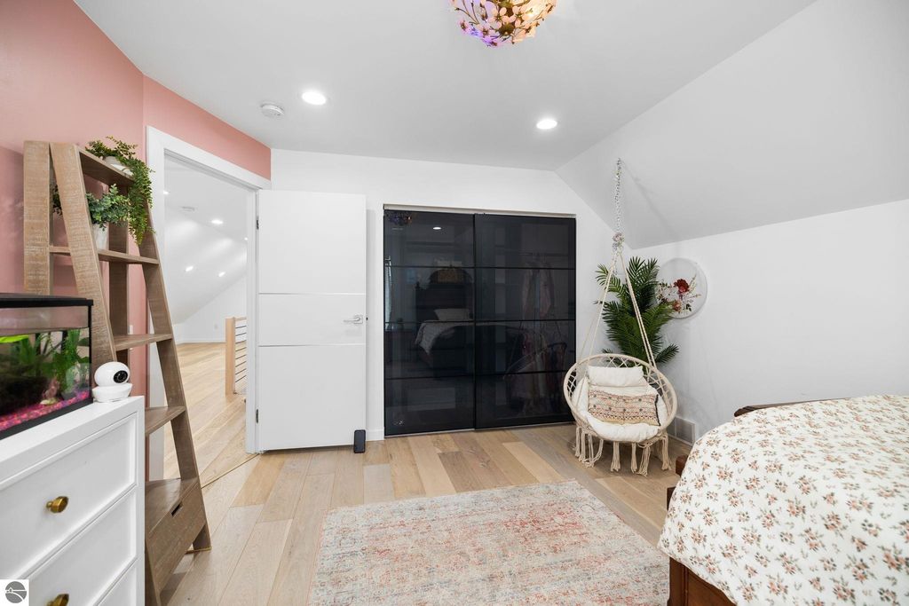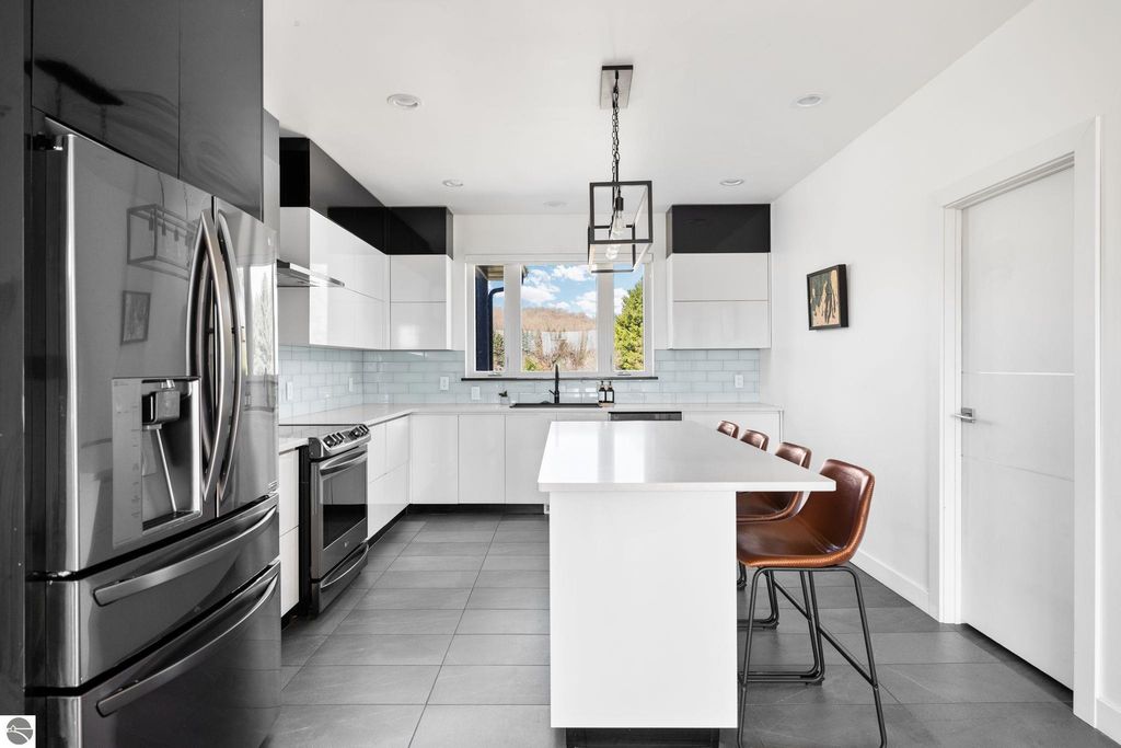 Set on five private acres just minutes from downtown Traverse City, this 2020-built home offers the kind of space, quality, and natural setting that's genuinely hard to find in Northern Michigan. A creek winds through the southeast corner of the property, and the covered back deck is positioned perfectly to catch morning sunrises - the kind of detail that makes a house feel like a place you never want to leave. Inside, the main level spans 2,100 square feet with 12-foot ceilings, an open concept layout, and engineered hardwood floors throughout. The living room anchors the space with a wood-burning fireplace and expansive windows that flood the room with natural light. The kitchen is outfitted with black stainless steel appliances, quartz countertops, lift-up cabinet doors, and a pantry - thoughtfully designed for both everyday living and entertaining. The main floor primary suite is a true retreat, complete with a soaking tub, beautifully tiled walk-in shower, and a walk-in closet. Two additional bedrooms and a full bath round out the main level. Upstairs, 1,350 square feet of additional living space includes two more bedrooms, a bathroom, a dedicated office, and a bonus room with 8-foot ceilings throughout. The 2,000-square-foot unfinished basement is already plumbed for a kitchen, bathroom, and sauna - a blank canvas with serious potential for additional living space, a guest suite, or income-generating use. The covered back deck is fully insulated and weatherproofed, extending the living space outdoors in a way that truly works year-round. Five acres, a firepit, a creek, and a sunrise view - the outdoor experience here is exceptional. All of this, within the Kingsley School District, less than 20 minutes to downtown Traverse City and 15 minutes to shopping, dining, and everyday conveniences.